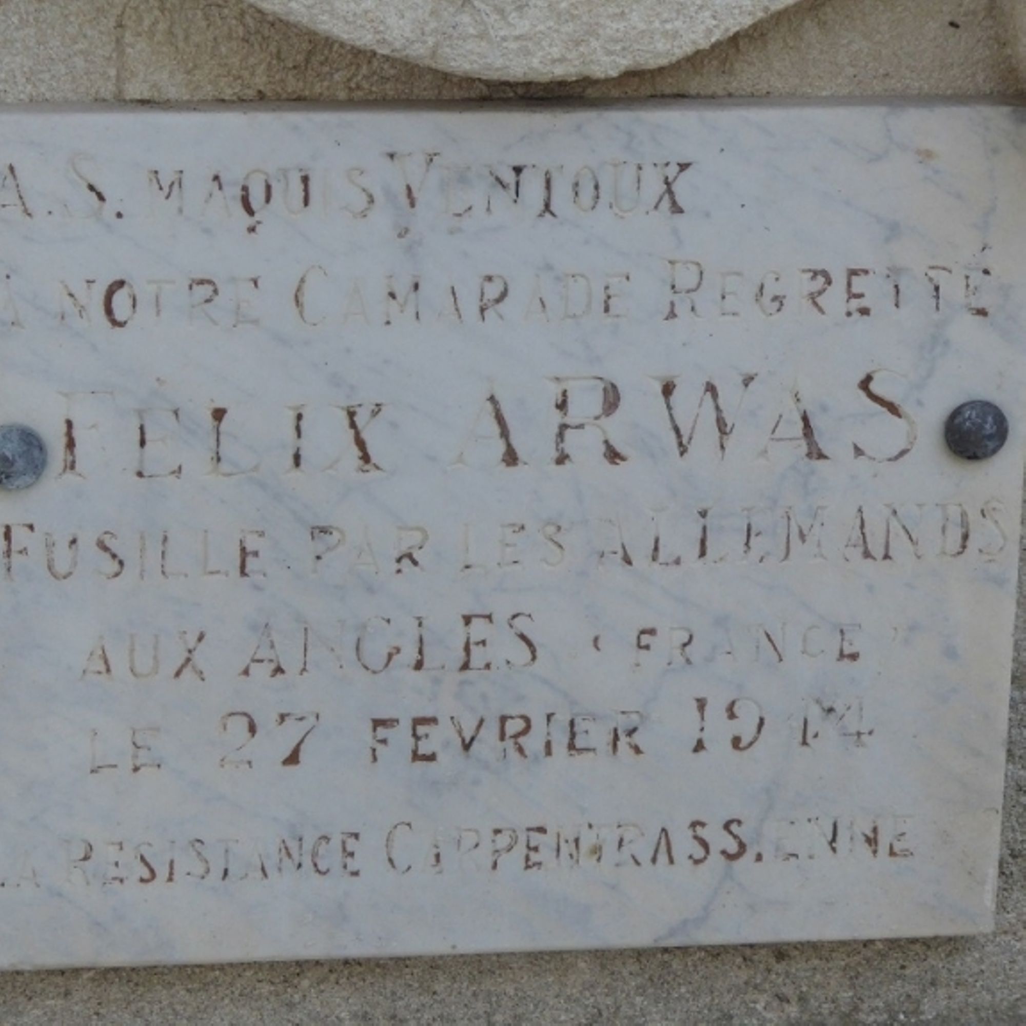 ARWAS René [Plaque Fusillé par les Allemands aux Angles le 27 février 1944]