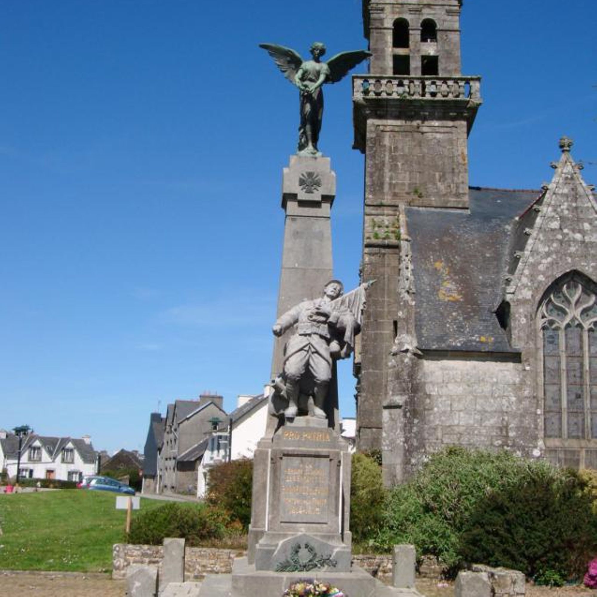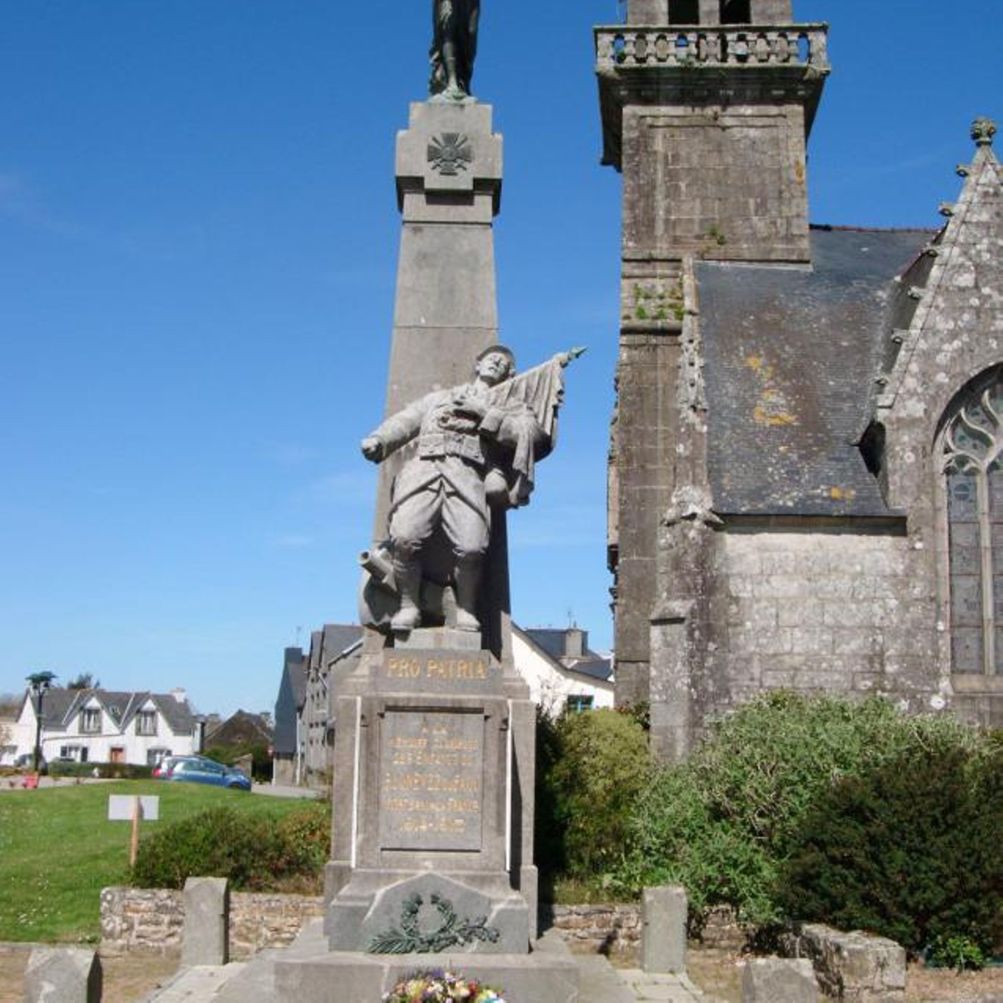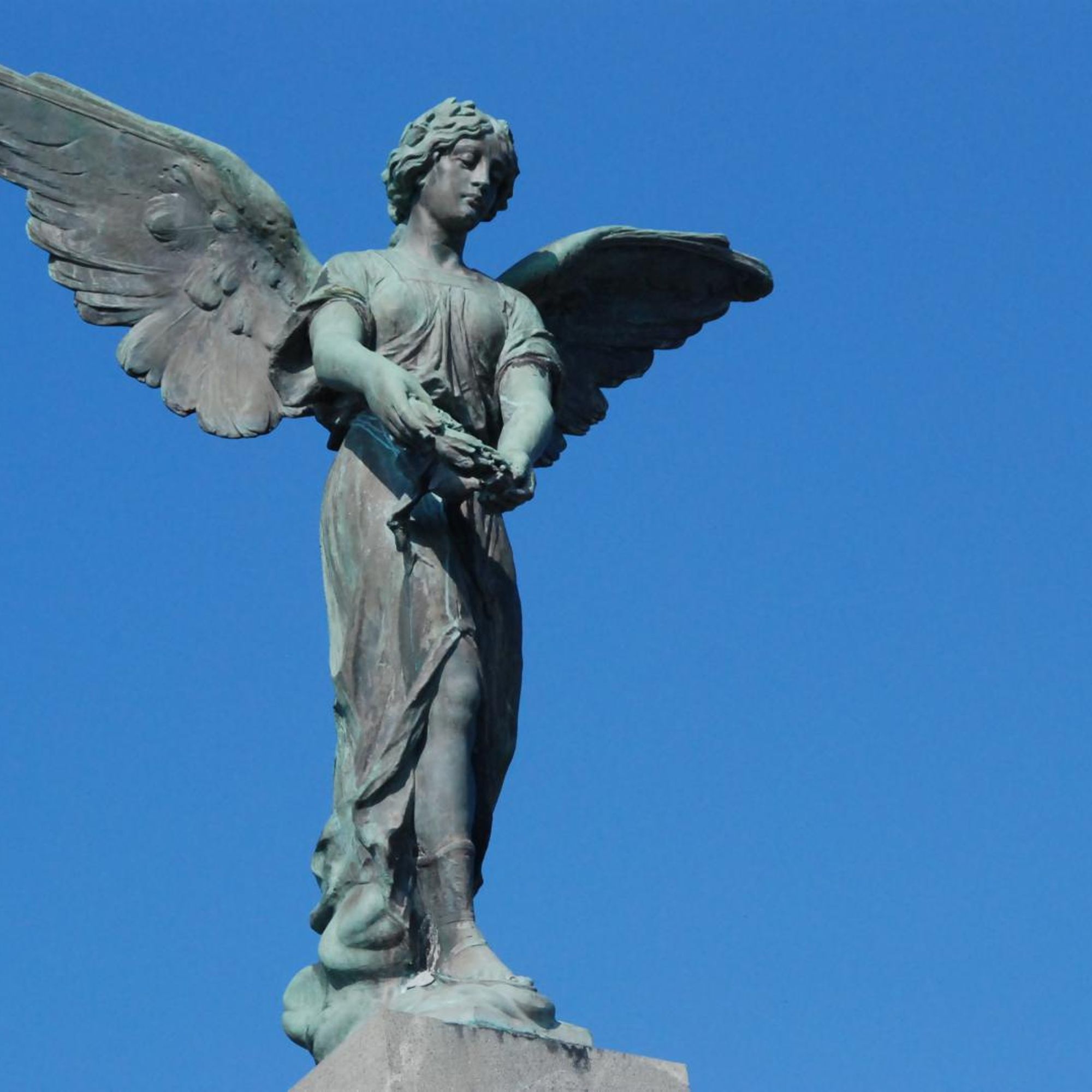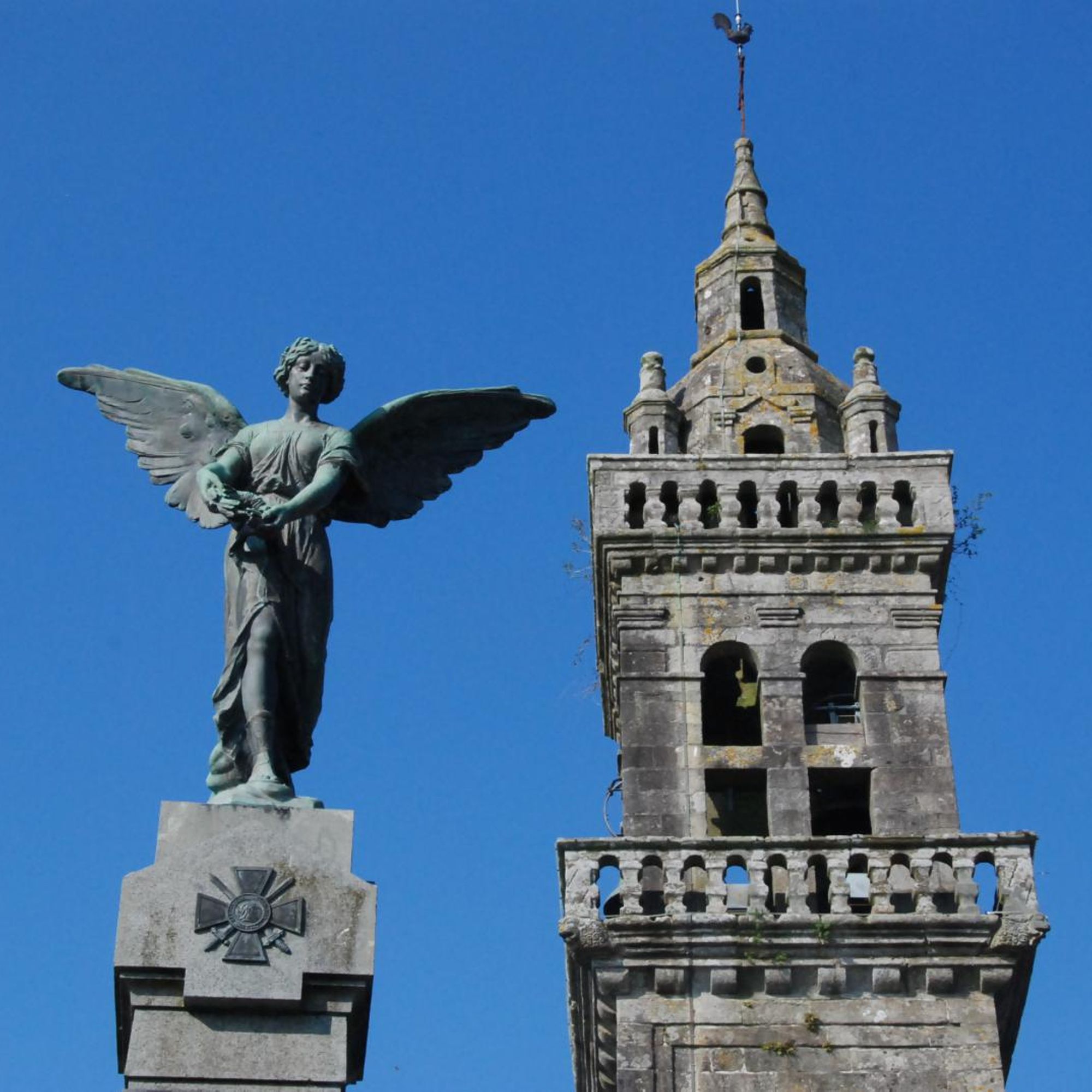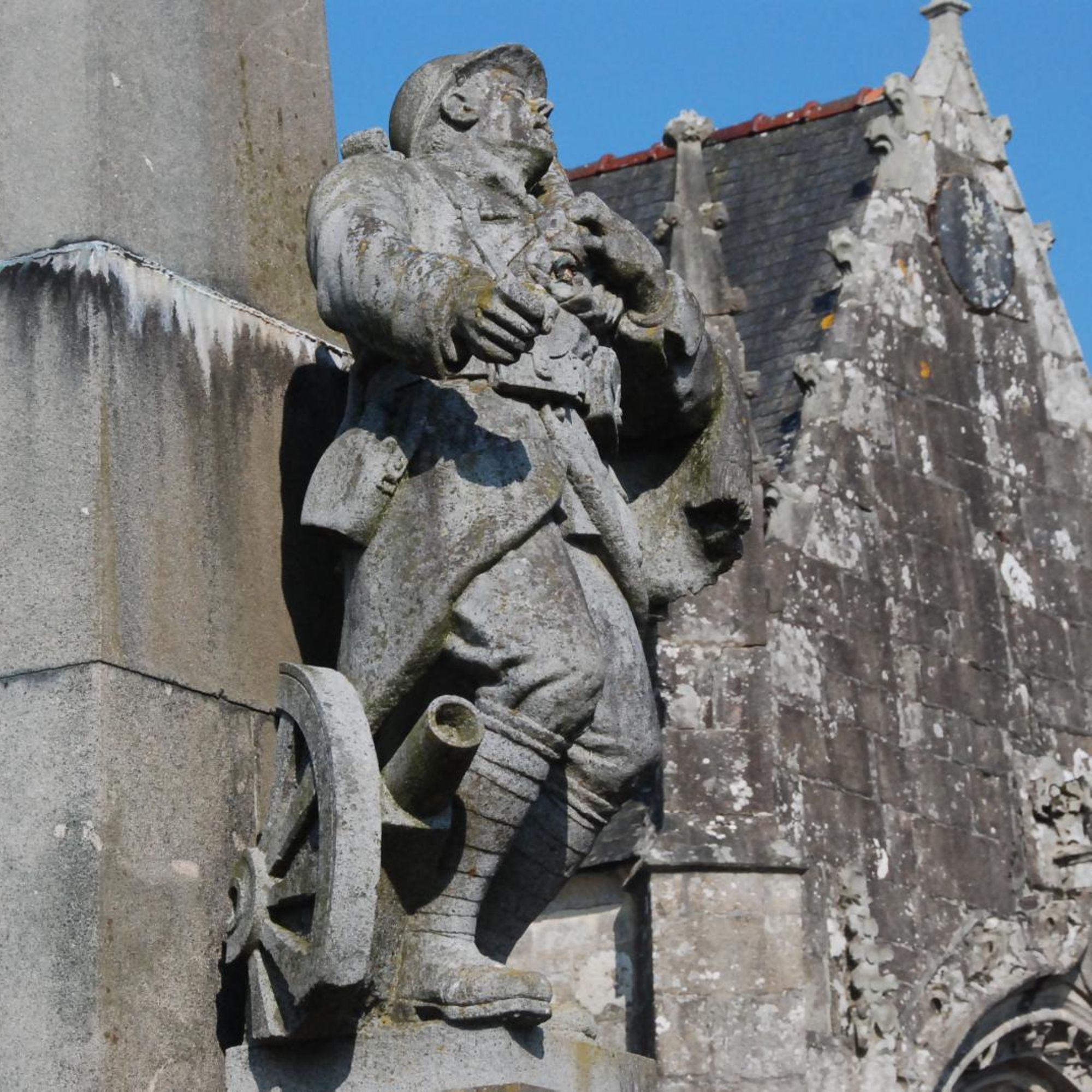 Colonne quadrangulaire avec un ange au sommet et devant un soldat défendant son drapeau