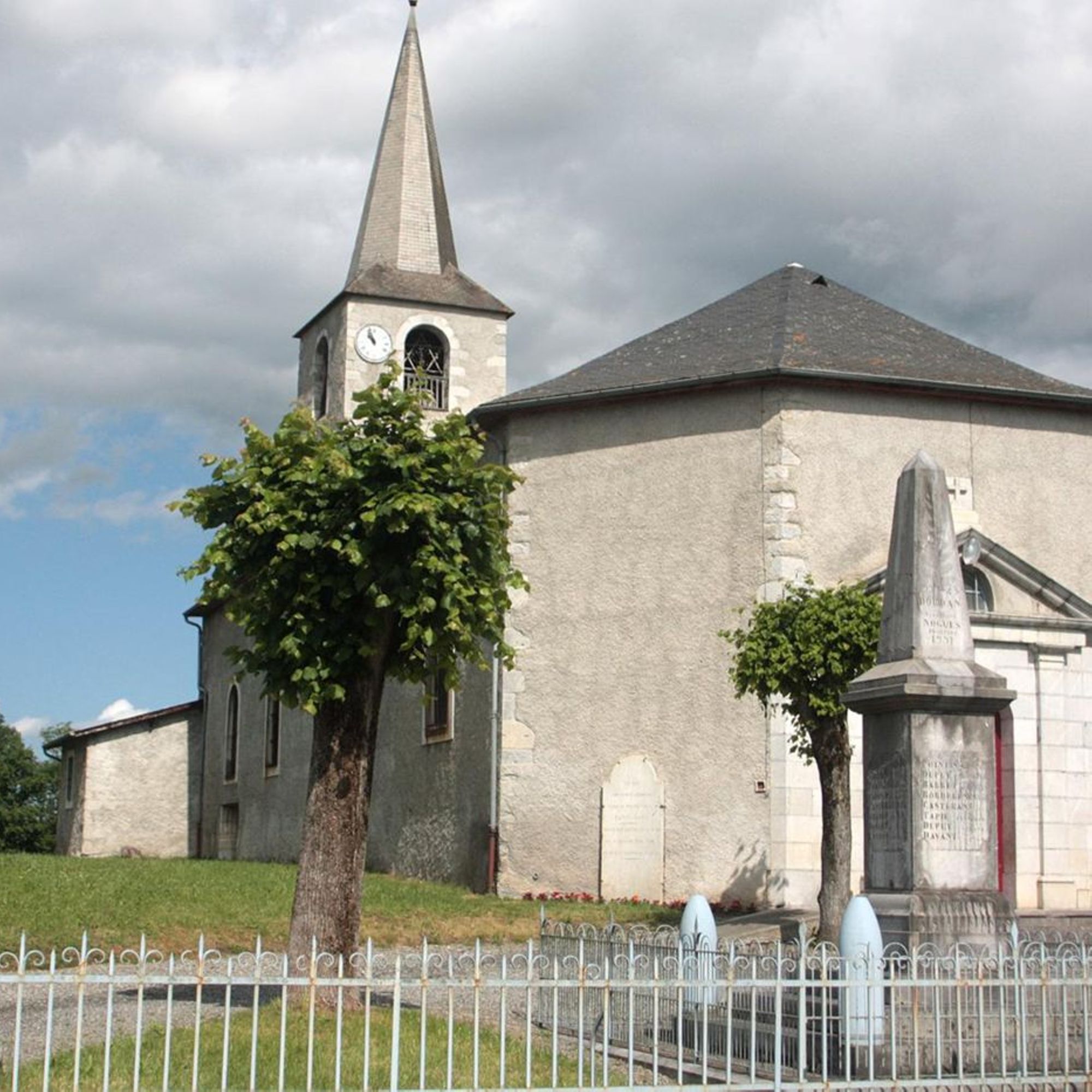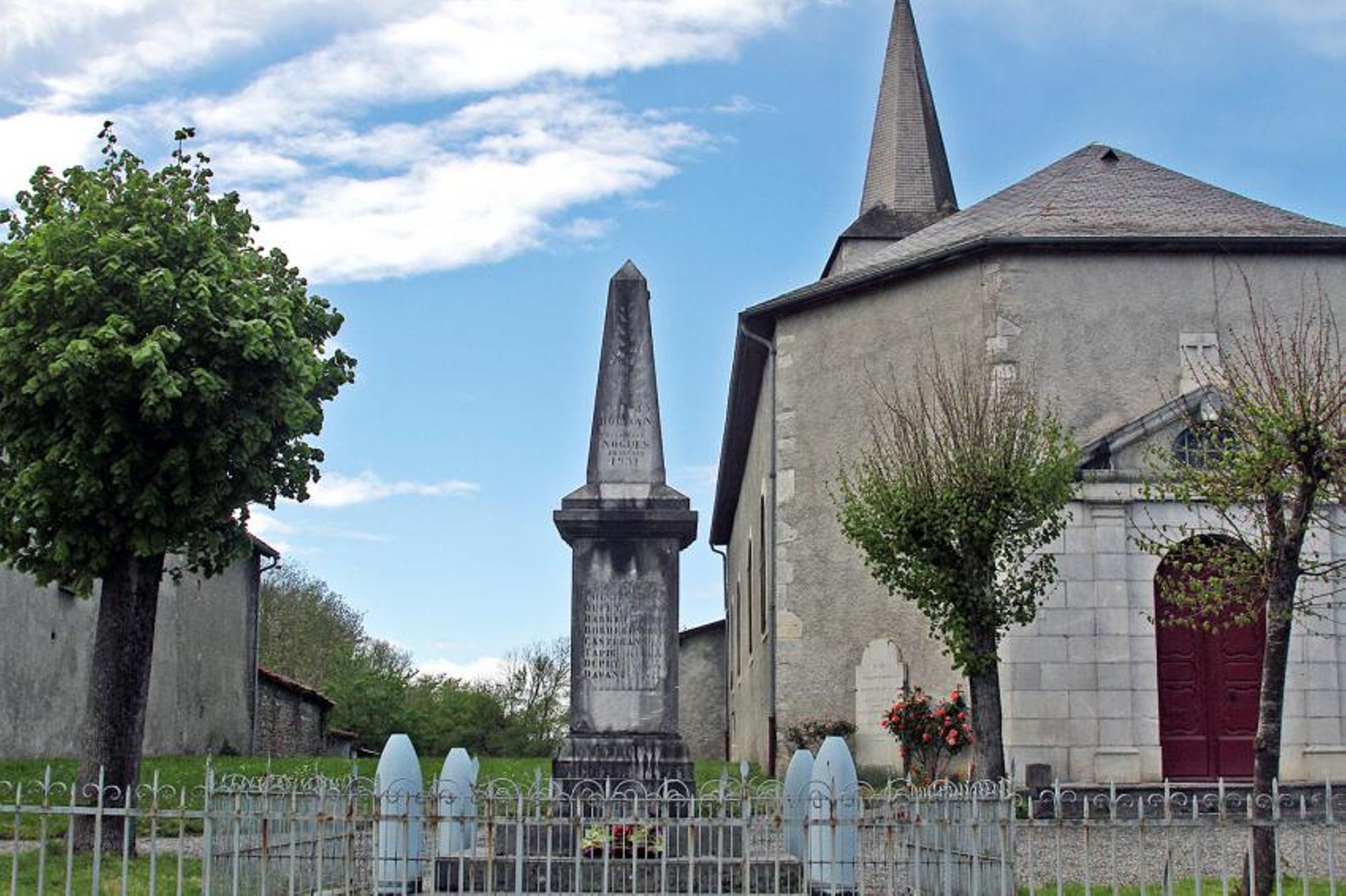 Dans l'enceint du jardin de l'église, au bord de la route, la surplombant.