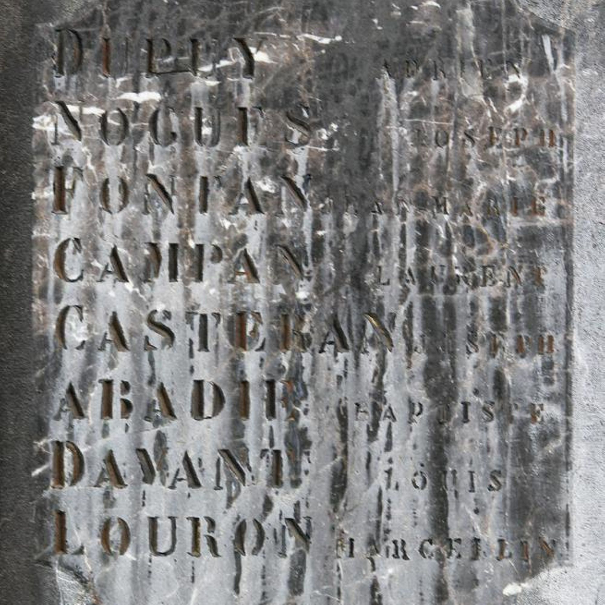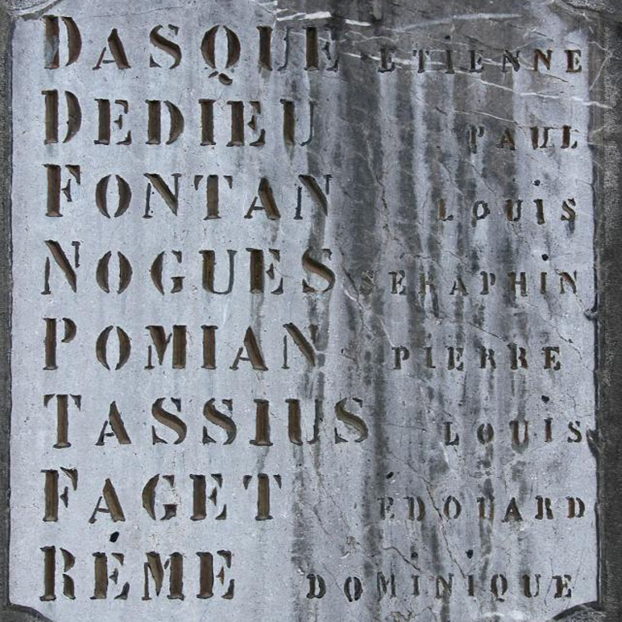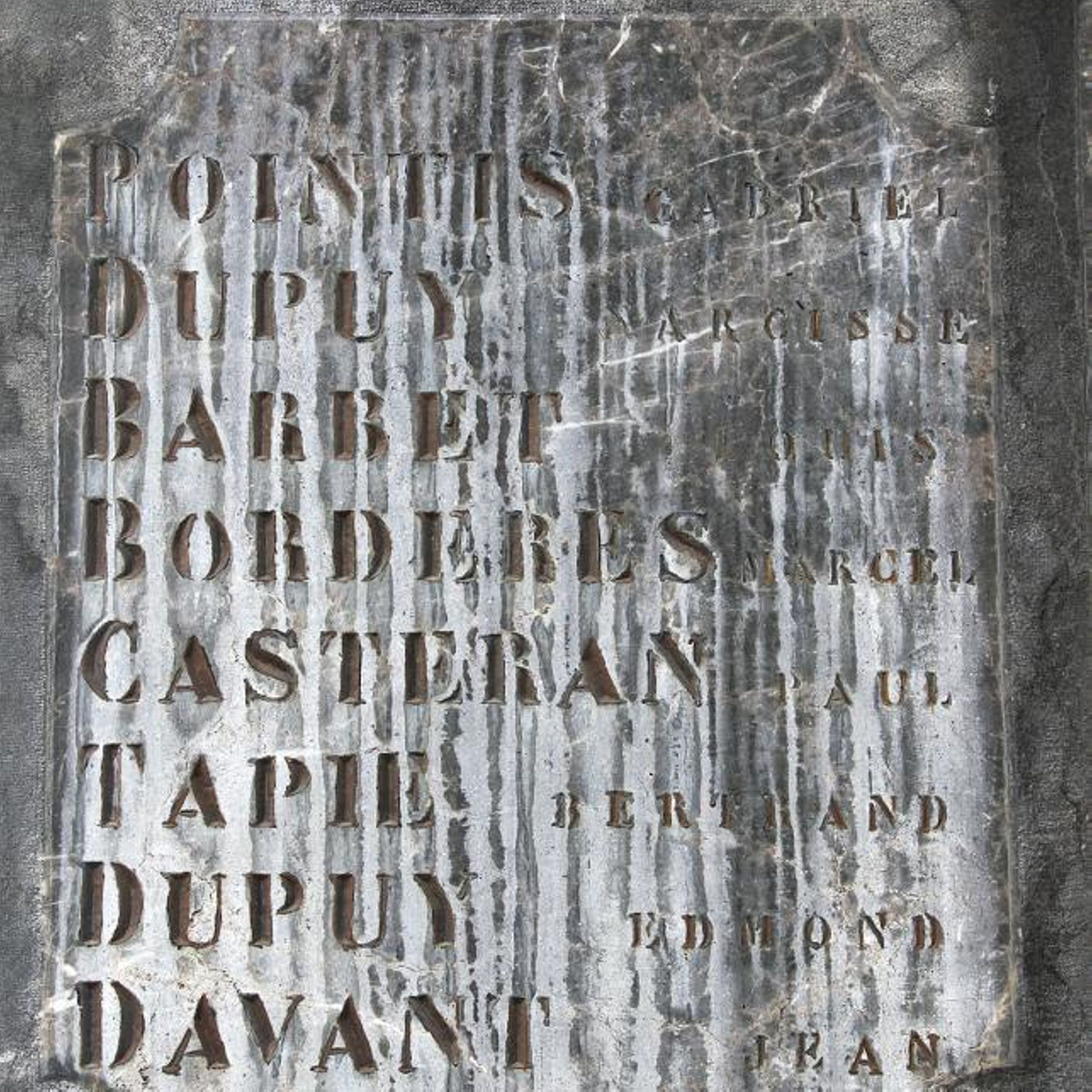 Sur la façade de la colonne en pierre carrée, les noms des victimes qui se retrouve aussi sur l'arrière et sur le côté droit.
