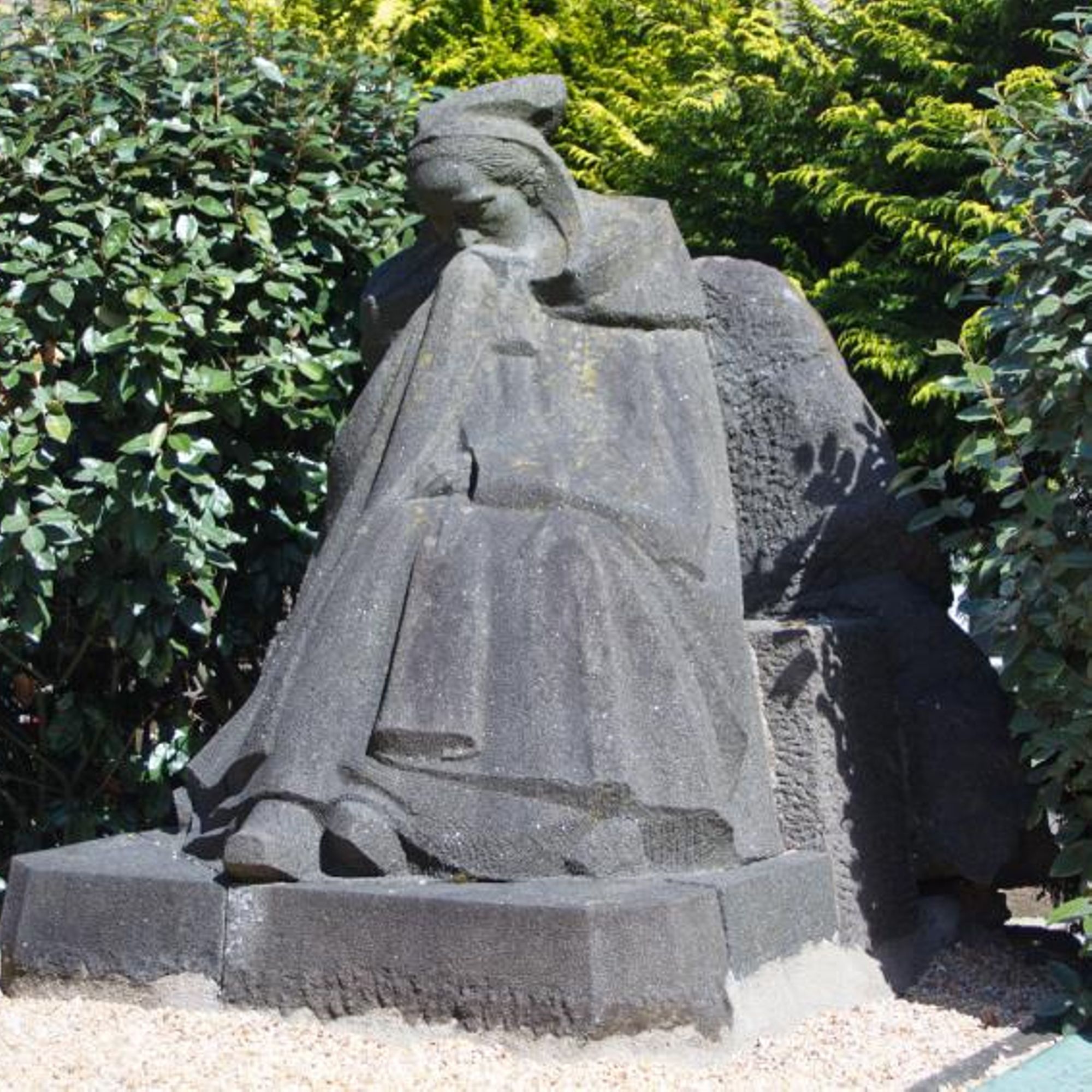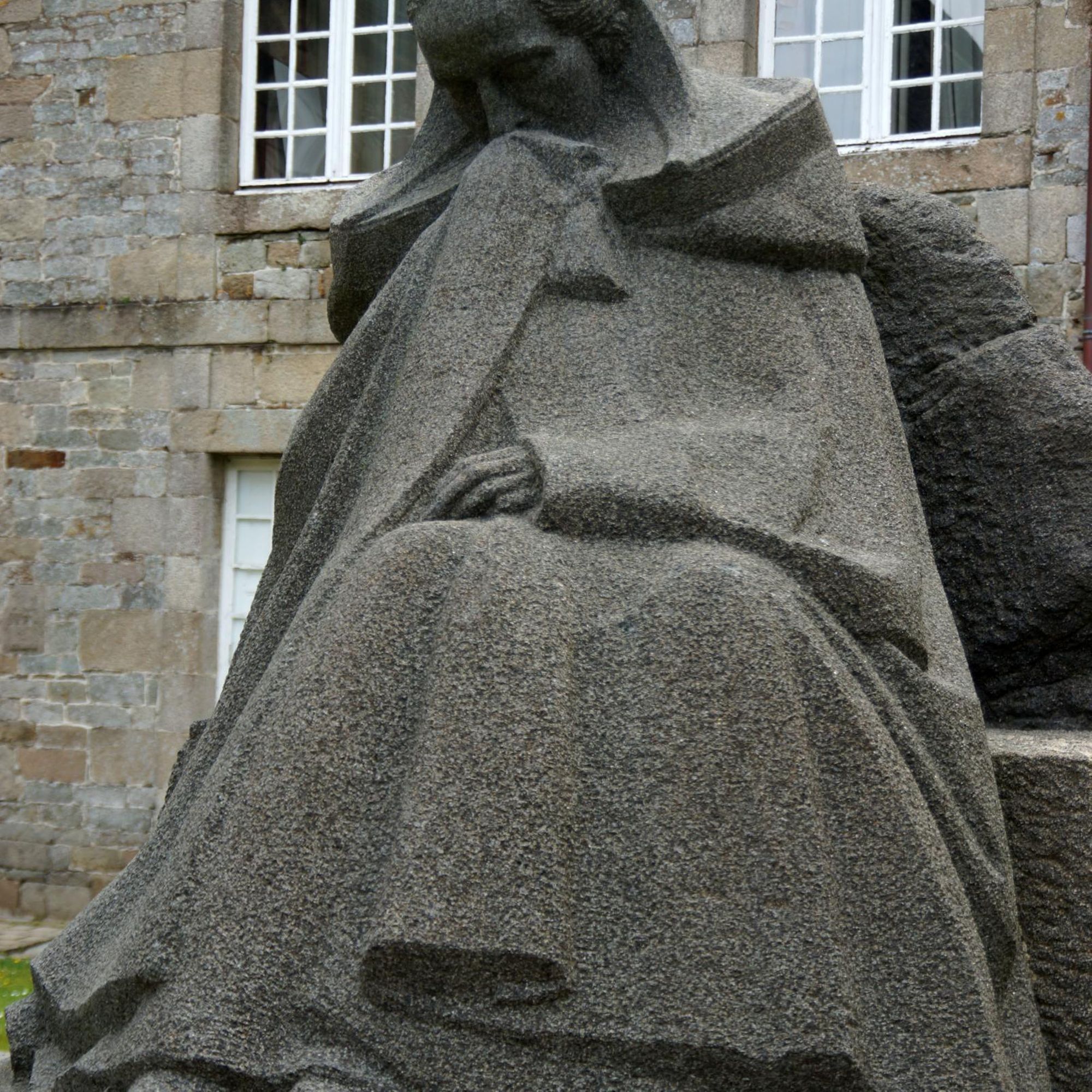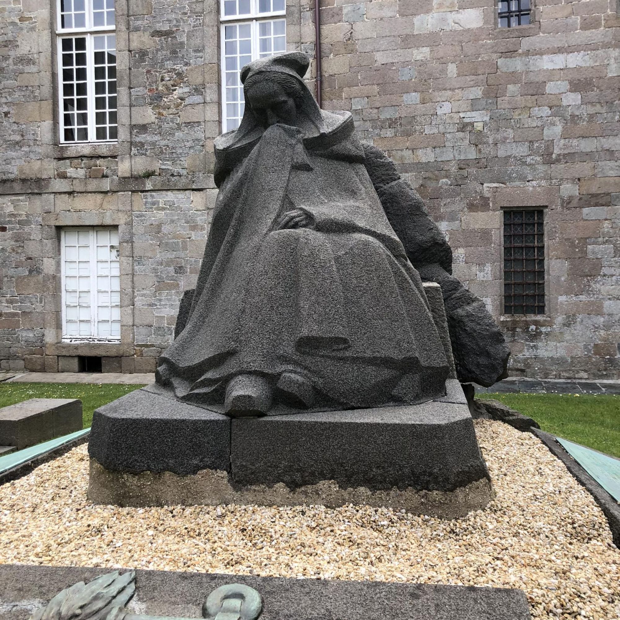- Statue d'une femme trégoroise avec une cape de deuil et une coiffe.
