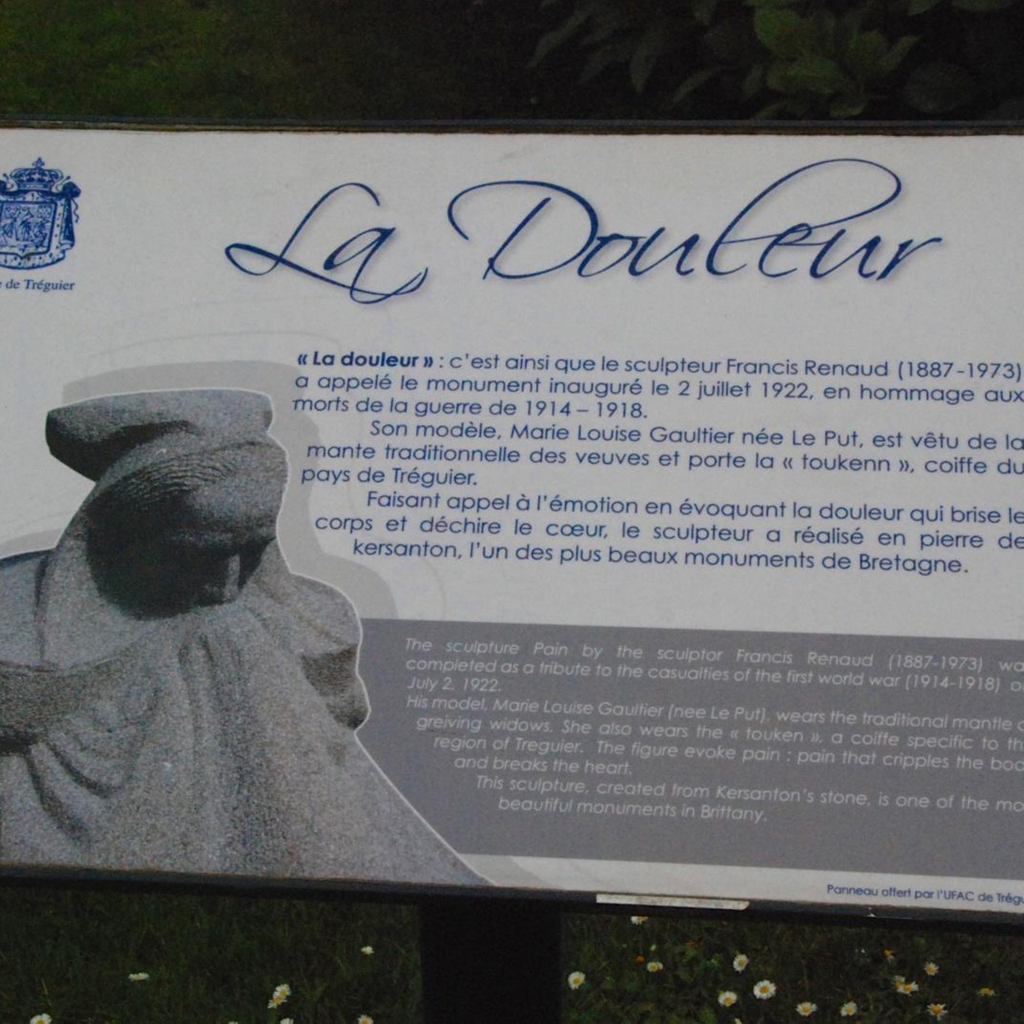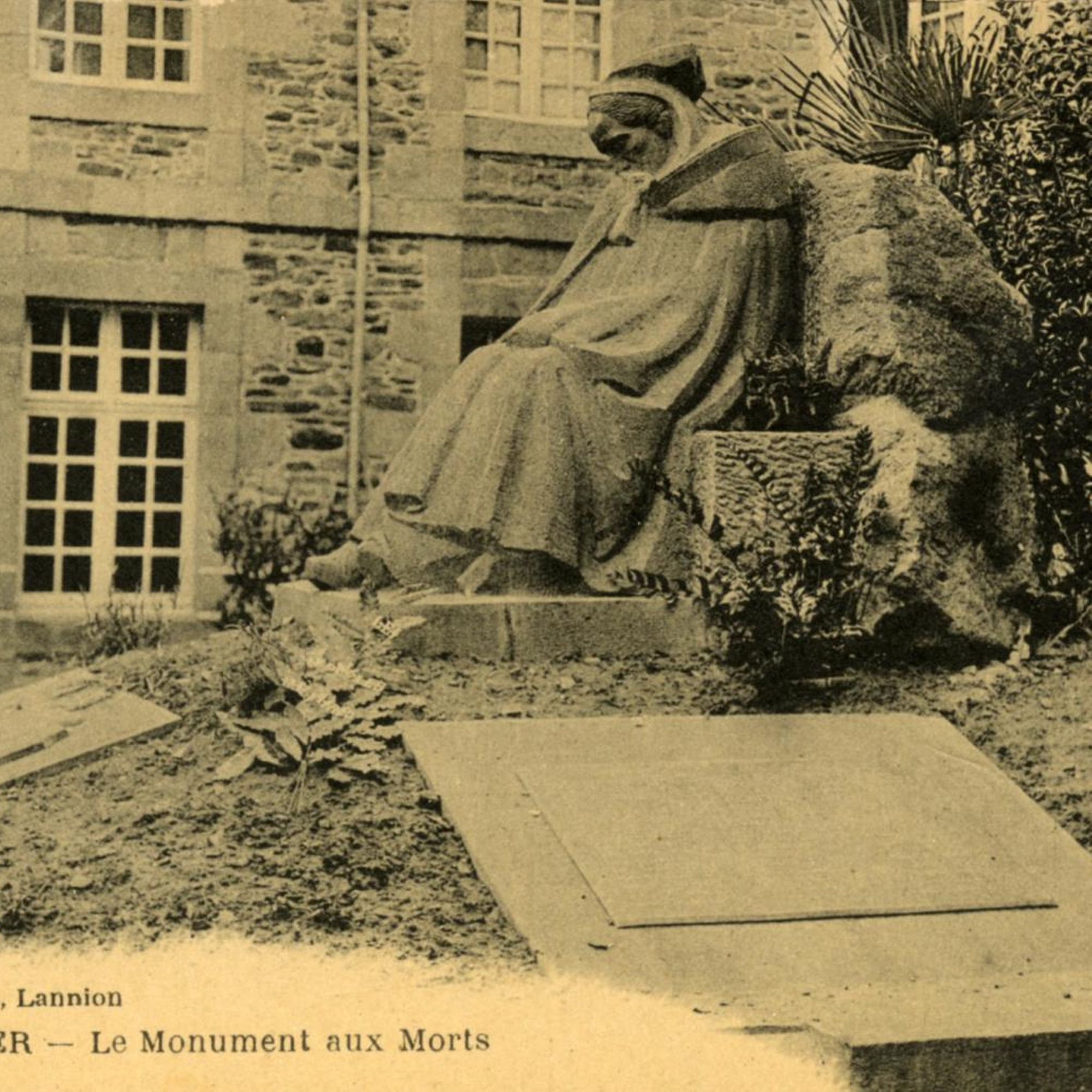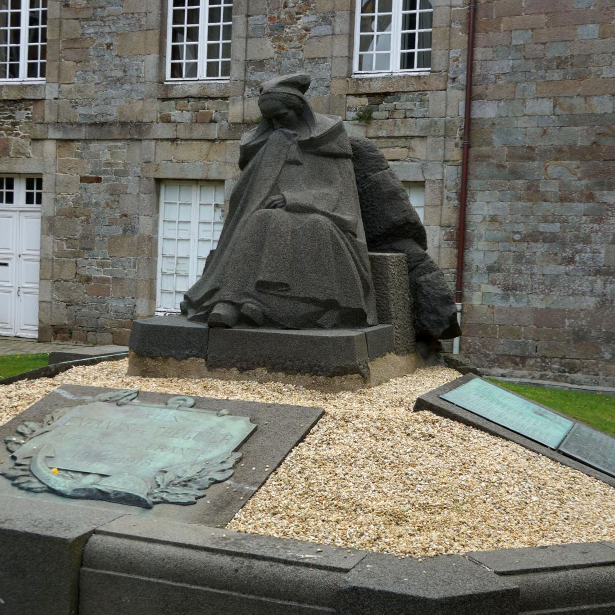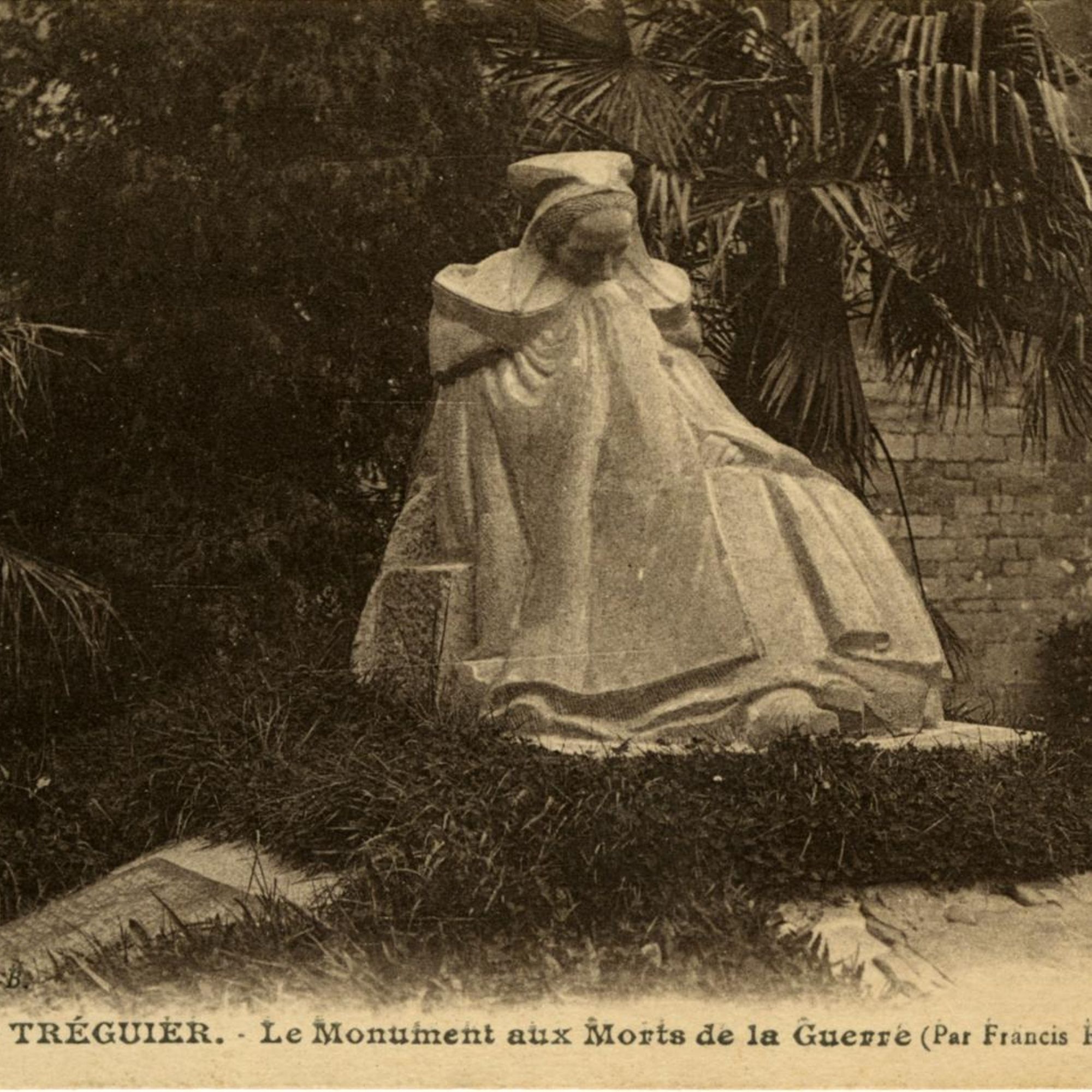 Le parti pris était d'éviter les monuments du "commerce" de série industrielle... Le premier projet de Francis Renaud (1887-1973) , sculpteur, présente la "trécorroise" en kersanton, avec guirlande de laurier de 3 m de long et casque en bronze ; une grille d'entourage est prévue ; le monument devait être élevé Place des Halles. Le choix délibéré d'une représentation féminine, au lieu du traditionnel "Poilu", donne à cette "douleur" ou "pleureuse" une symbolique très forte.