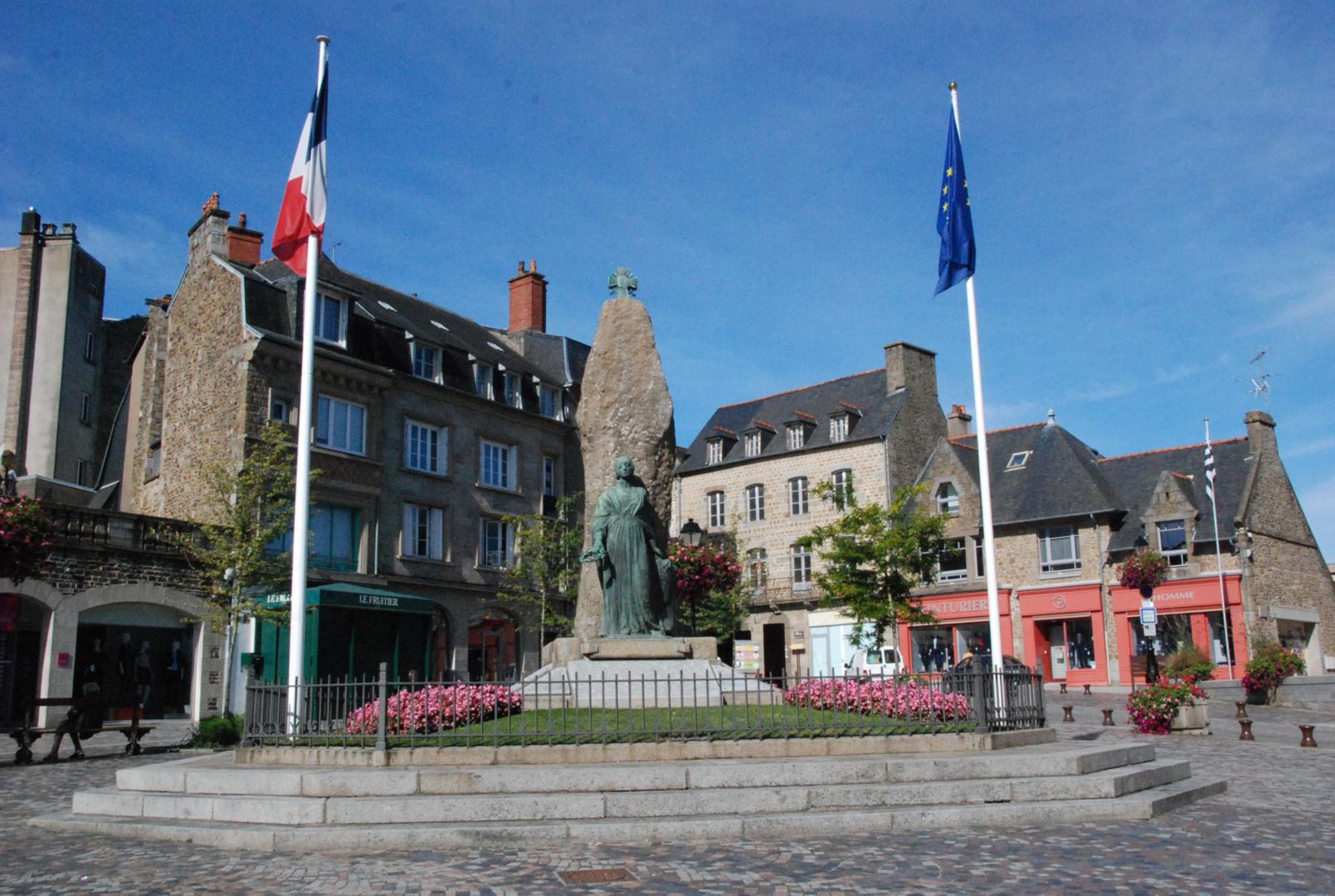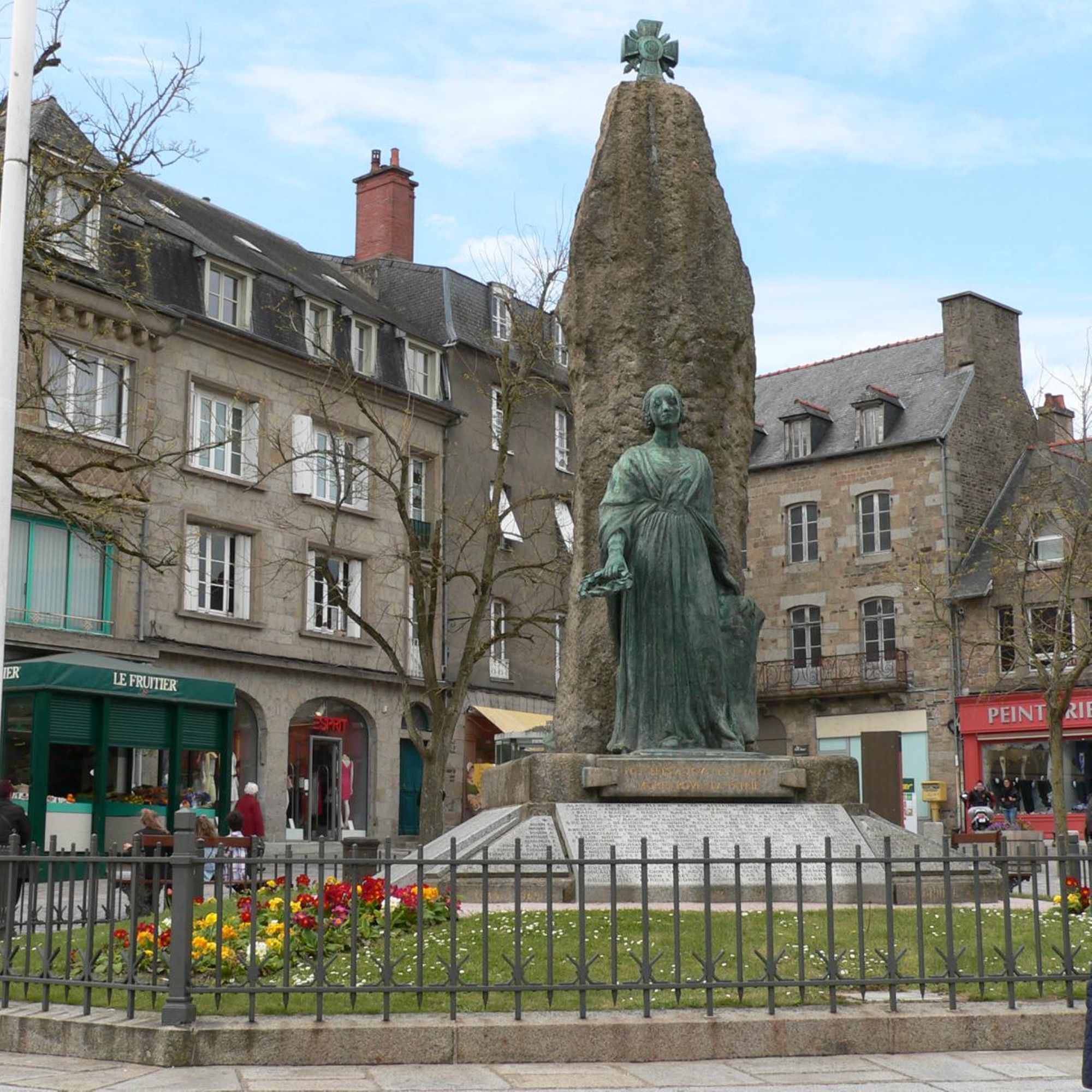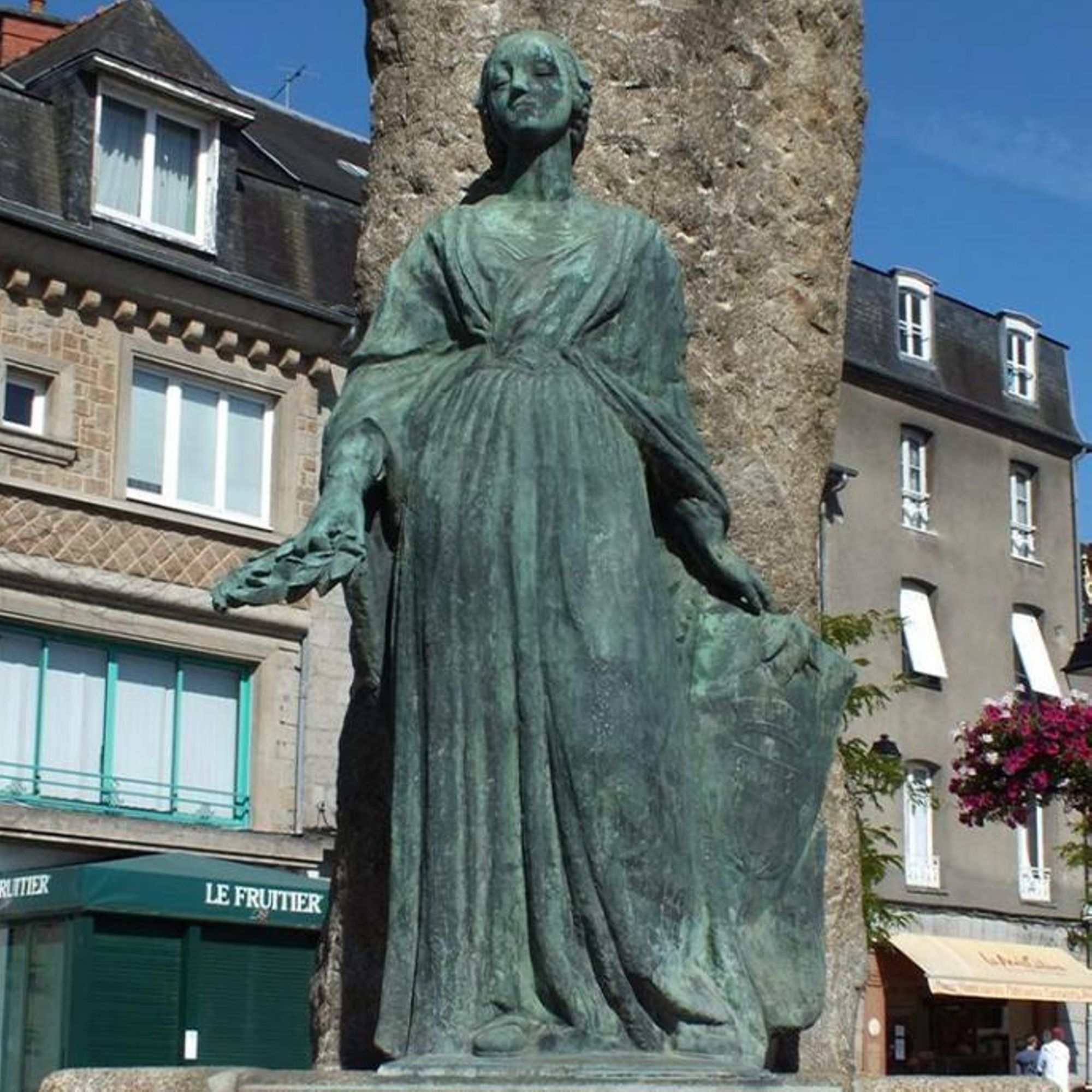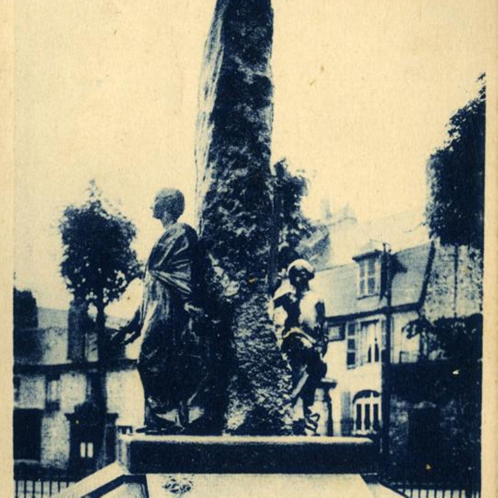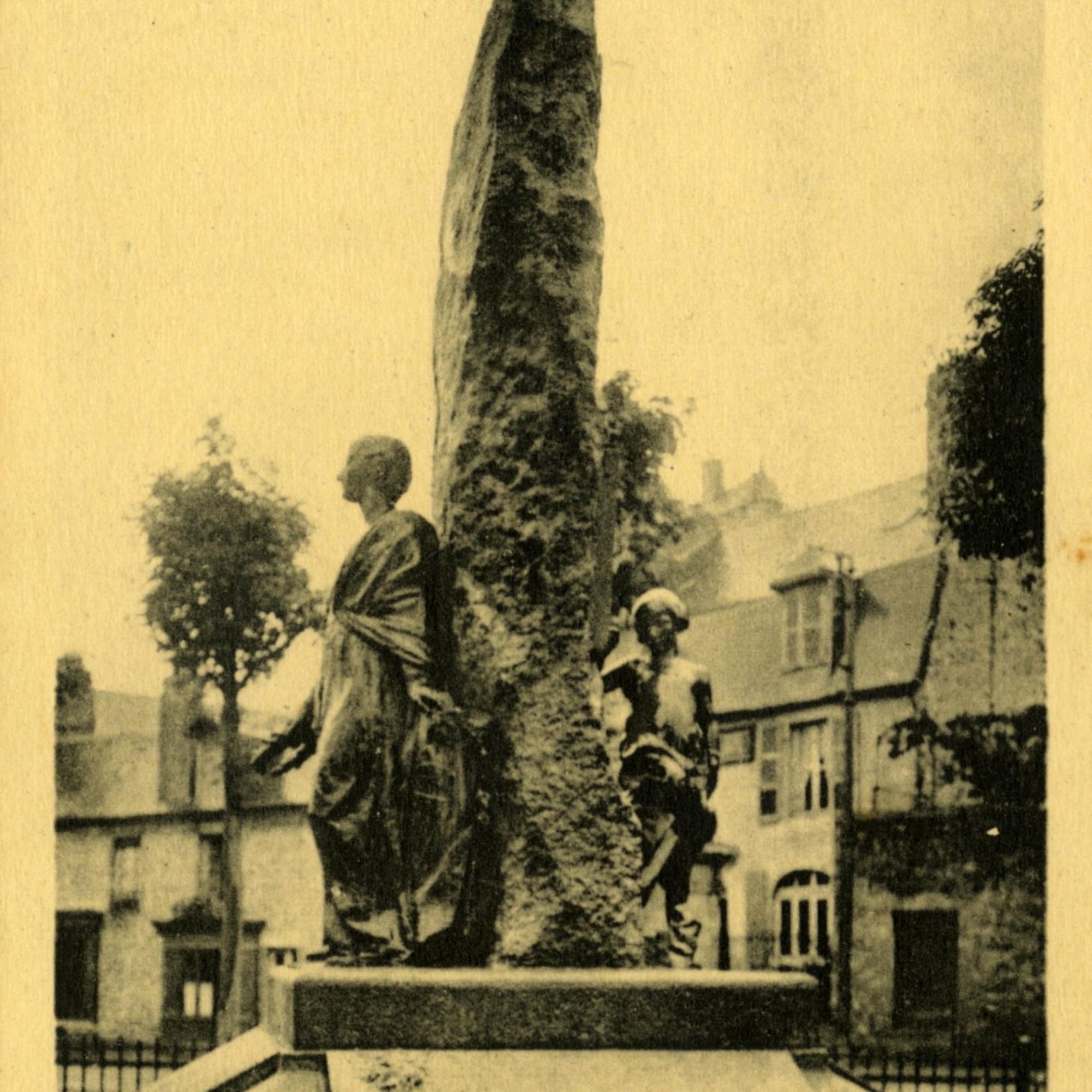 Une femme en deuill avec une couronne de lauriers à côté d'un menhir.