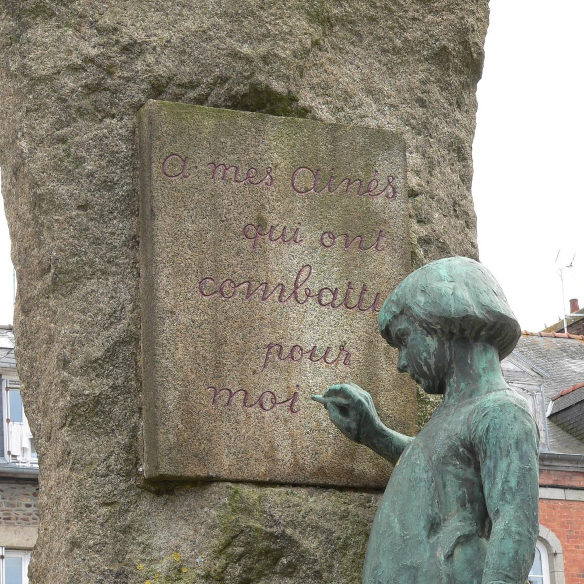 À l'arrière, un enfant écrit l'inscription sur le monument.