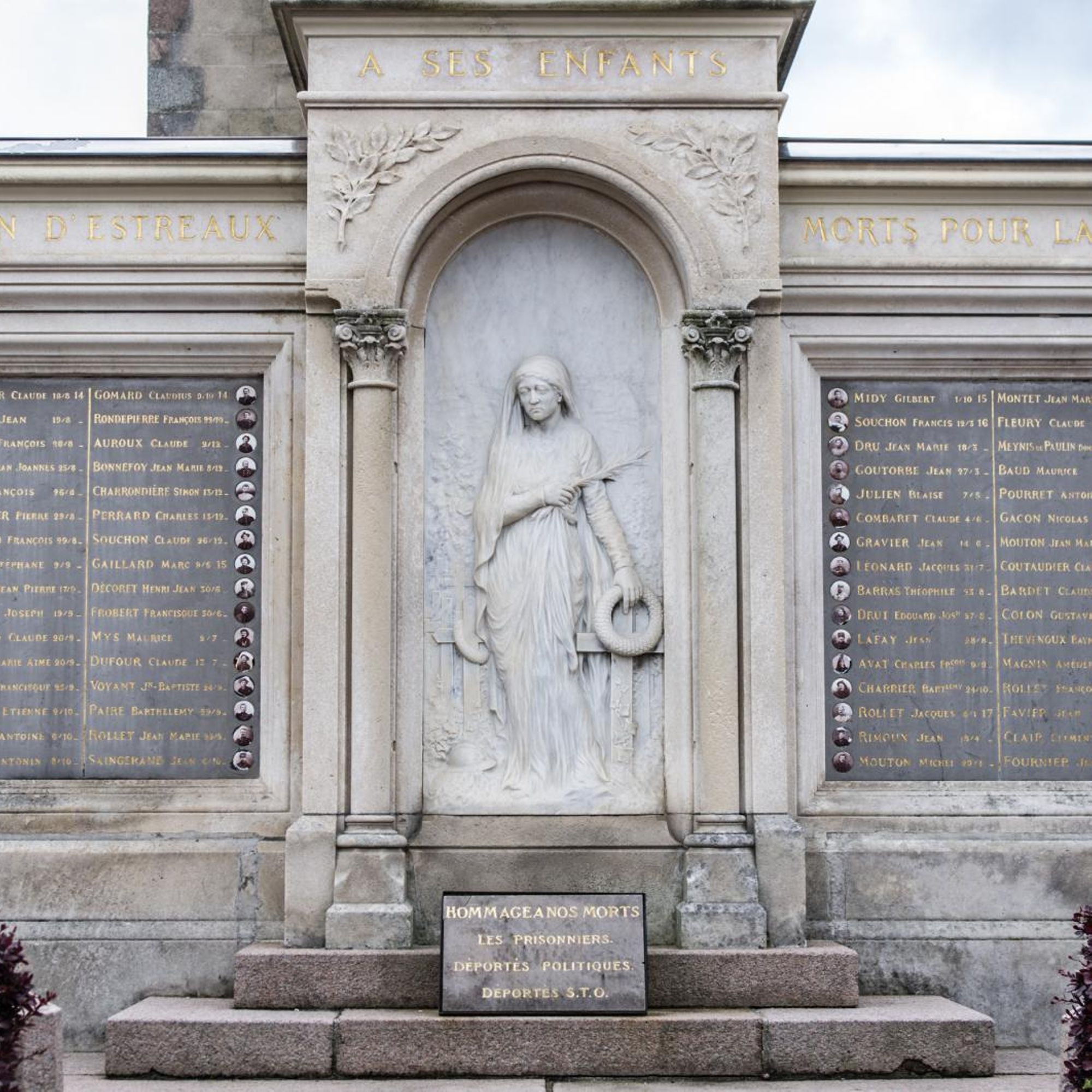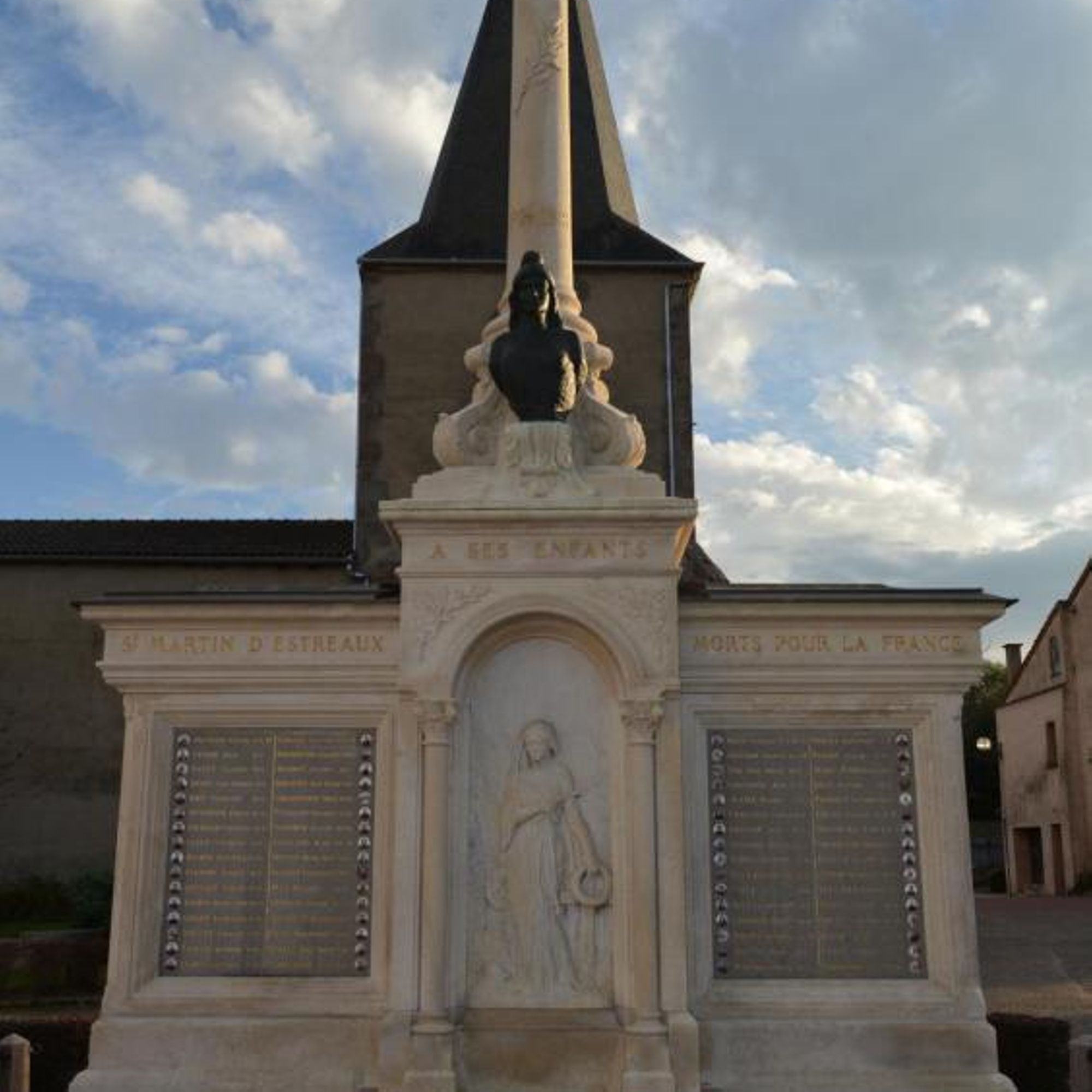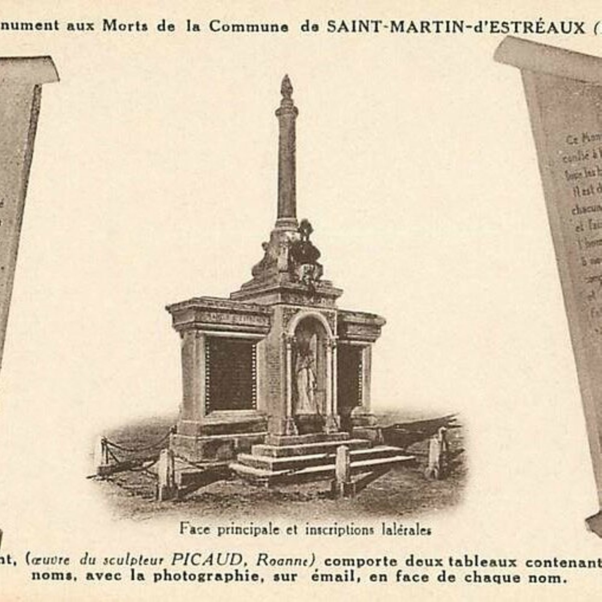 Le 8 décembre 1918, le maire de Saint Martin d’Estreaux, Pierre MONOT (1866-1931), énonce sa volonté, lors de la séance du conseil municipal, d’ériger un monument en mémoire des victimes de la guerre de 14 /18. Il fixe le modèle du monument qui doit avoir une originalité locale, comporter de grands tableaux en marbre noir sur lesquels seraient gravés le nom des 64 disparus, avec photographies sur médaillons émaillés, et utiliser le buste en bronze de la République, modèle Injalbert, qui est à la mairie.