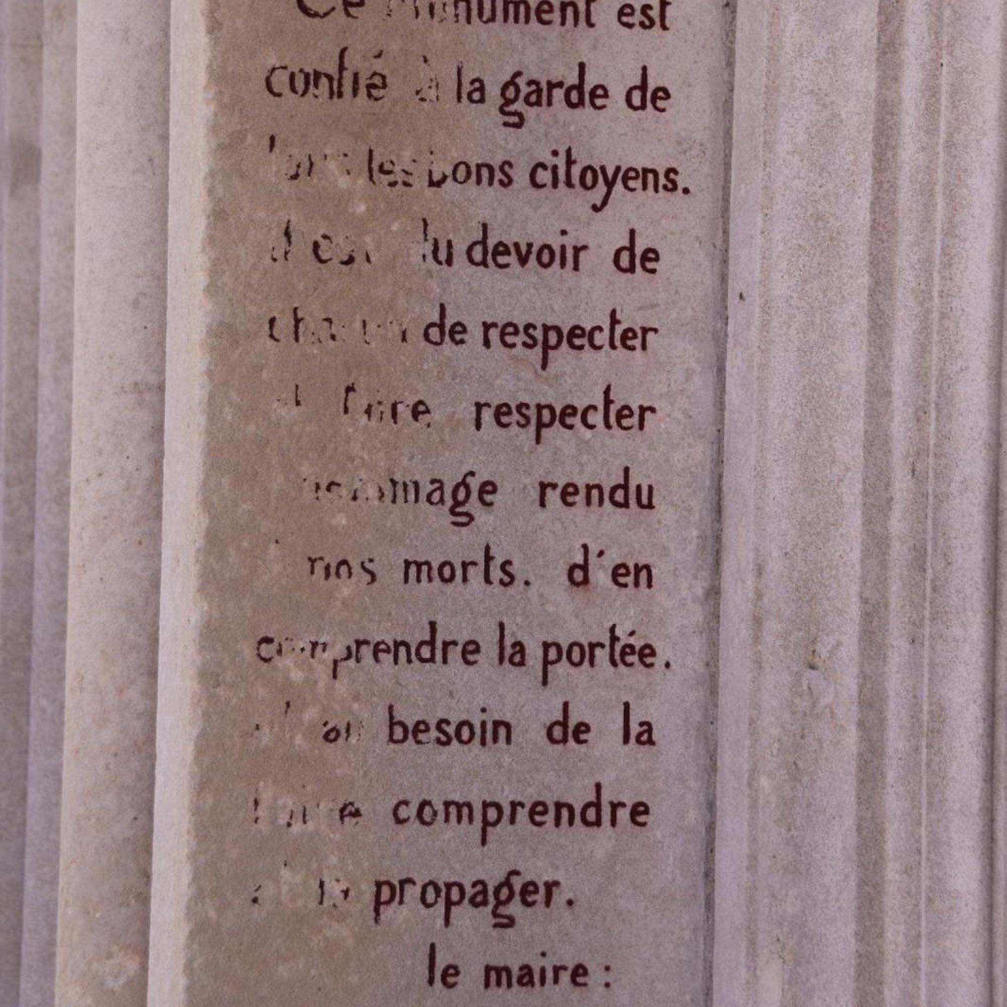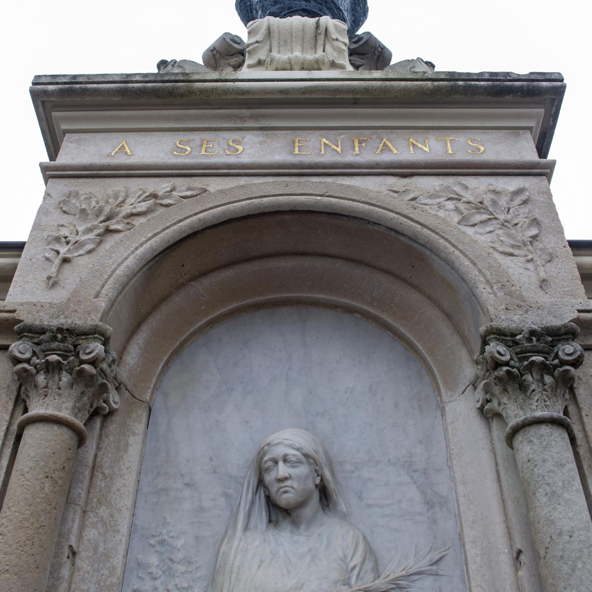 Description des travaux : les médaillons seront maintenus en place, leur restauration est confiée à Mme Gaëlle Giralt, restauratrice métal et céramique d’objets d’art. Le buste en bronze sera nettoyé et patiné avec une finition de teinte bronze brun. Mme Fanny Grué interviendra pour le lot pierre polychrome. La pierre et tous les éléments sculptés seront soigneusement nettoyés afin de redonner au monument son aspect d’origine. Pour la protection du monument la couvertine sera reprise et élargie. L’éclairage du monument se fera par l’installation de quatre projecteurs led, en remplacement des trois anciens projecteurs qui ne fonctionnent plus.