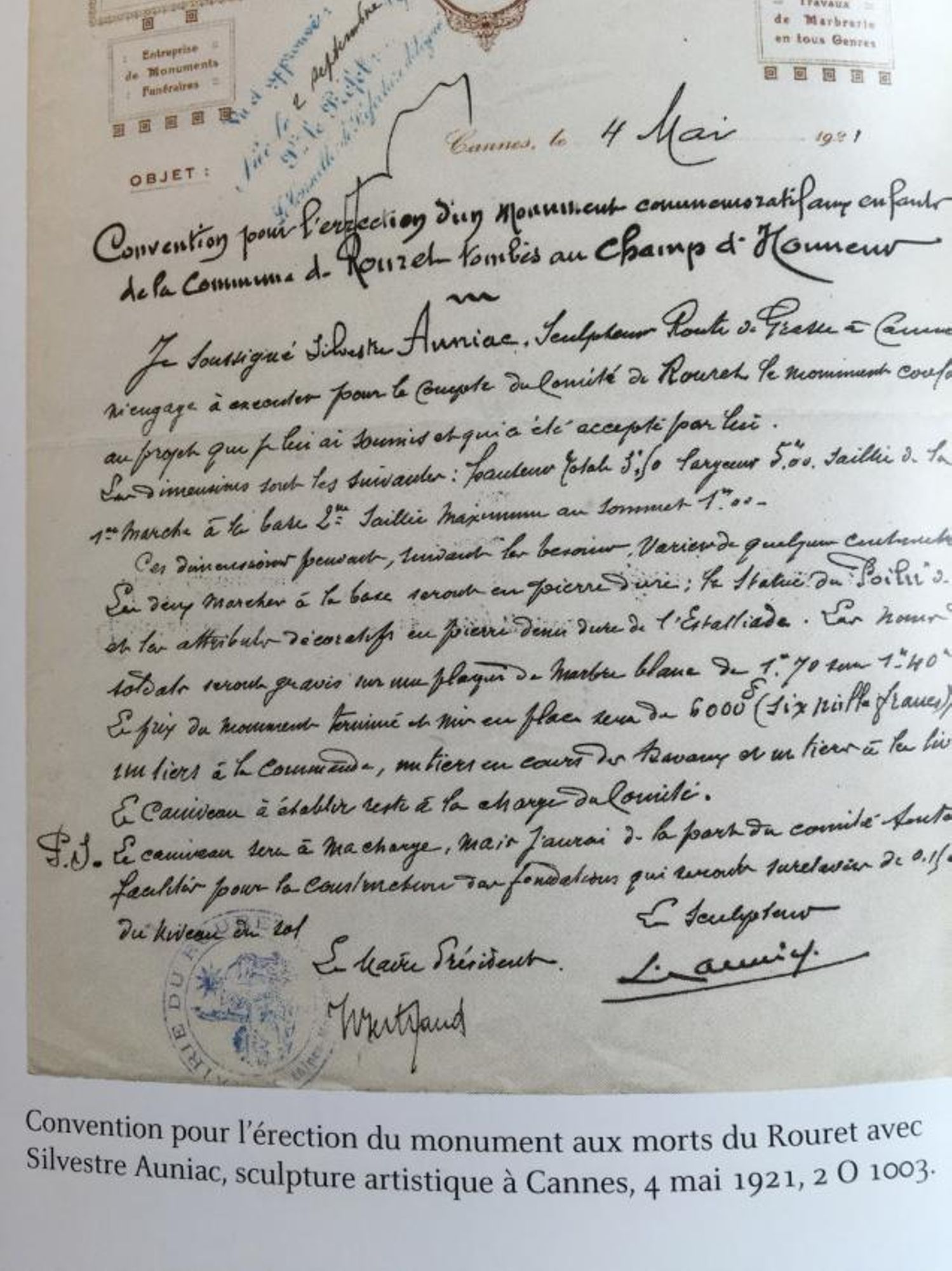 Convention pour l'érection d'un monument commémoratif aux enfants de la commune du ROuret tombés au champ d'honneur