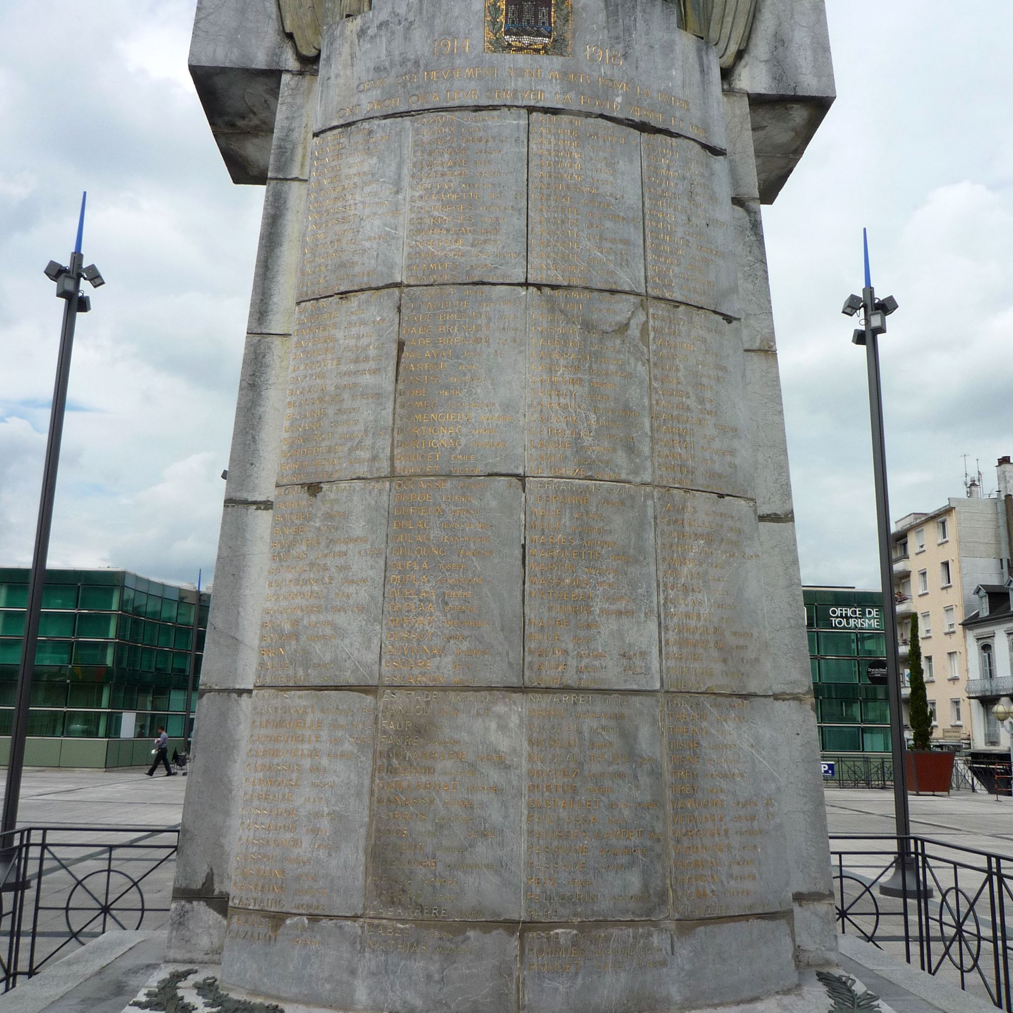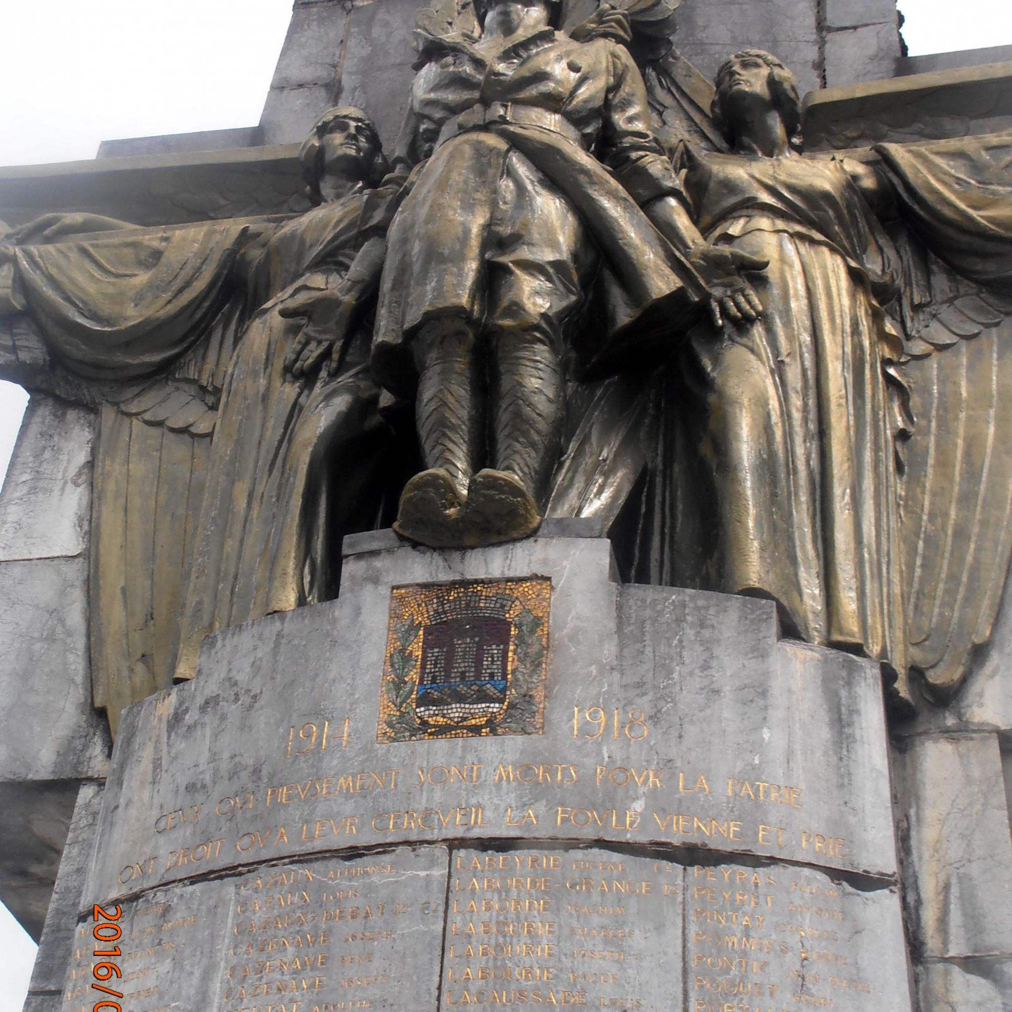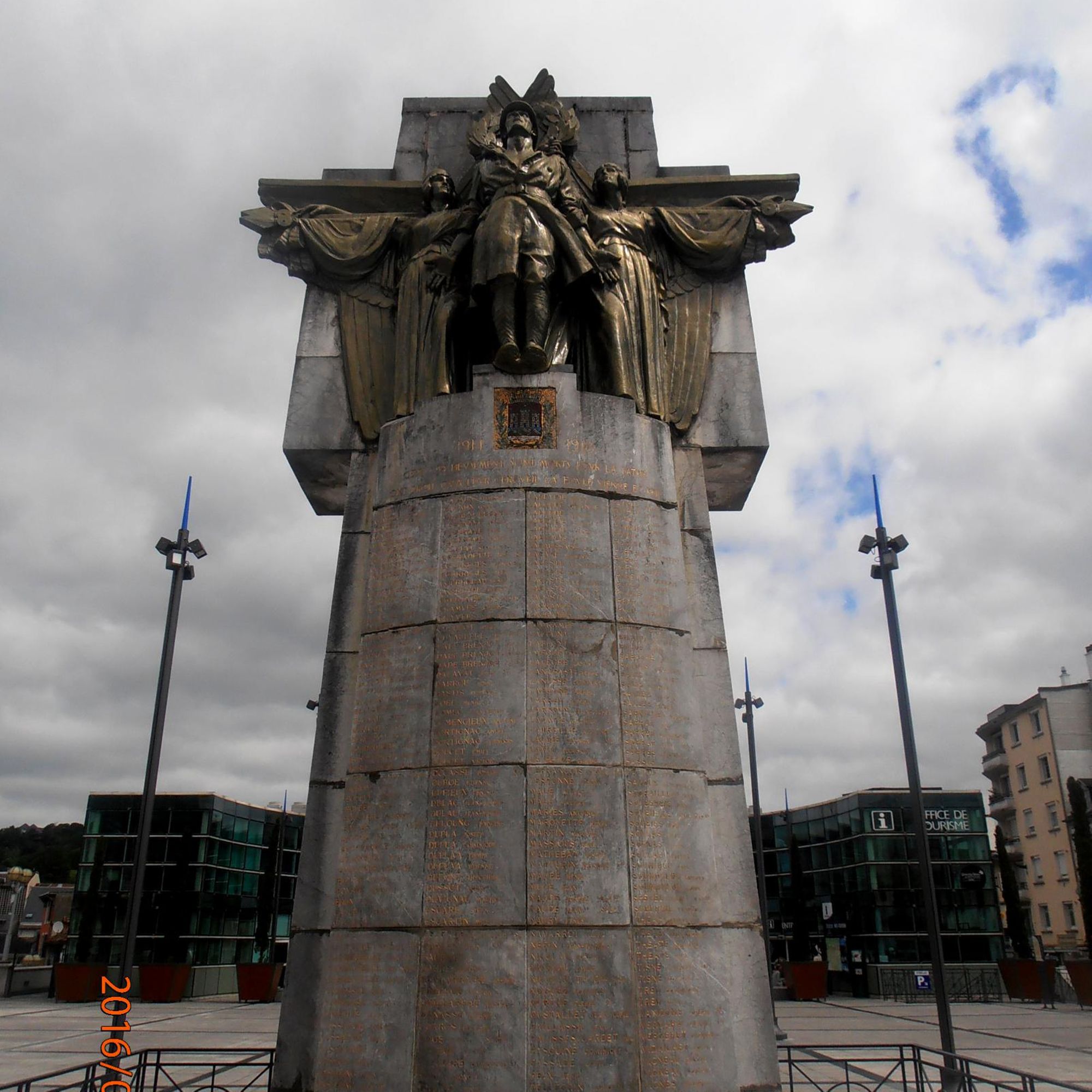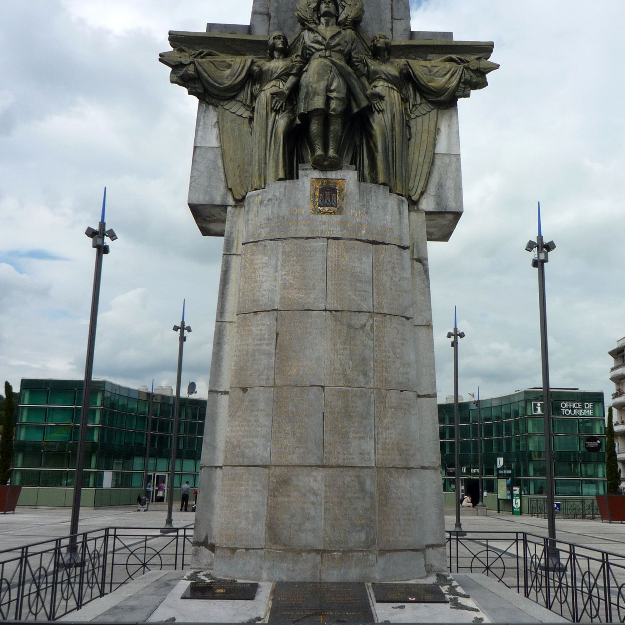 Obélisque imposant (une quinzaine de mètres de hauteur) avec statue d'un poilu couronné par 2 victoires ailées portant chacune un drapeau