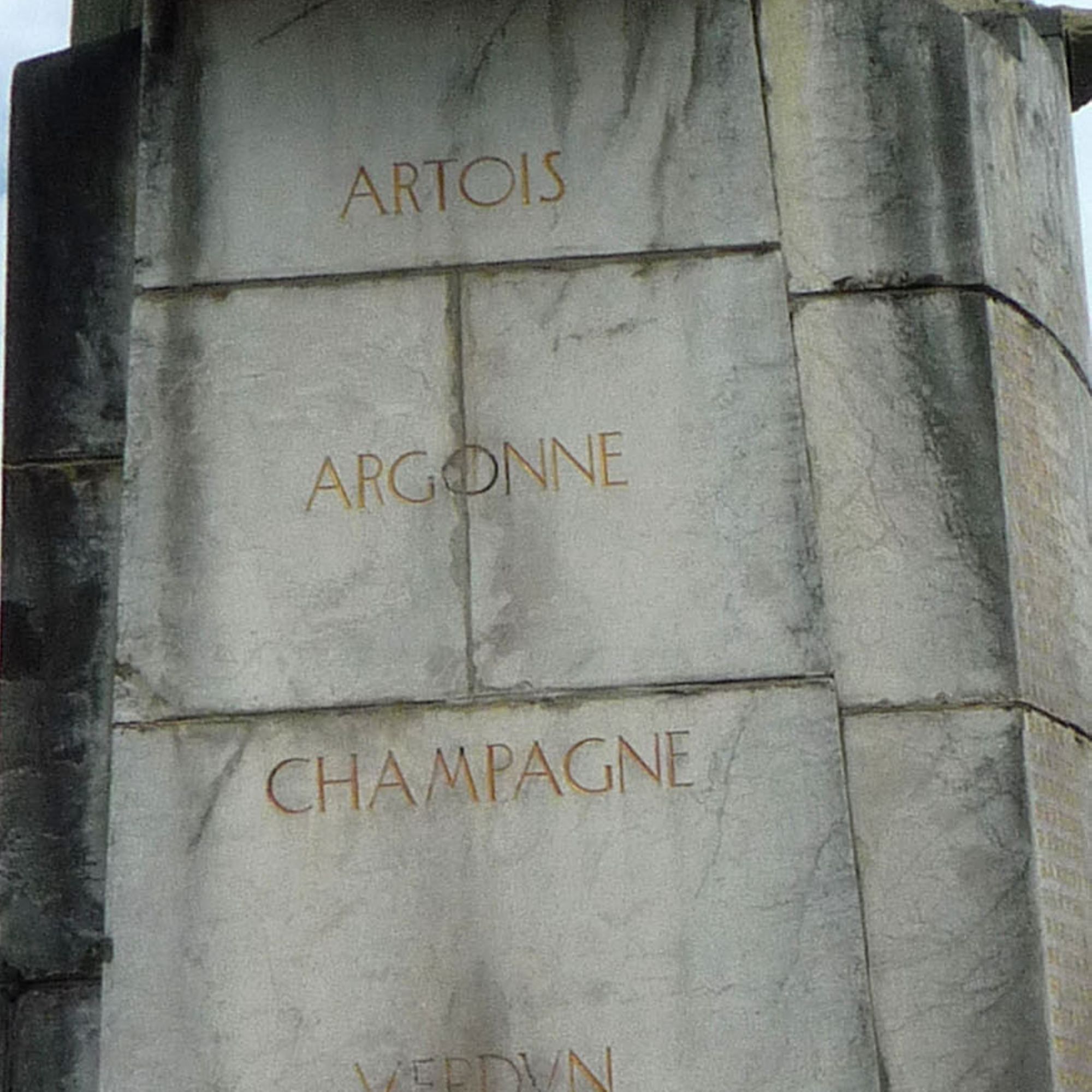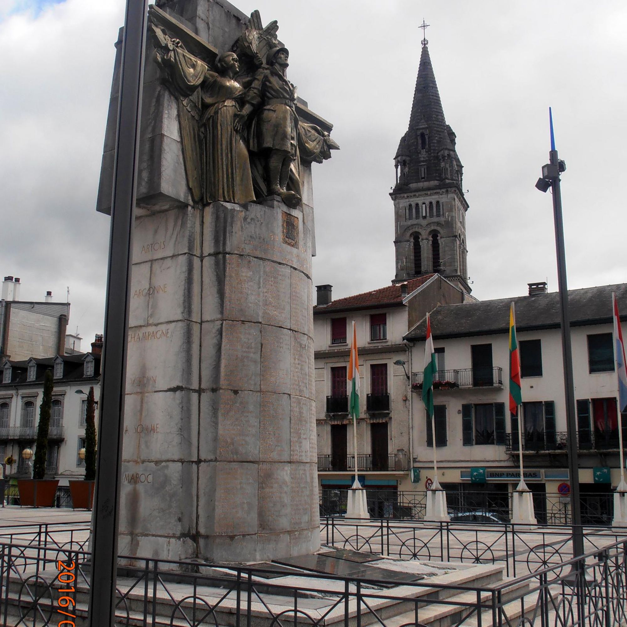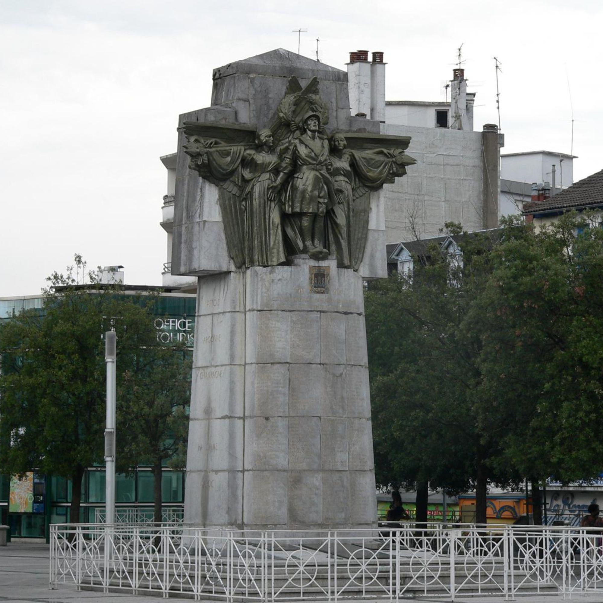 Obélisque imposant (une quinzaine de mètres de hauteur) avec statue d'un poilu couronné par 2 victoires ailées portant chacune un drapeau