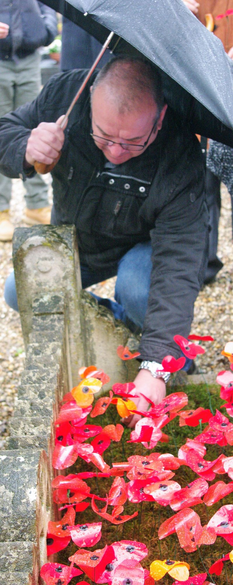 Commémoration de l'Armistice : les personnes présentes ont été invitées à fleurir le monument avec un coquelicot ou un bleuet artificiels, confectionnés par des bénévoles du village.