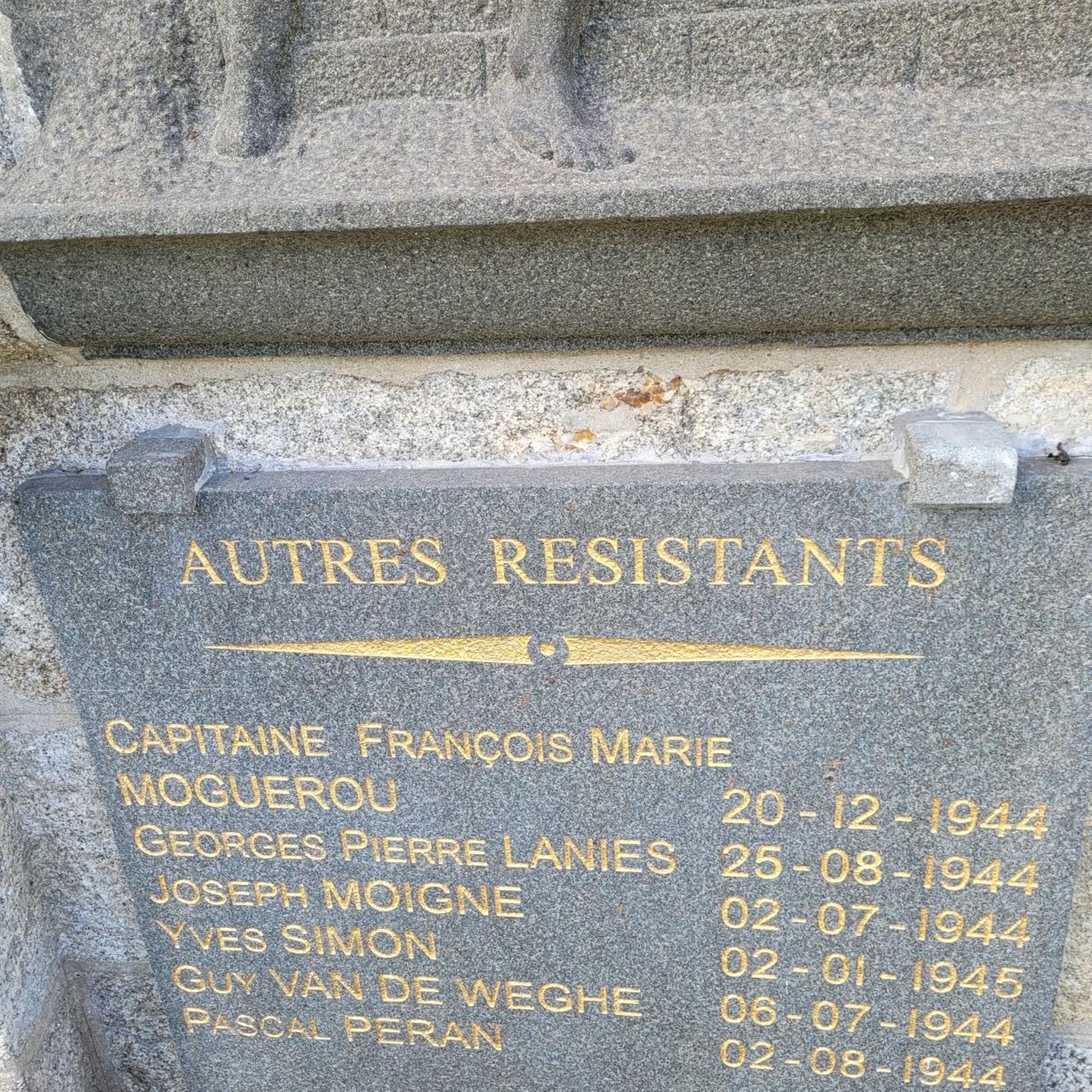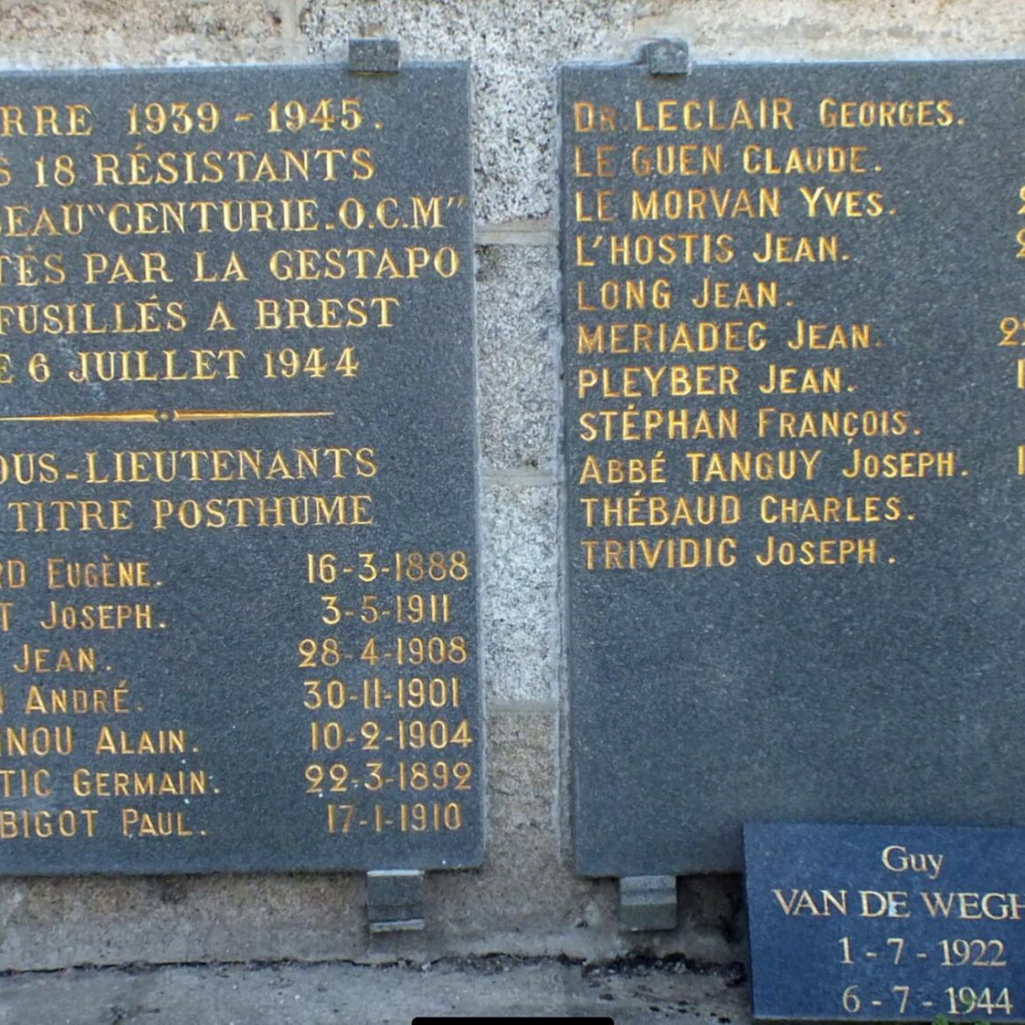 La Mairie de Saint-Pol-de-Léon, à ma demande (et après les recherches nécessaires), a ajouté sur une plaque du monument "Autres Résistants" avec le nom du résistant belge Guy VAN DE WEGHE déjà présent sur une plaque au pied du Monument aux Morts, mais également: François Moguérou, Joseph Le Moigne, Yves Simon, George Laniès et Pascal Péran.