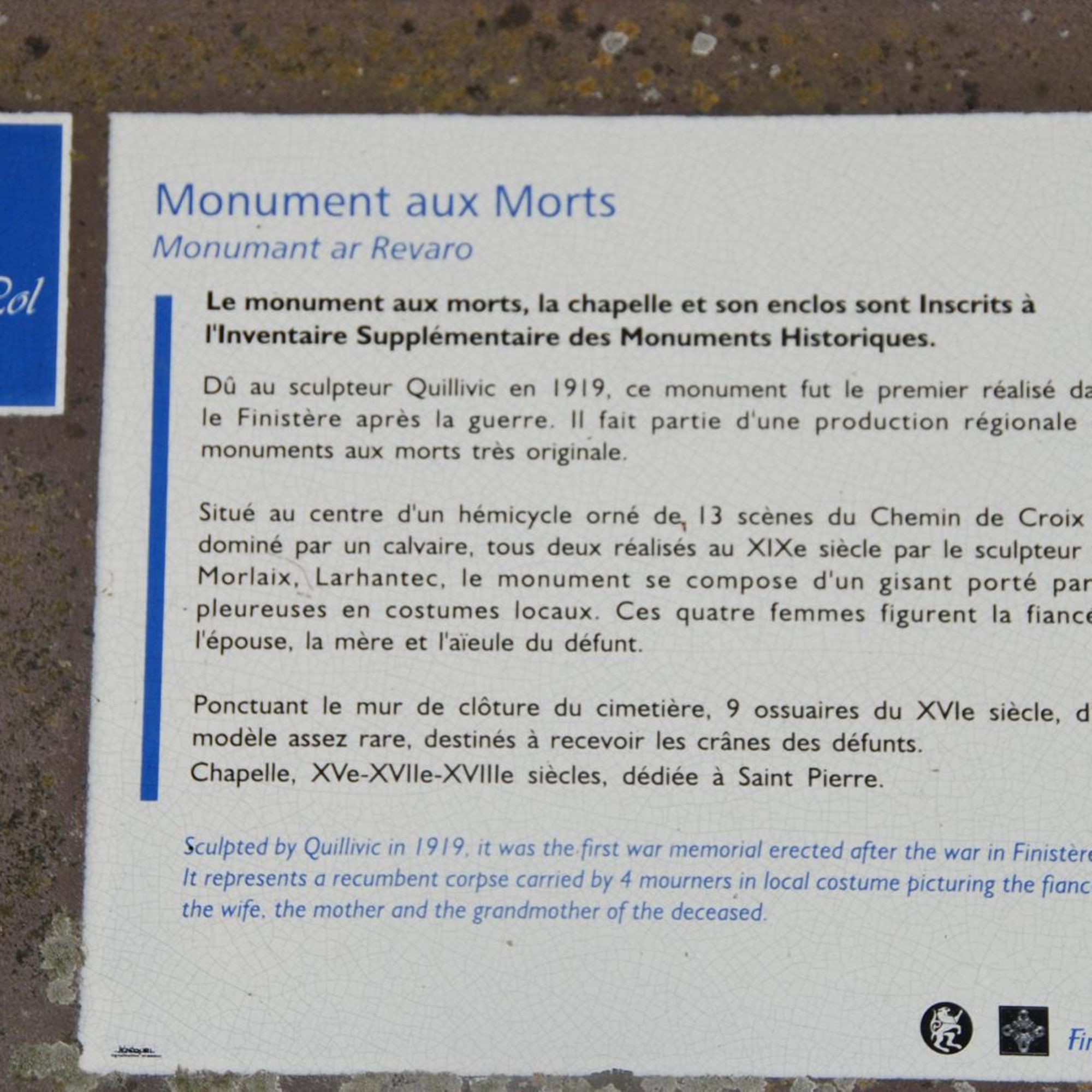 - Monument aux morts : le cénotaphe du soldat mourant. Réalisé par Quillivic, le tout premier monument aux morts finsitérien.