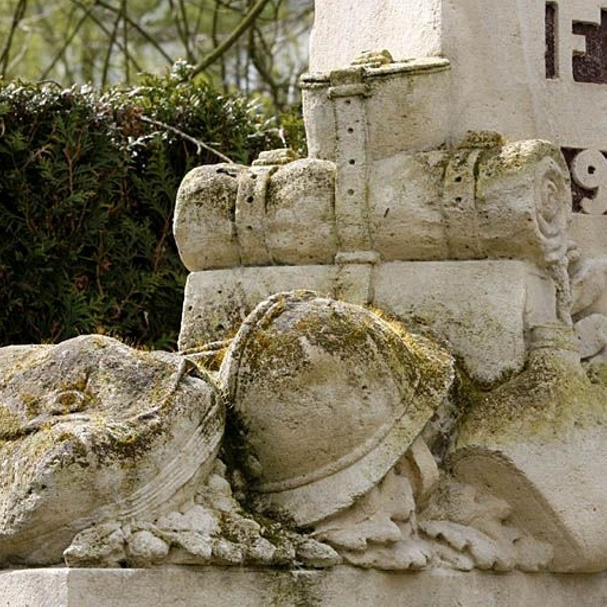 À gauche de la stèle repose le paquetage d'un soldat, sculpté également en calcaire de Lavoux. Il se compose d'un casque, d'une couverture roulée, d'une gourde et d'un sac à dos, le tout posé sur des branches de chêne.