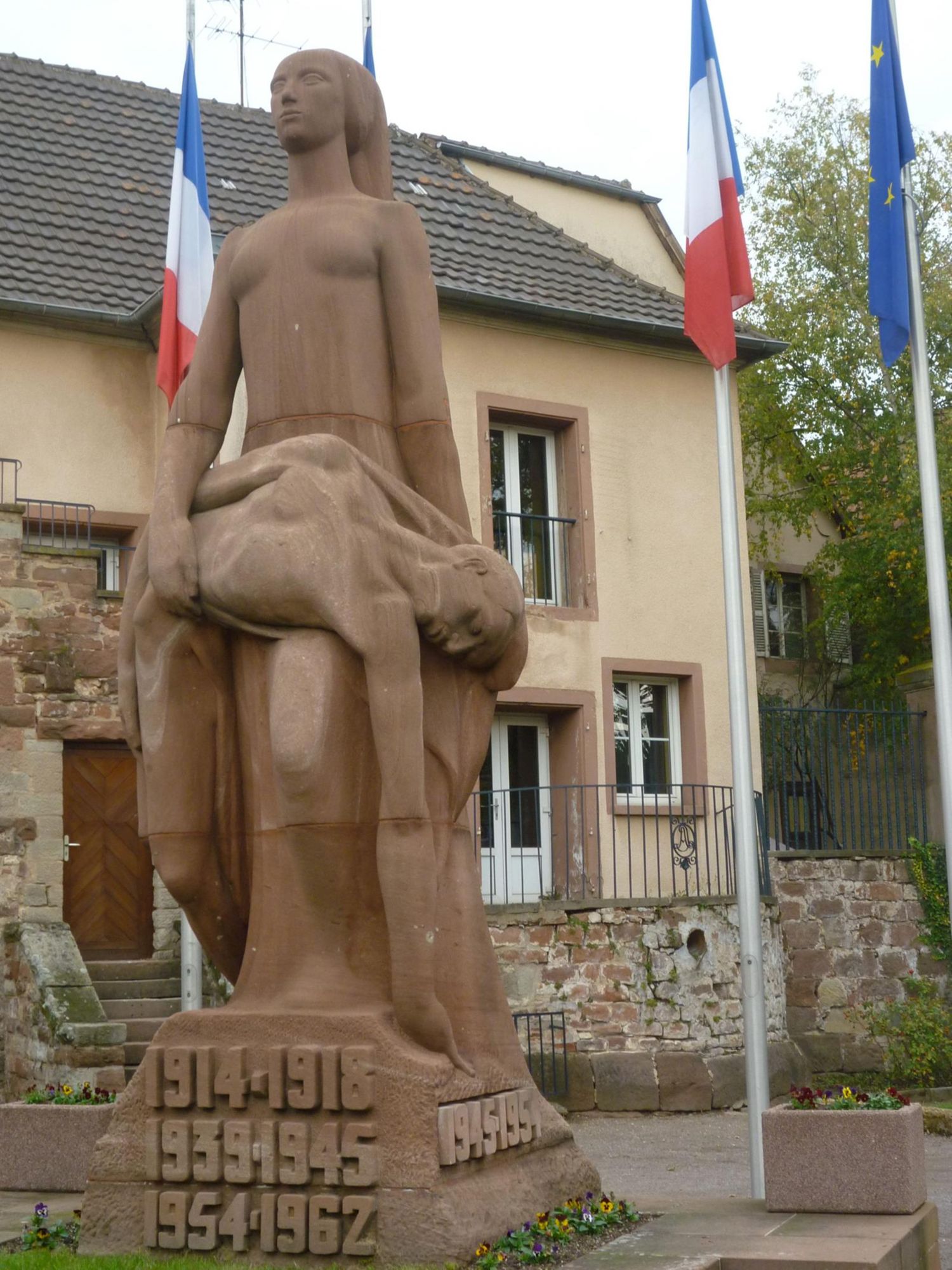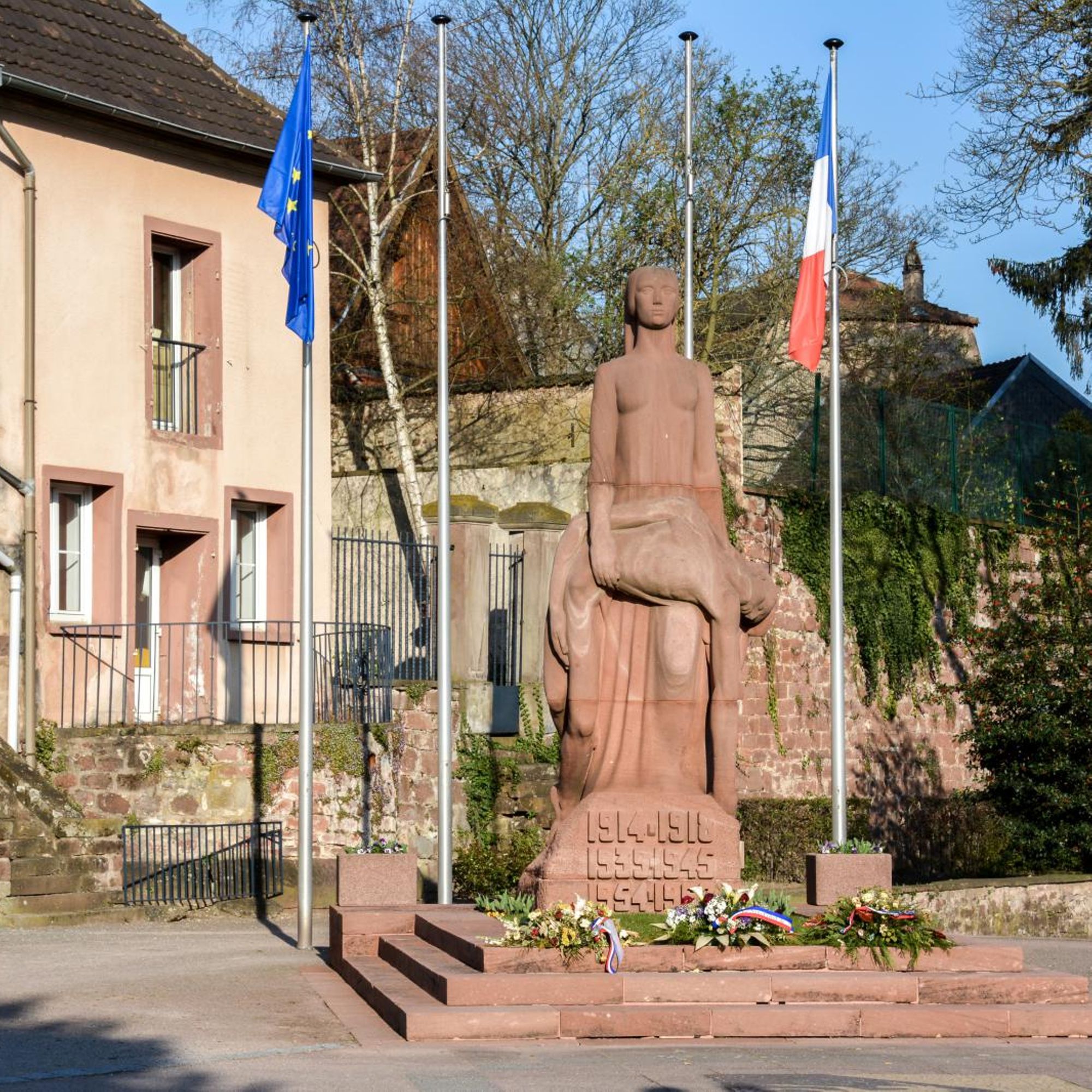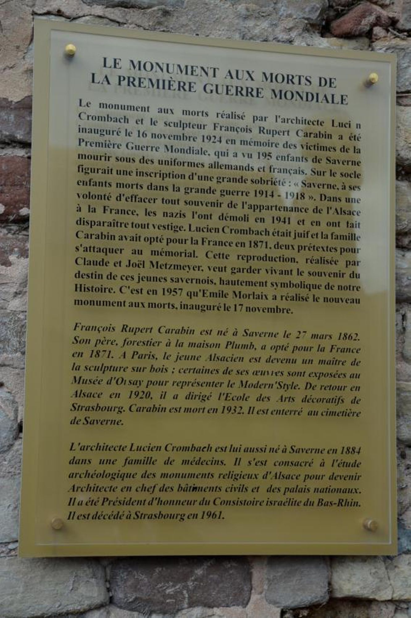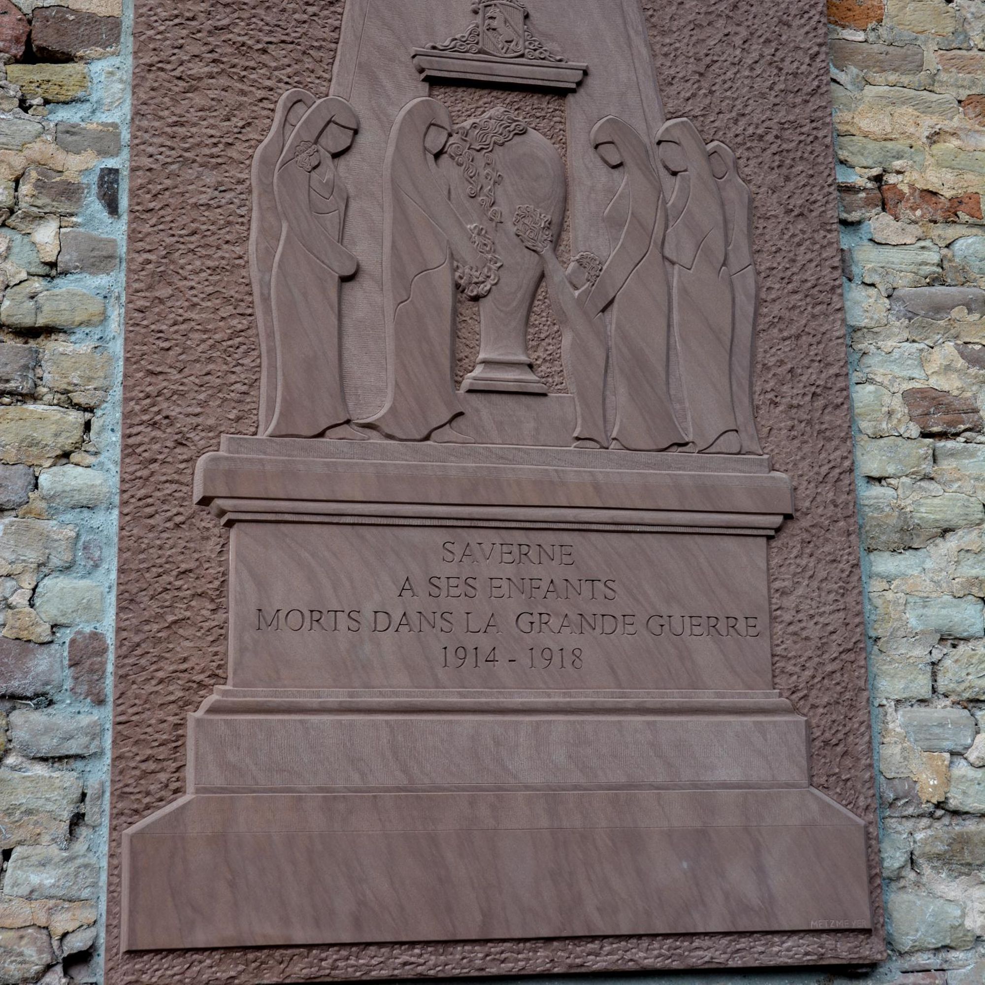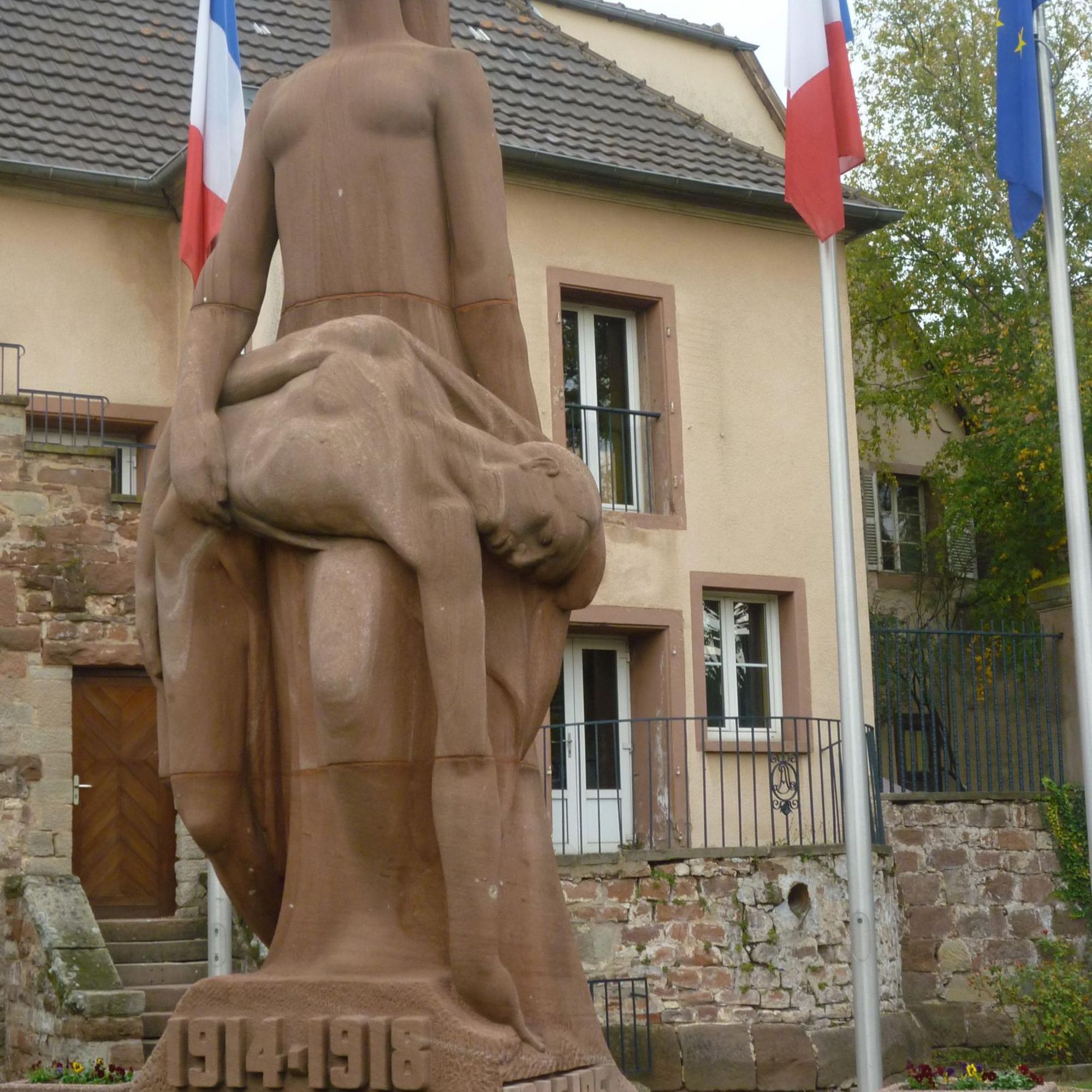 Le monument aux morts réalisé par l'architecte Lucien Crombach et le sculpteur François Rupert Carabin a été inauguré le 16 novembre 1924 en mémoire des victimes de la Première Guerre Mondiale, qui a vue 195 enfants de Saverne mourir sous des uniformes allemands et français. Sur le socle figurait une inscription d'une grande sobriété : Saverne, à ses enfants morts dans la grande guerre 1914-1918.