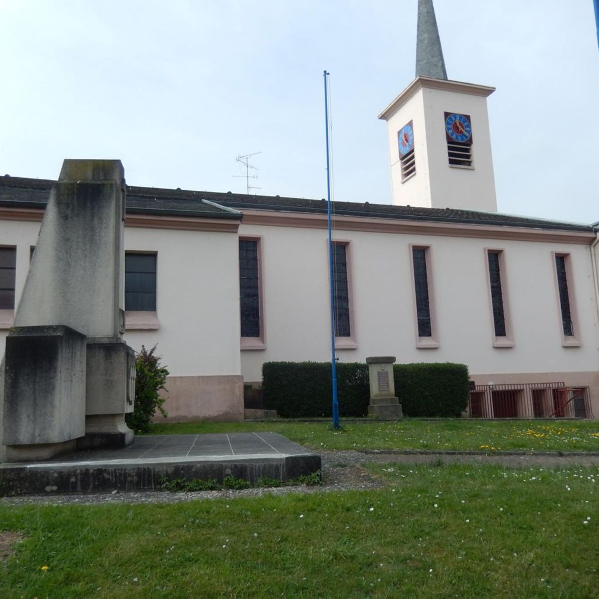 à une dizaine de mètres du monument aux morts communal, est adossé contre l'église.