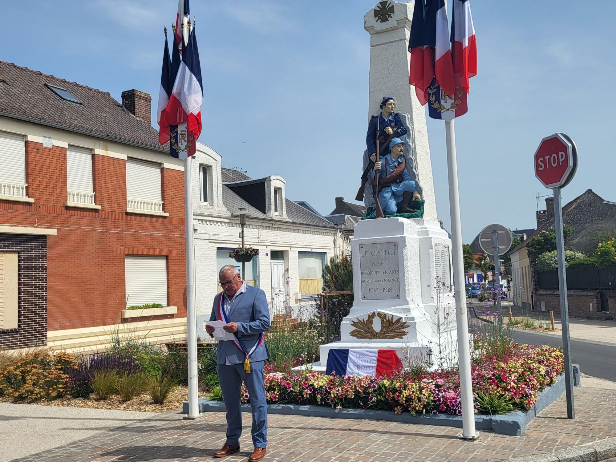 A l’occasion de la commémoration de l’Appel du 18-juin au Crotoy, Philippe Evrard, maire, a procédé à la lecture du discours officiel.Il y a 82 ans, le Général de Gaulle prononçait son fameux appel à la Résistance au peuple français, après la reddition du gouvernement de l’époque.Un appel qui faisait écho aux héros de la Grande Guerre, de ceux morts aux combats de 14-18 dont les monuments aux Morts célébraient pourtant déjà les noms et le souvenir tragique partout en France.C’est justement cette occasion qu’a choisi la municipalité du Crotoy pour célébrer aussi le centenaire de la construction du monument aux Morts.Avec une petite semaine d’avance, puisque la date d’inauguration était le 25 juin 1922, Monsieur le maire a rendu hommage à l’ensemble des combattants, et bien entendu insisté sur le sens de l’Histoire et l’impérieux devoir de Mémoire.A cette occasion, la municipalité a changé la plaque commémorative disposé au pied du monument aux Morts crotellois ce 25 juin 1922, et cassé par les assauts du temps, par une nouvelle similaire, marquant toutefois le coup de cette réédition à l’occasion du centenaire du lieu.Une marque aussi que le Souvenir des Morts pour la France est toujours bien vivace dans notre société, et certainement plus que jamais nécessaire.