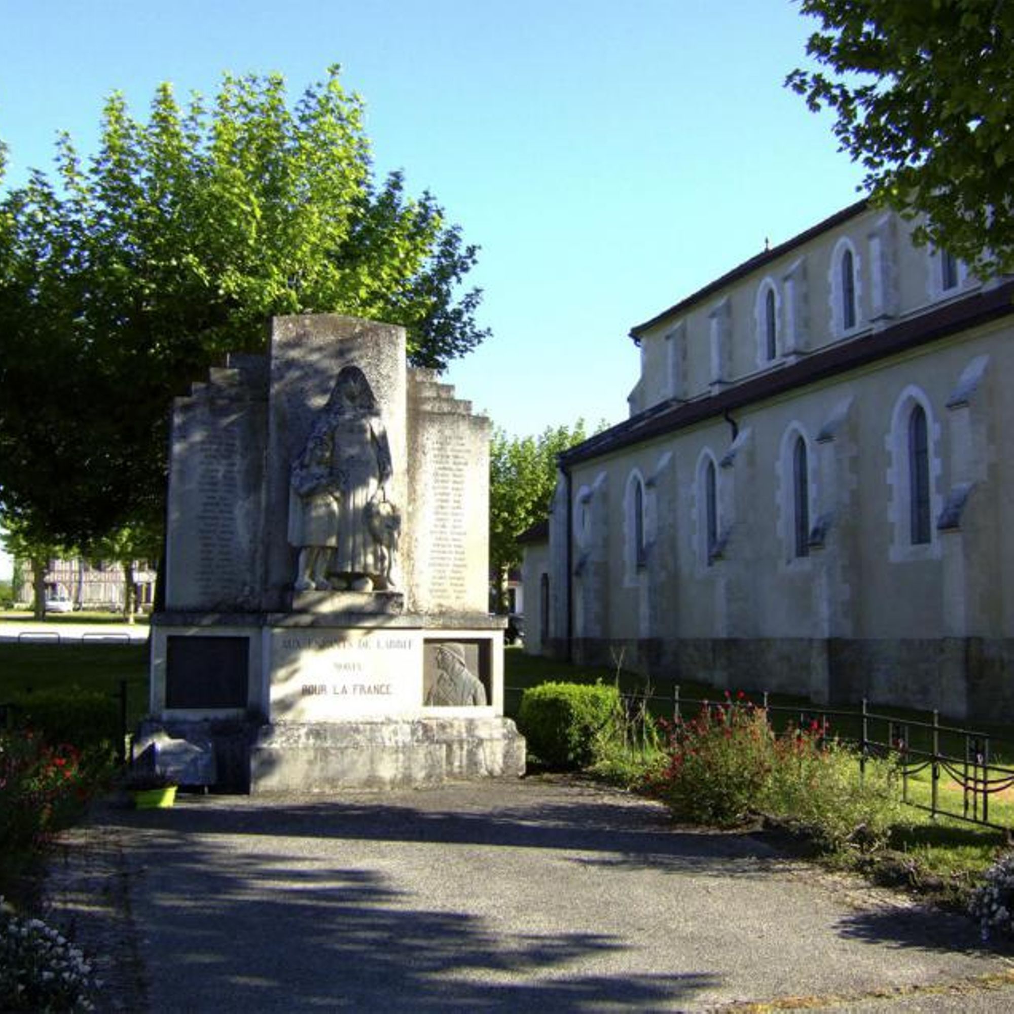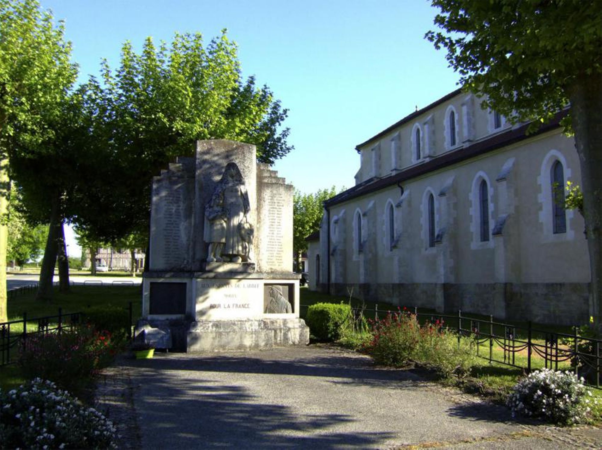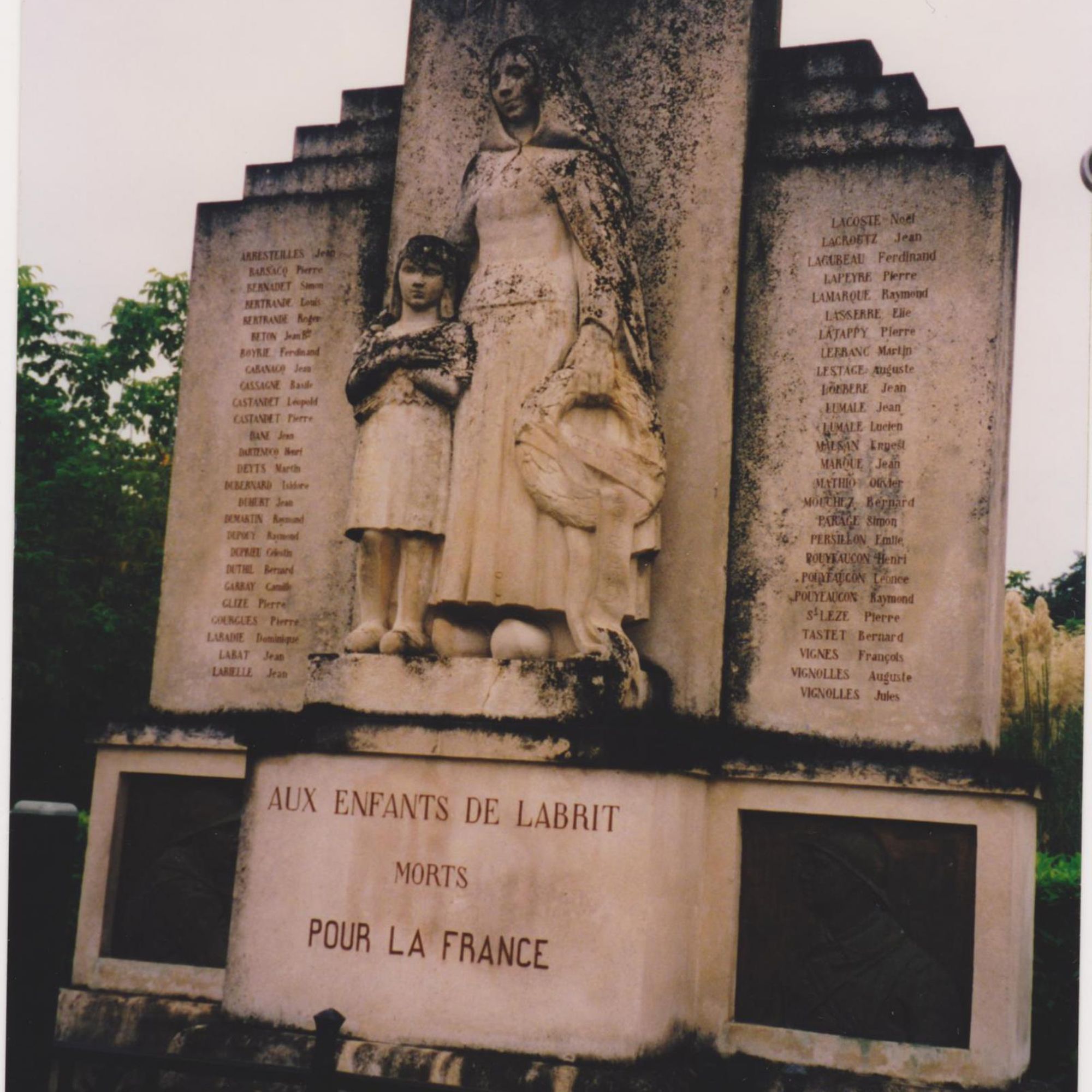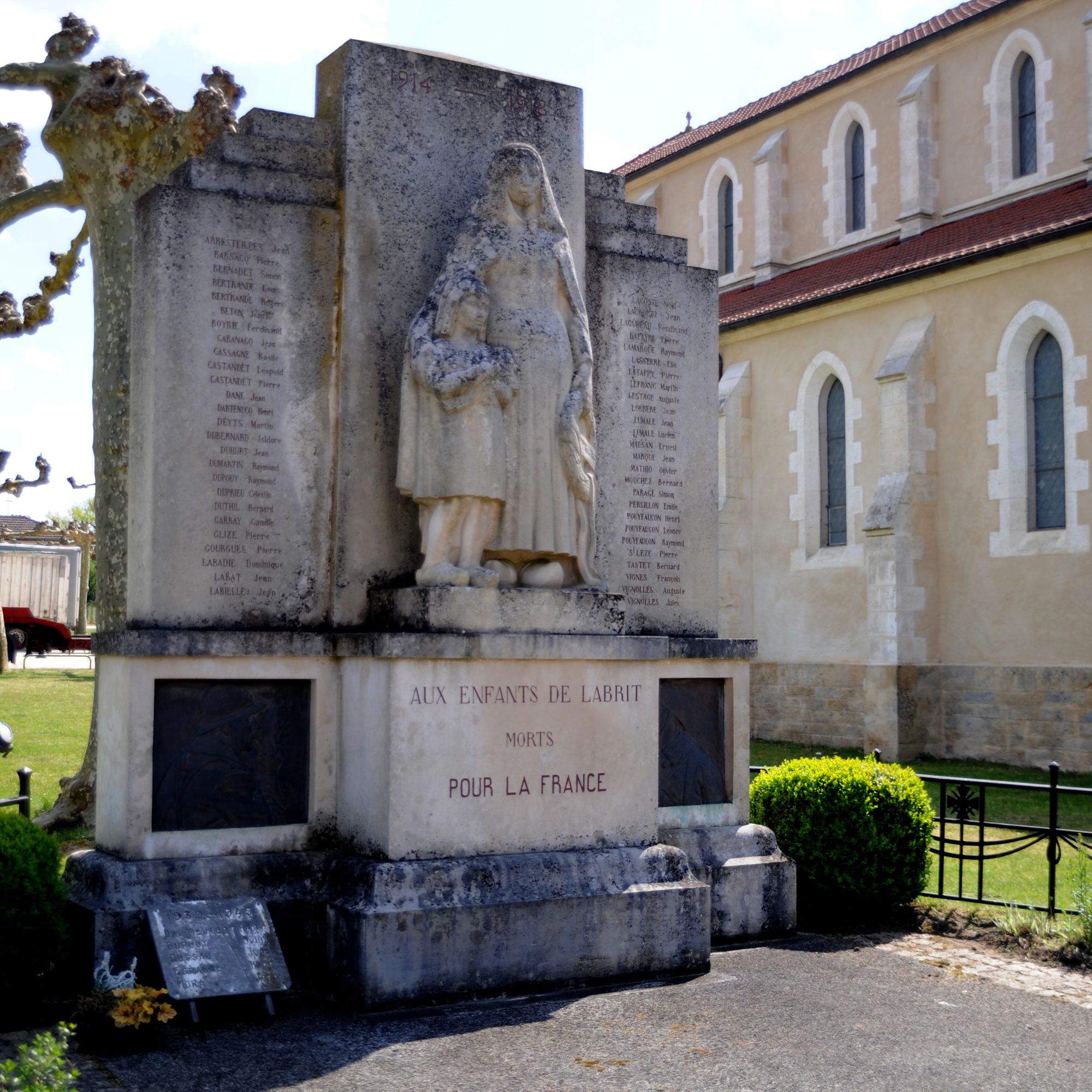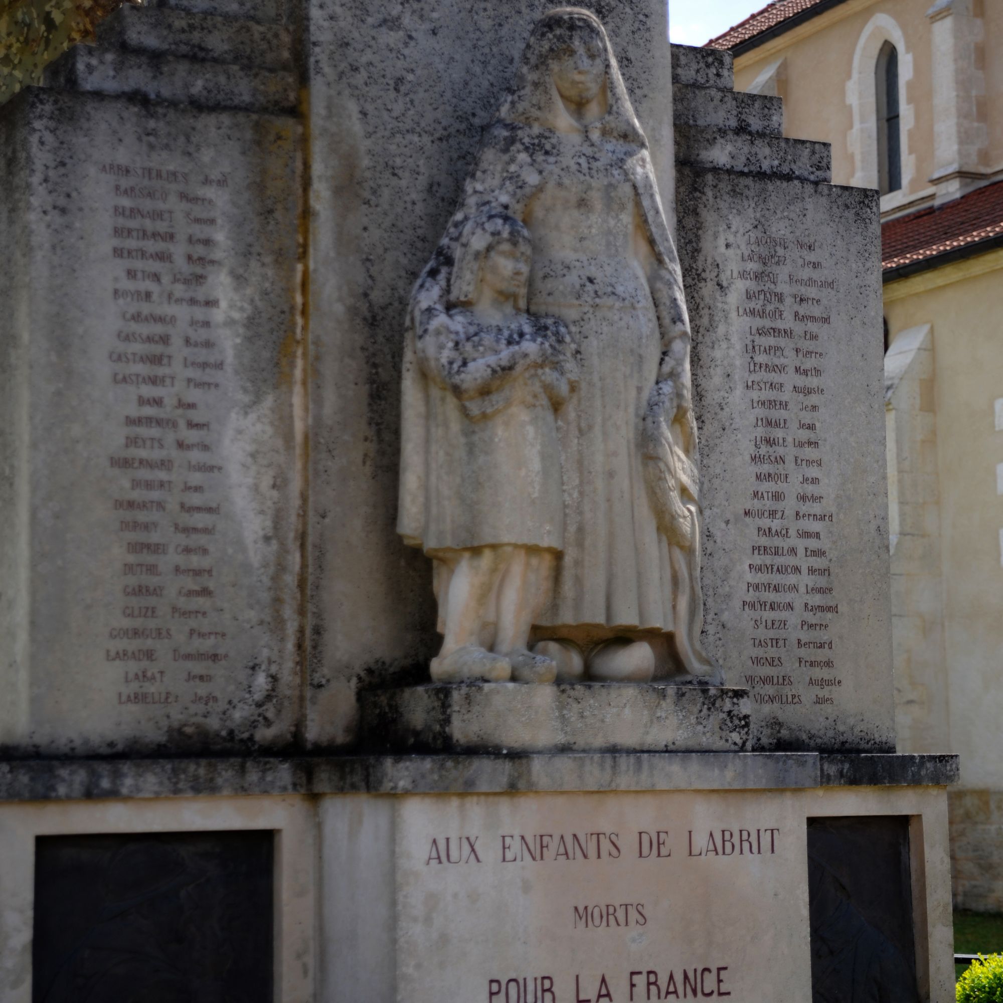 en dessous un bloc rectangulaire avec mention AUX ENFANTS DE LABRIT MORTS POUR LA FRANCE de chaque côté, un bas-relief figure deux profils de poilus, un jeune et un vieux.