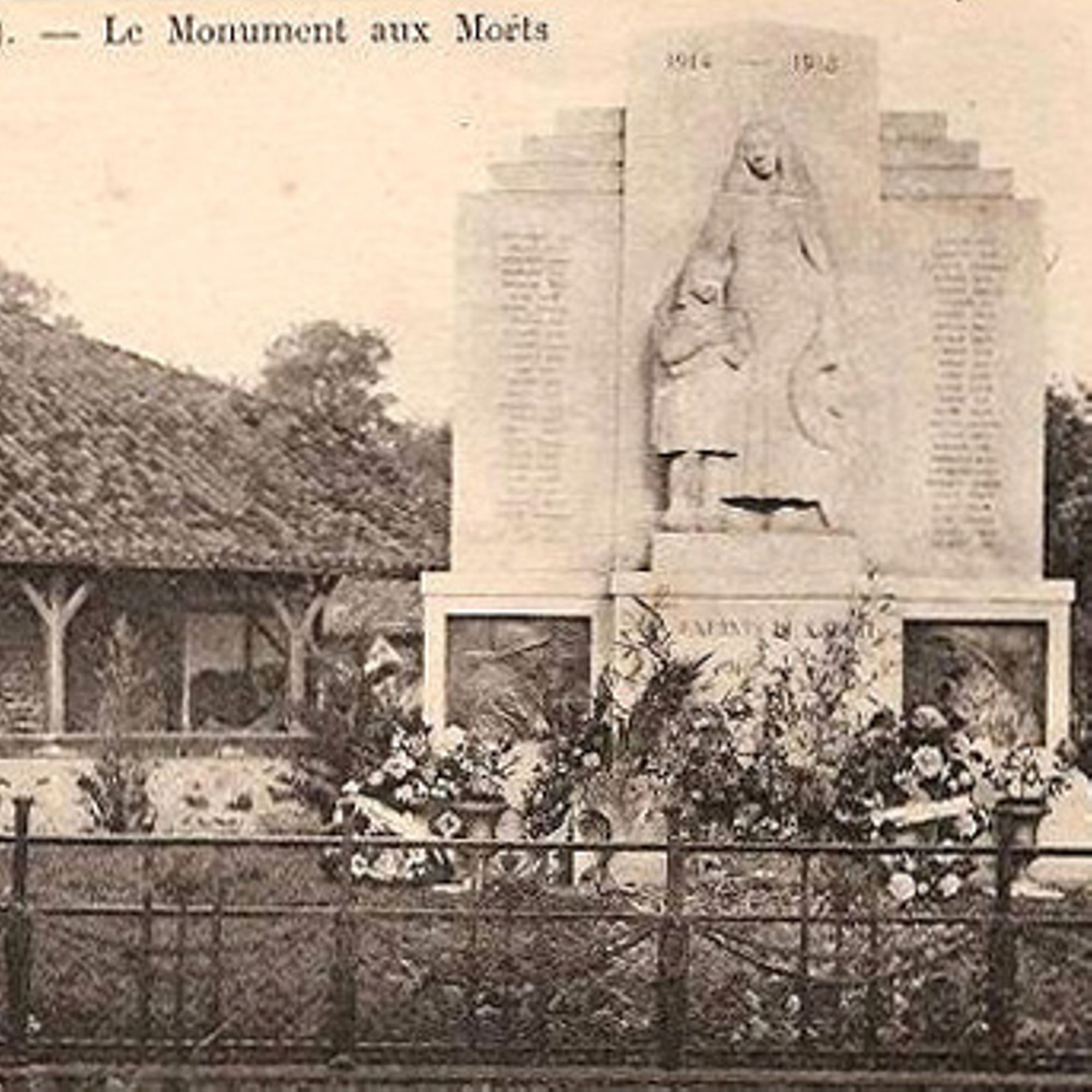 Une sculpture centrale représentant une veuve en tenue régionale chaussée de sabots tenant dans main gauche une couronne de fleurs et à sa droite sa fillette les bras croisés