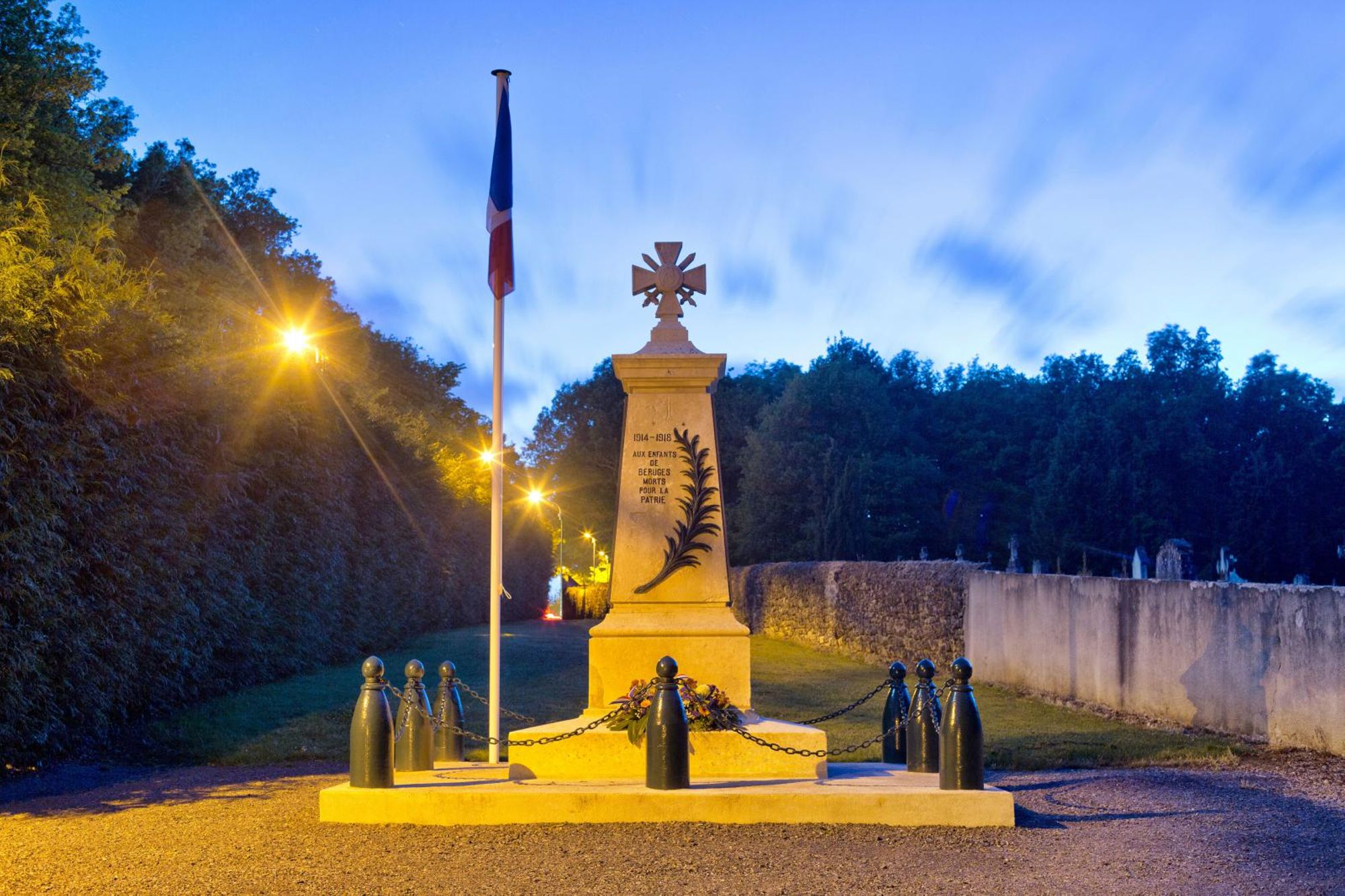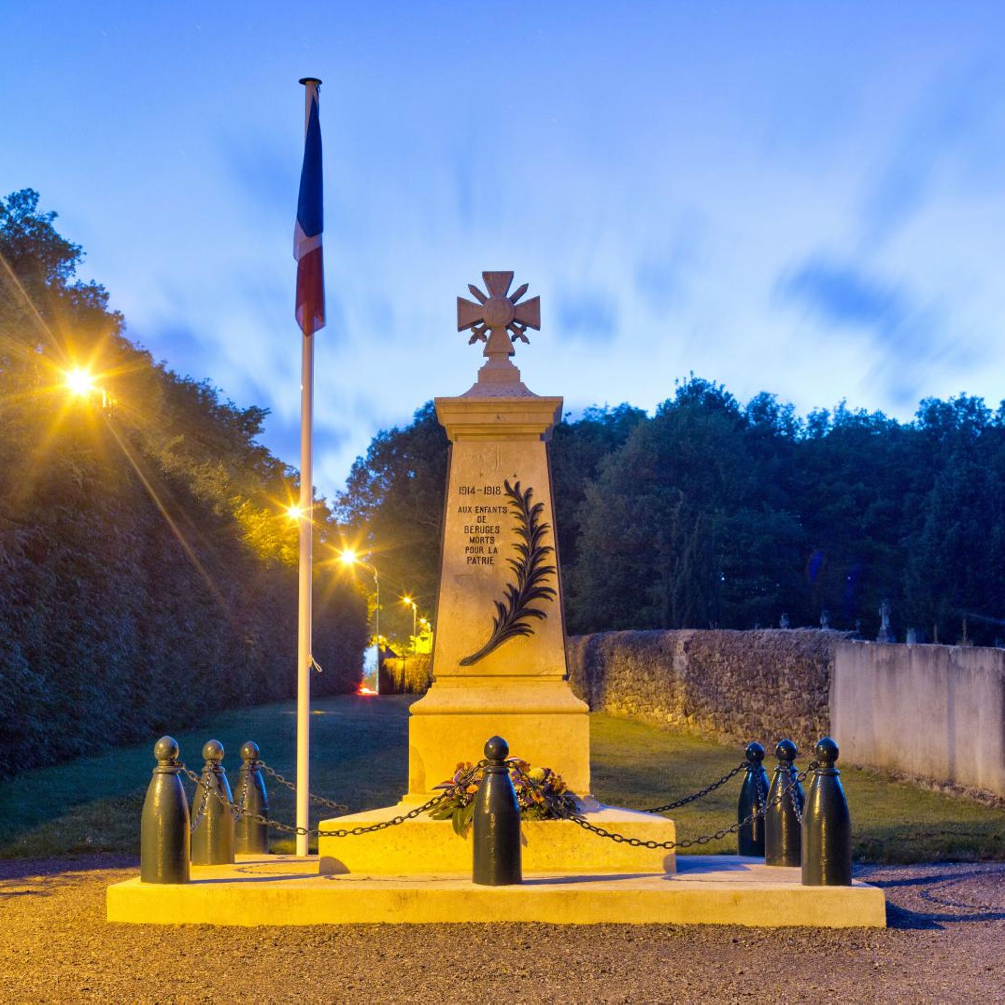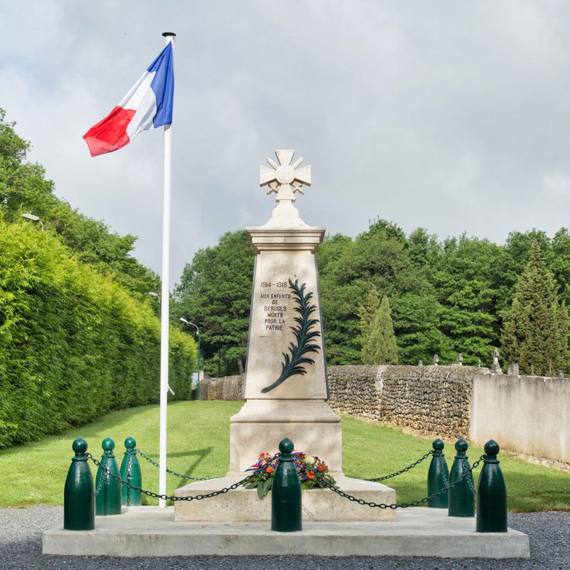 Enfin le 13 août 1922, le conseil approuve le projet d'entourage avec des bornes métalliques en forme d'obus reliées par une chaine en fer ; derrière le monument seront plantés "des arbustes à feuilles persistantes et de rapide croissance pour faire fond"