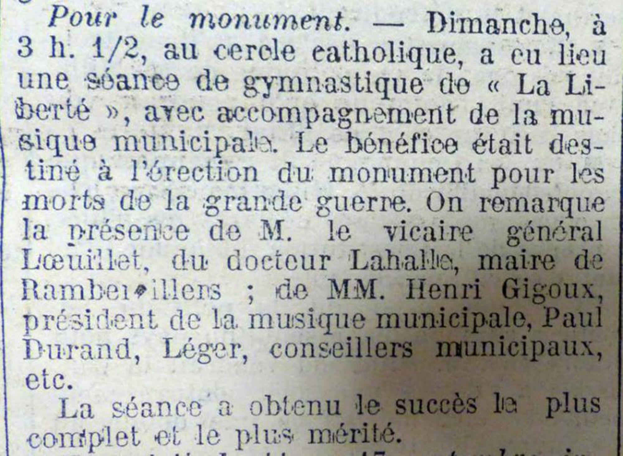 Dimanche à 3h 1/2 au cercle catholique, a eu lieu une séance de gymnastique de La Liberté", avec accompagnement de la musique municipale. Le bénéfice était destiné à l'érection du monument pour les morts de la grande guerre.