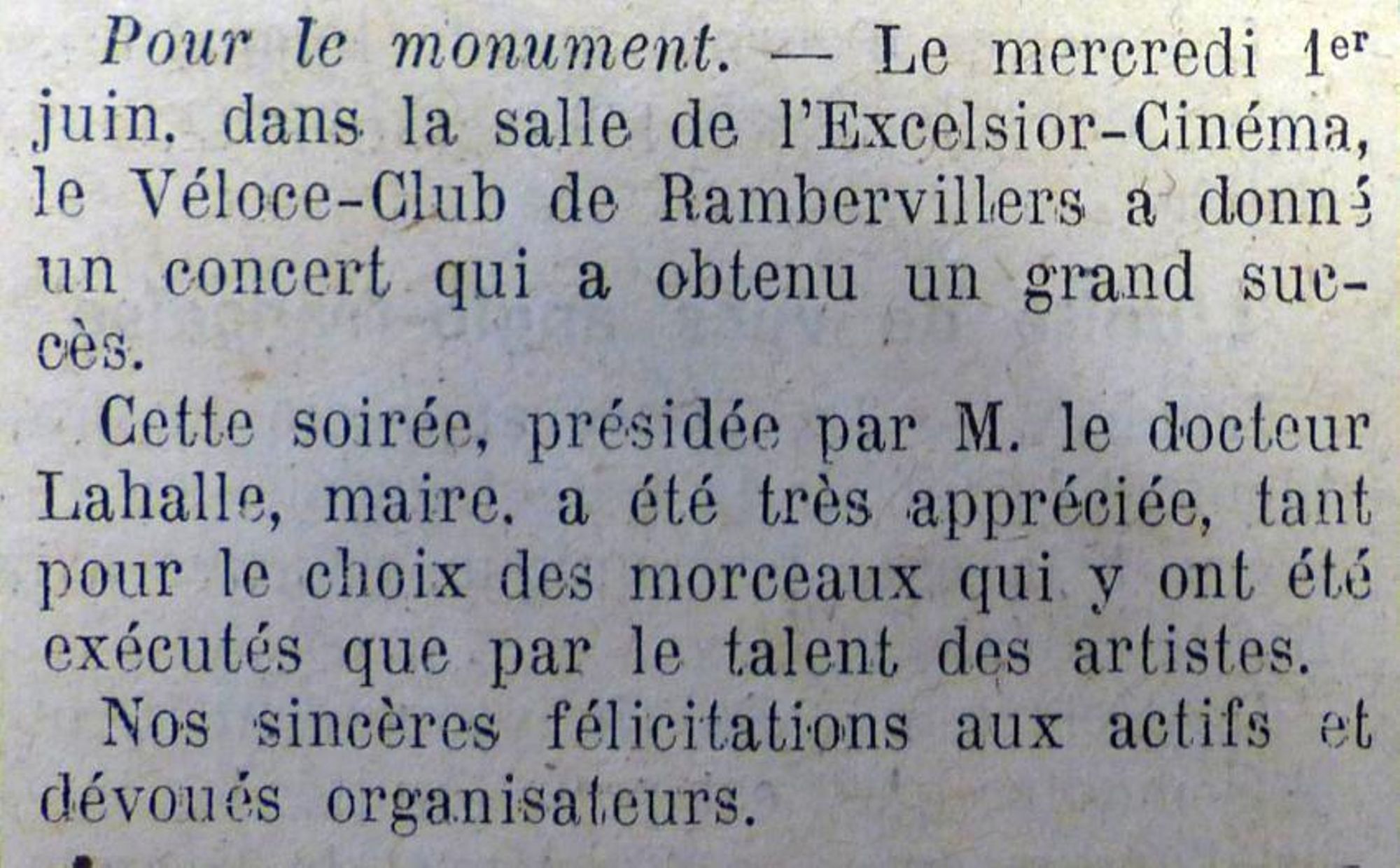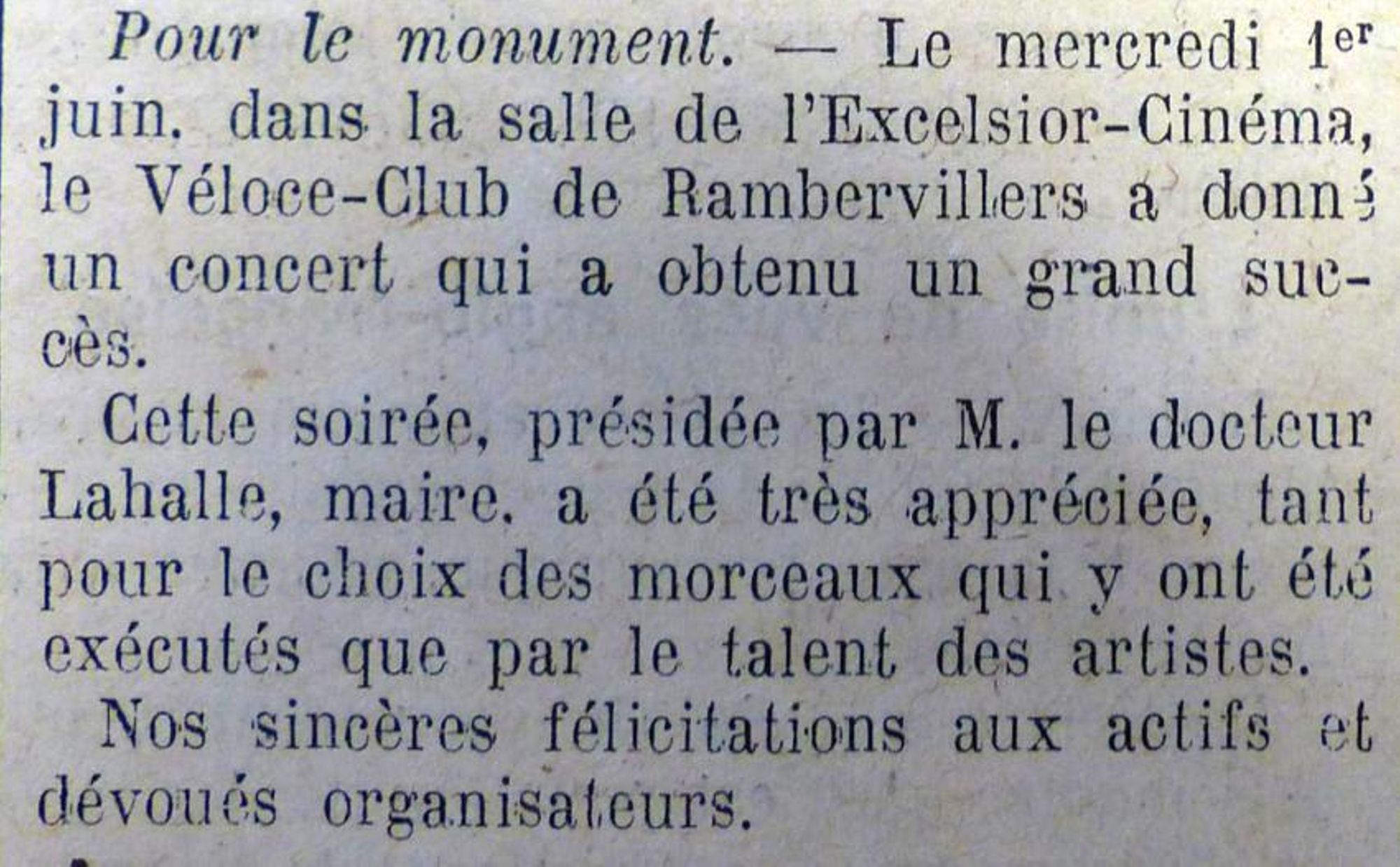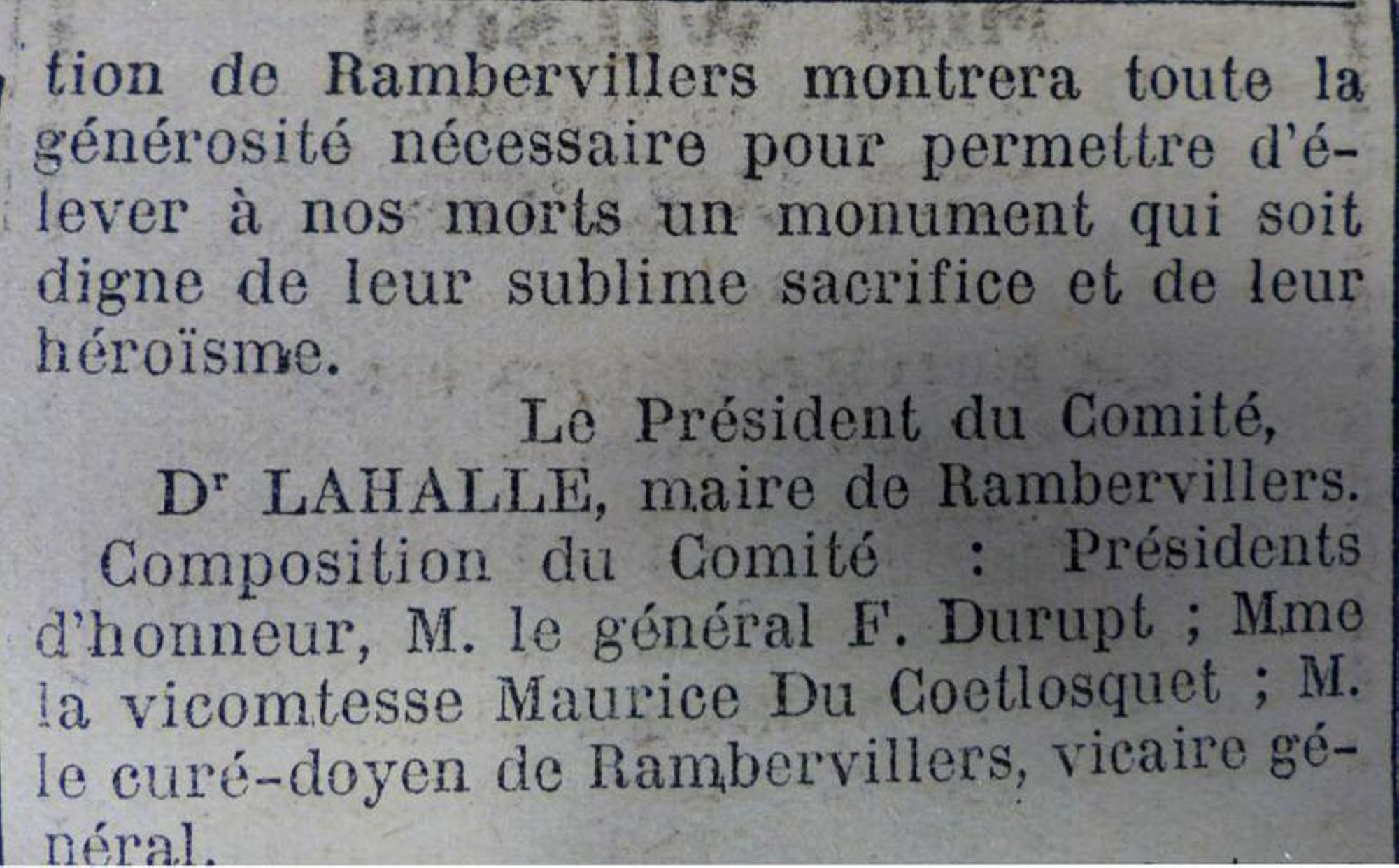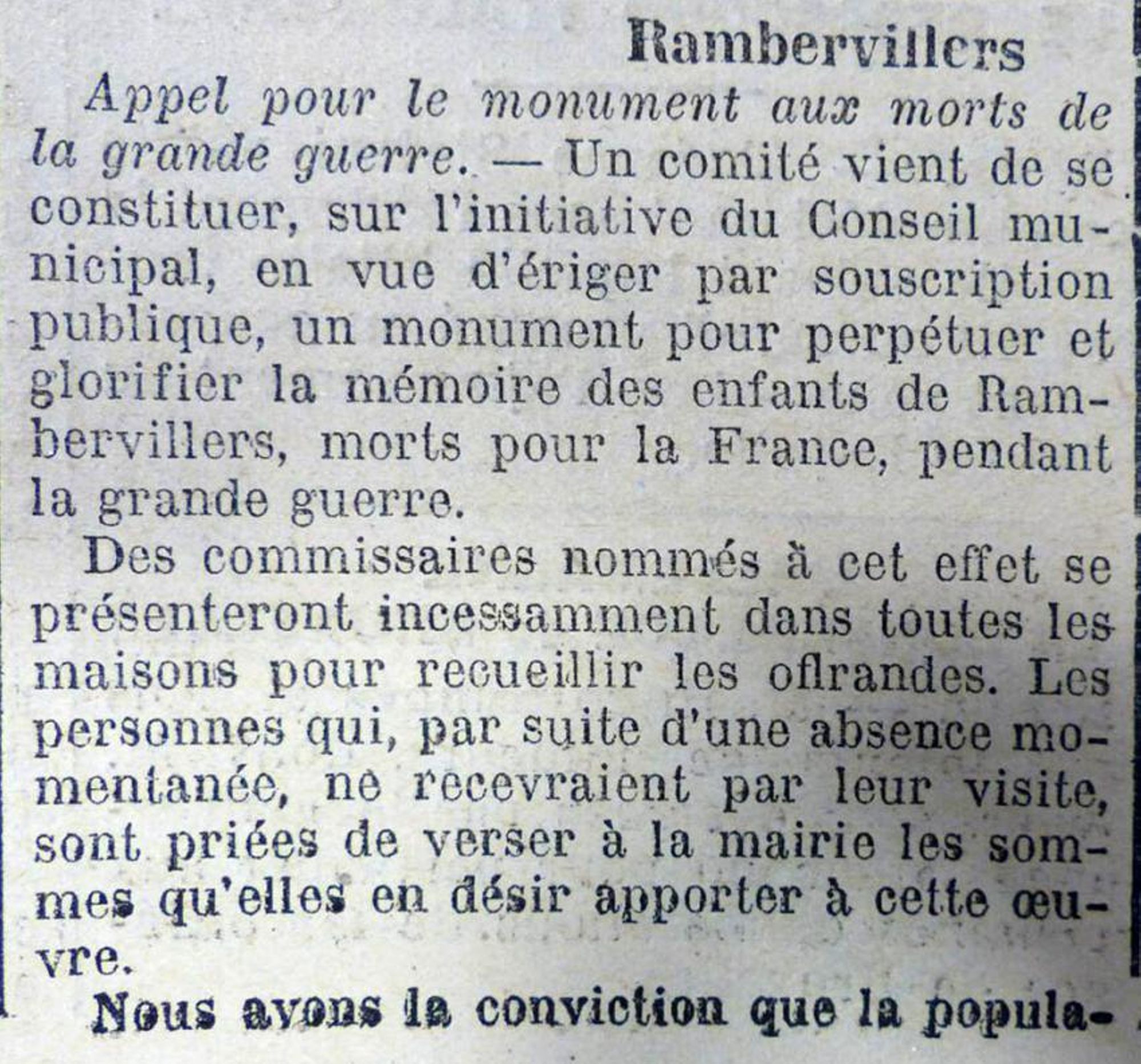 Nous avons la conviction que la population de Rambervillers montrera toute la générosité nécessaire pour permettre d'élever à nos morts un monument qui soit digne de leur sublime sacrifice et de leur héroïsme.