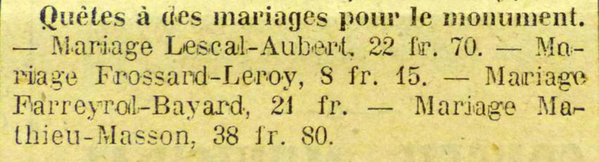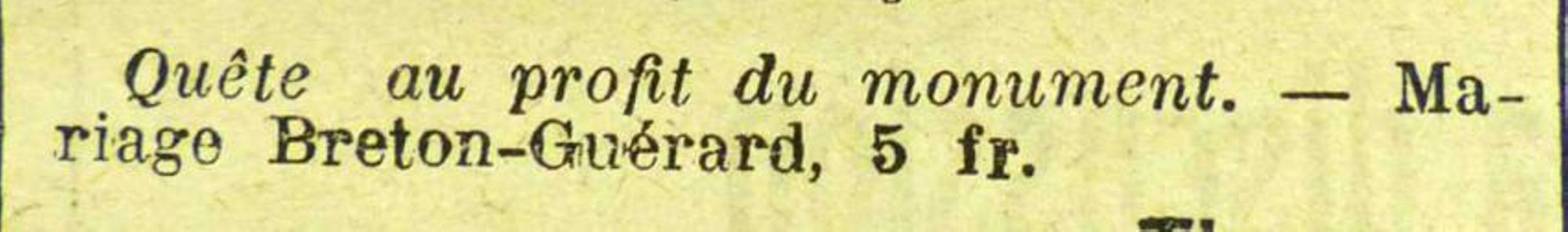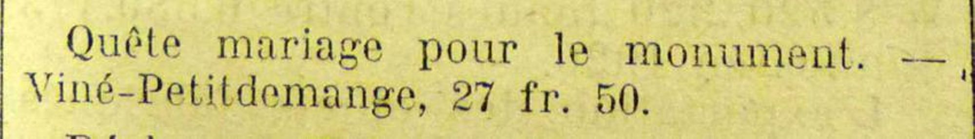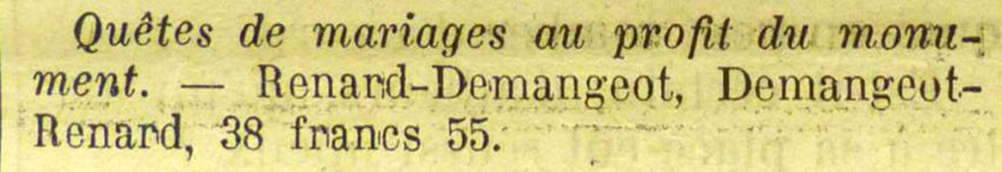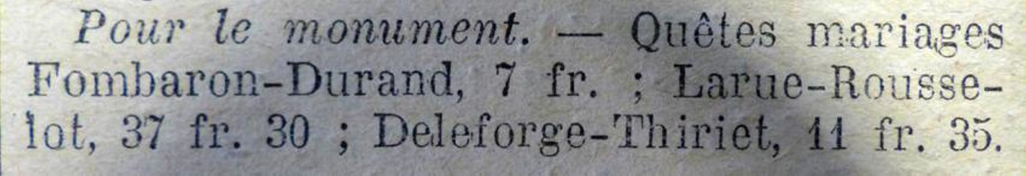 Des commissaires nommés à cet effet se présenteront incessamment dabs toutes les maisons pour recueillir les offrandes. Les personnes qui, par la suite d'une absence momentanée, ne recevraient pas leur visite, sont priées de verser à la mairie les sommes qu'elles en désir apporter à cette oeuvre.