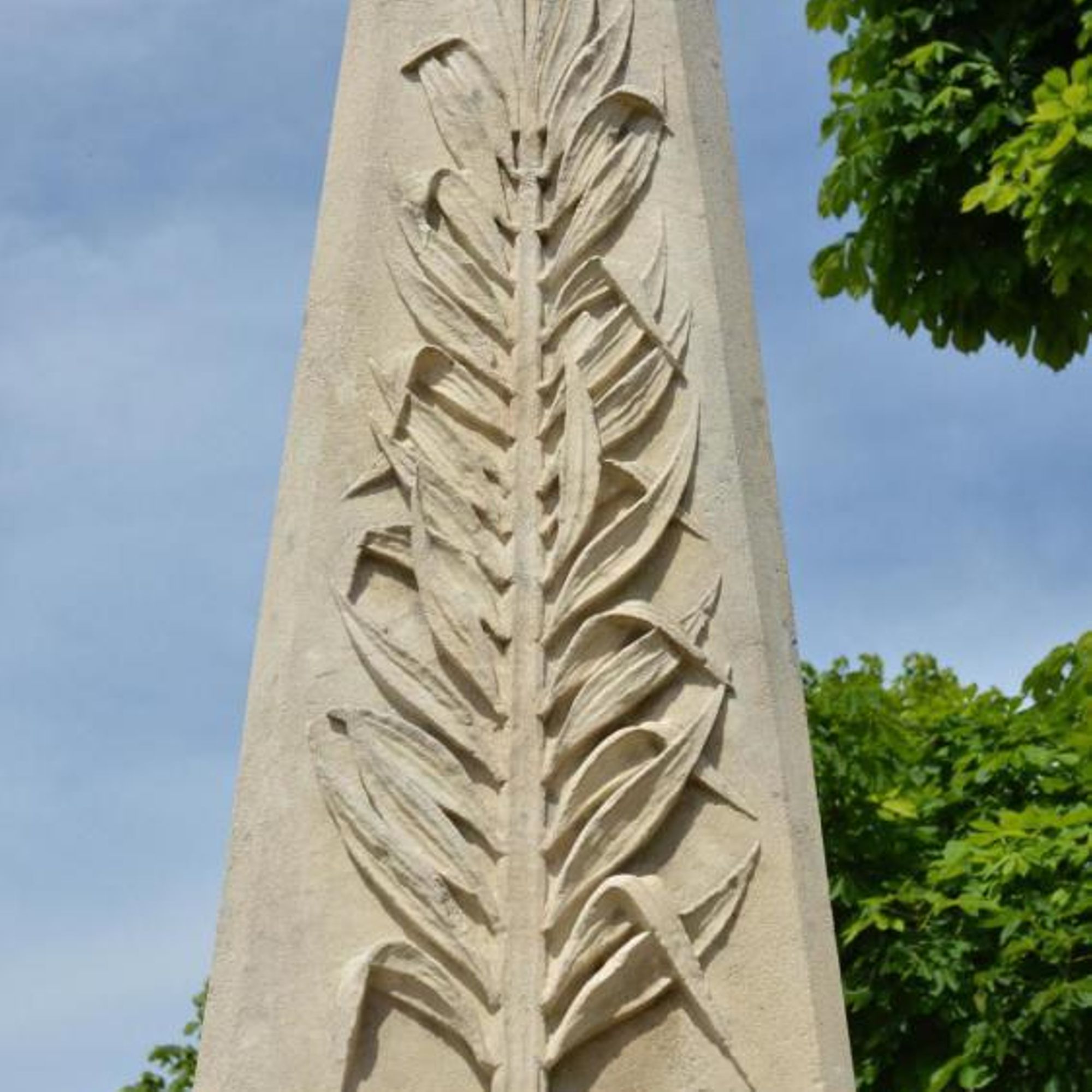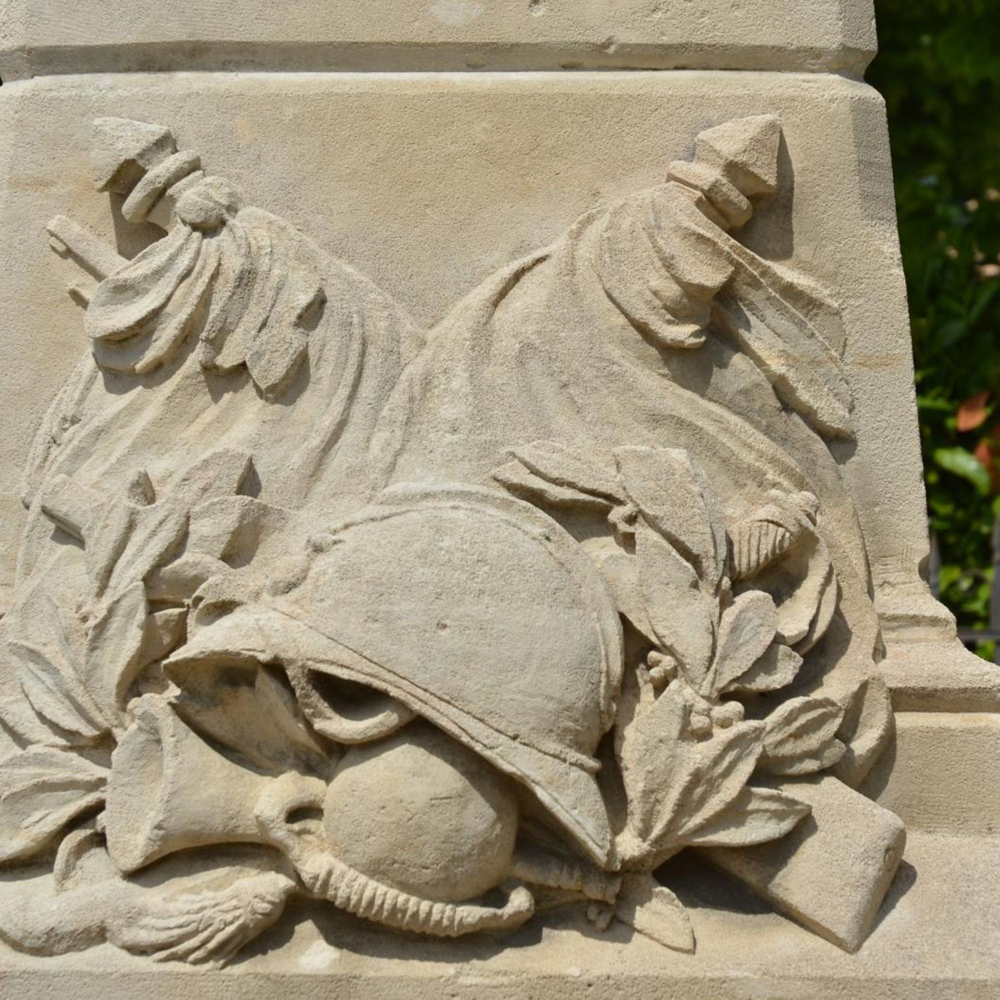 Ornement sur la face avant, sur l'obélisque: casque, drapeau, laurier et au-dessus une palme.