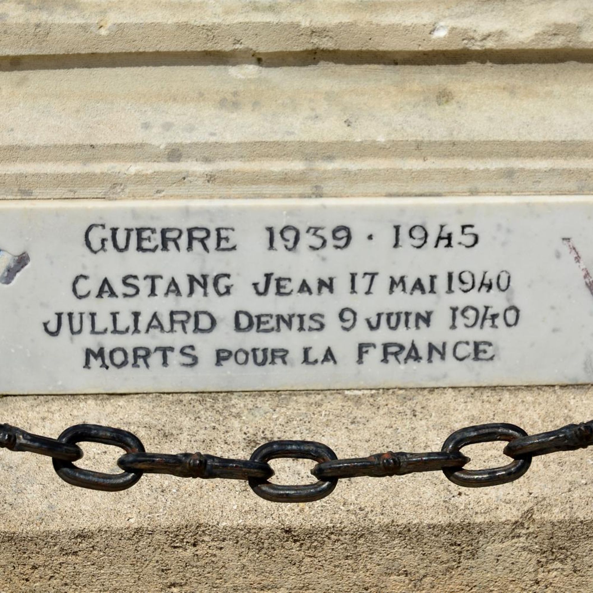 une plaque sur la face avant, au pied du monument pour les 3 morts de 1939-45.