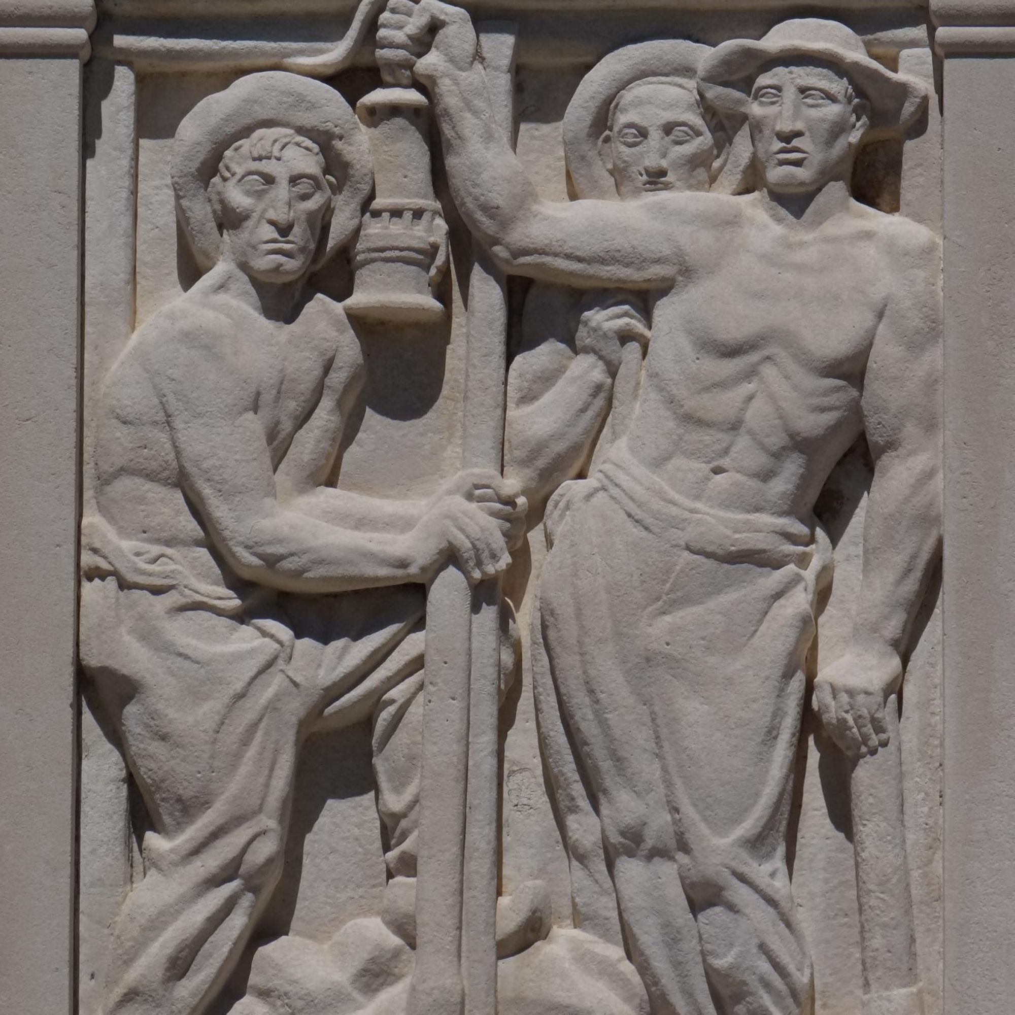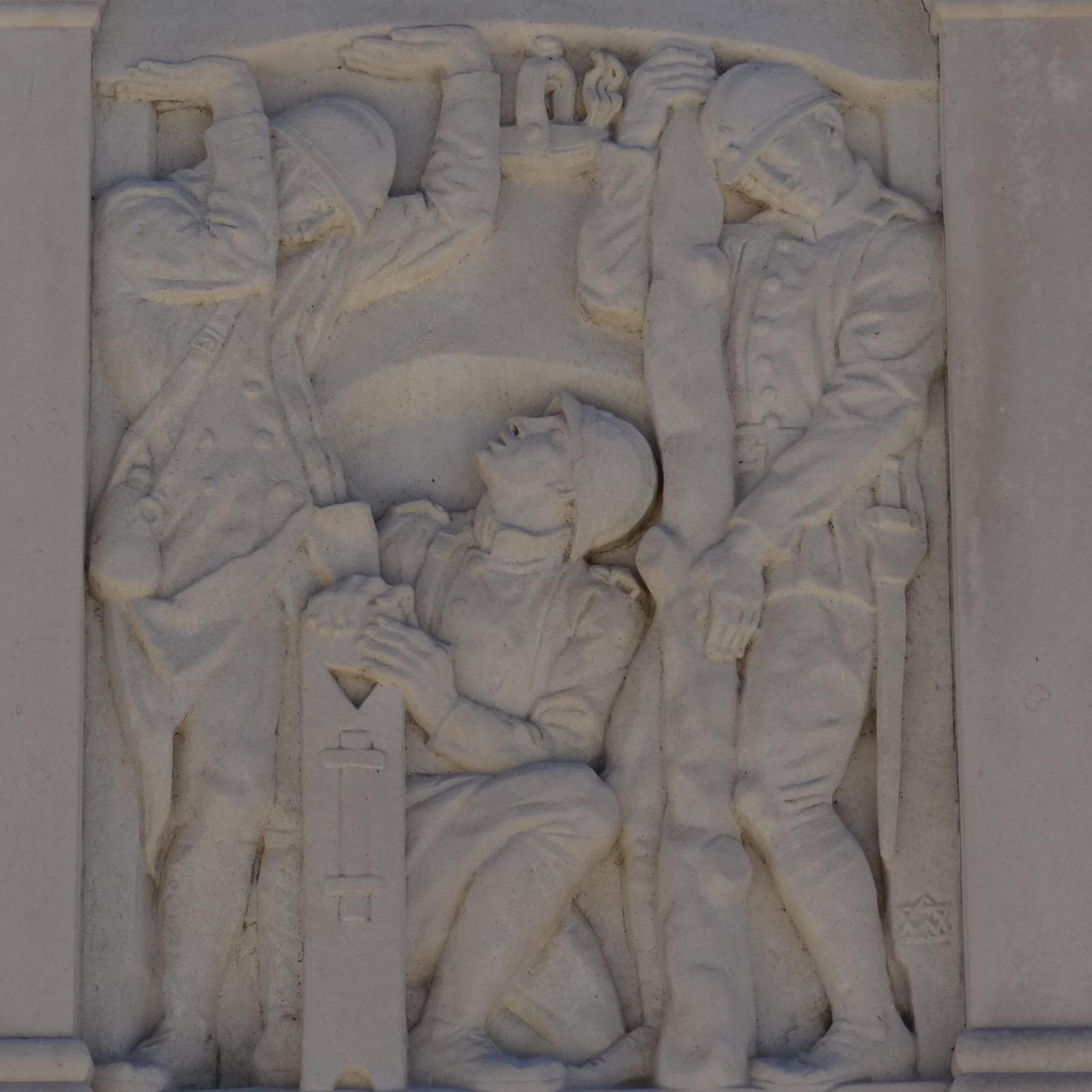 Il ne manqua pas de se rendre sur place, de descendre dans la mine et d’y observer les hommes à l’ouvrage. Il souhaitait mettre le travail à l’honneur à travers ce Monument. Malheureusement, les Elus de l’époque n’étaient pas tout à fait d’accord avec cette idée. Aussi, Bourdelle laissa traîner ses recherches et s’attaqua à d’autres ouvrages où il était libre de créer à sa guise. Puis on finit par lui laisser le champ libre et il fit alors diverses études de mineurs et de soldats et réalise les bas-reliefs.