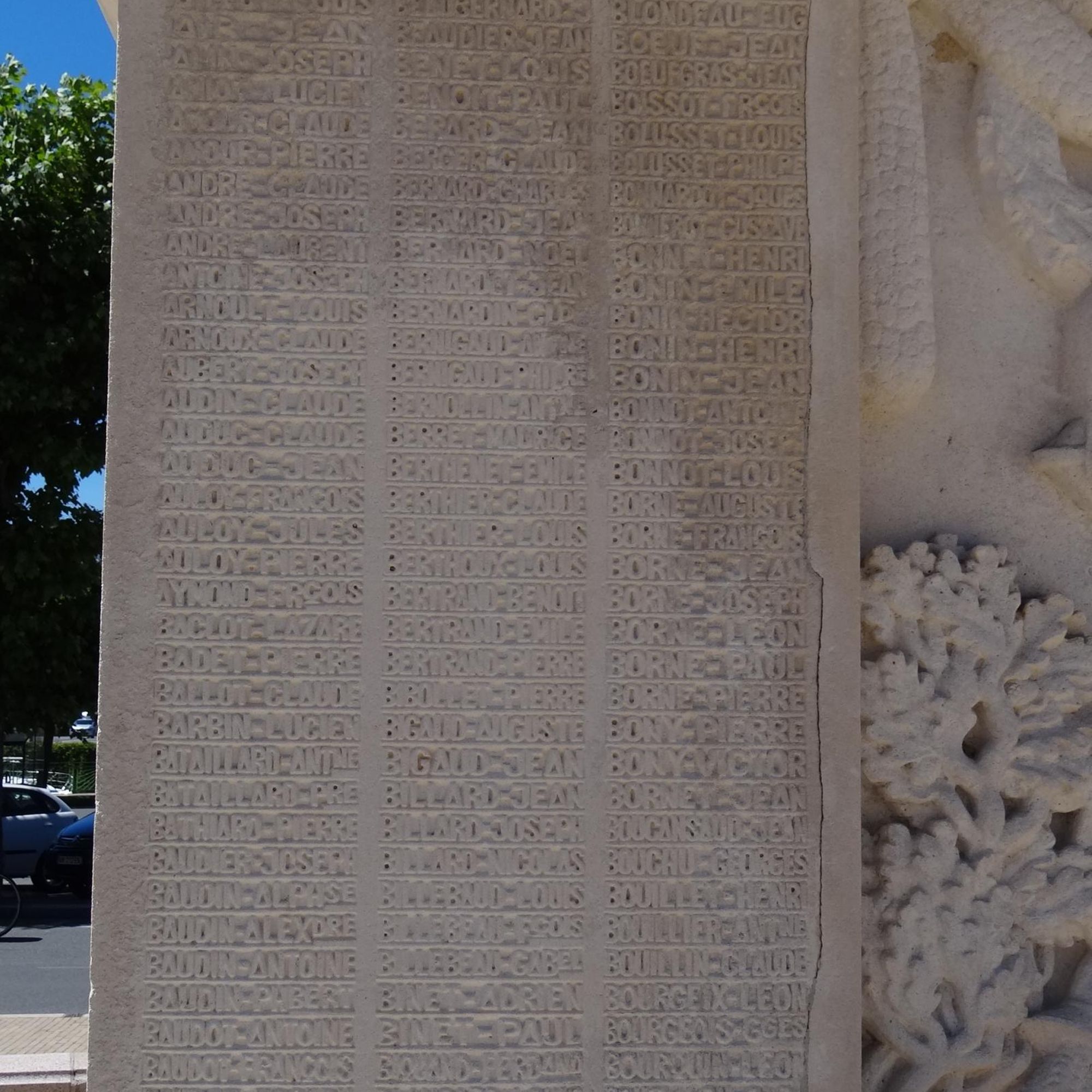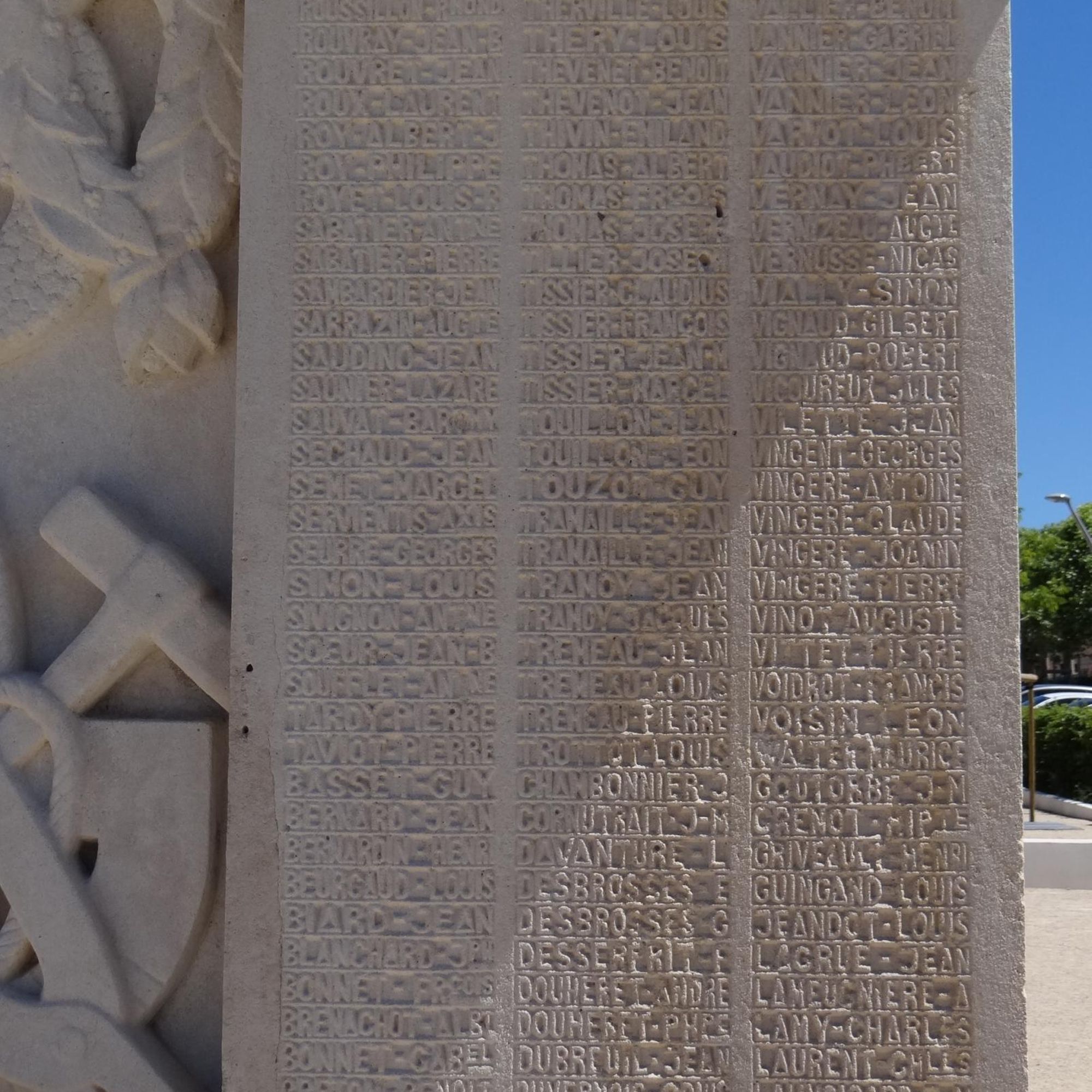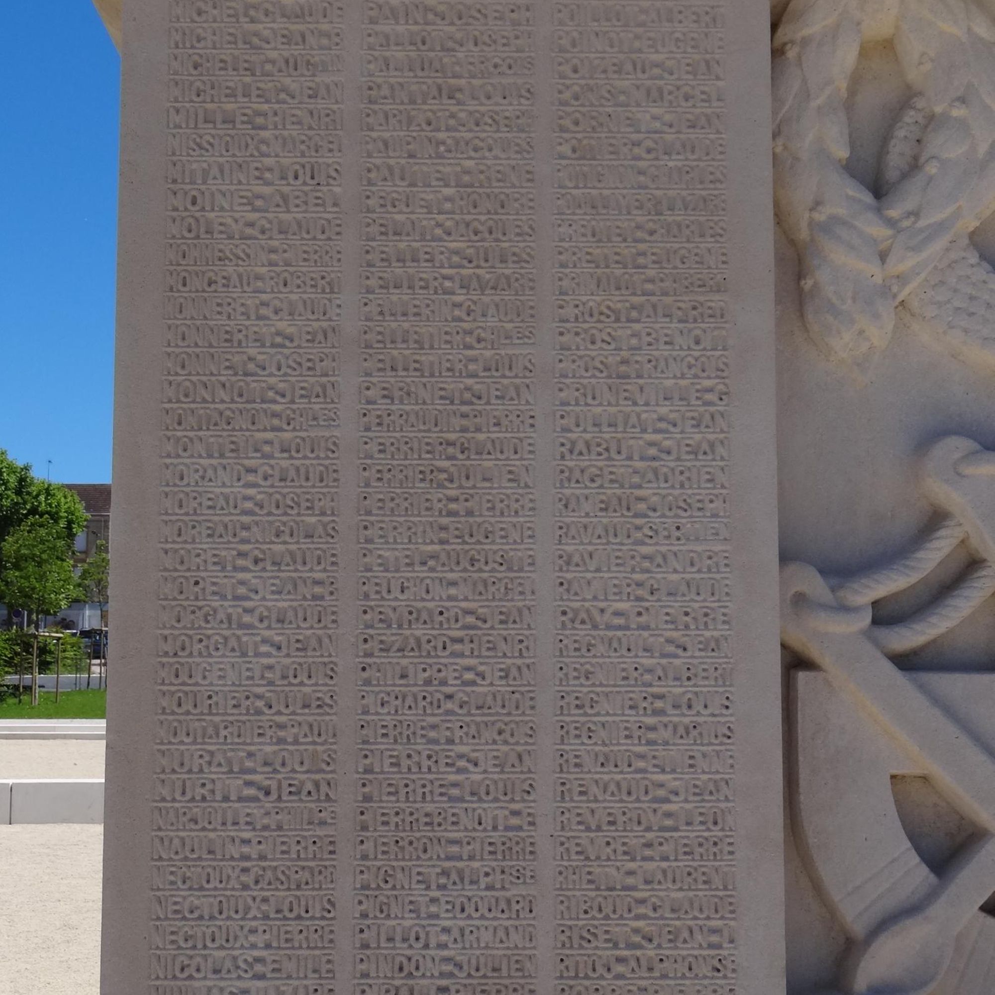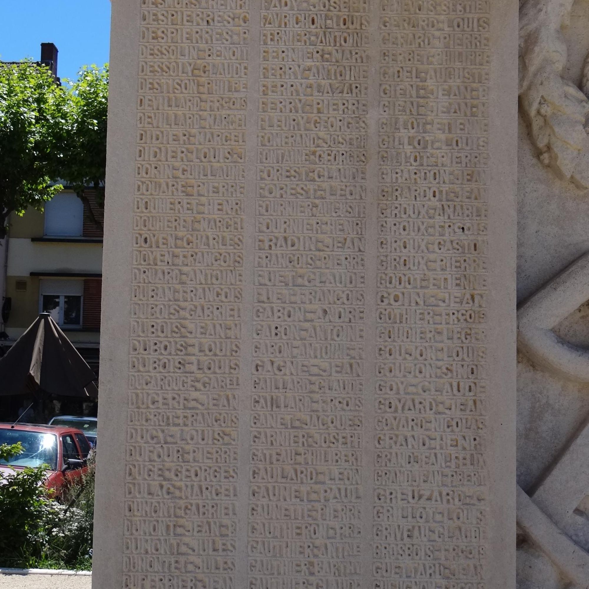 Quant aux quatre médaillons, à la gloire du travail, ils offrent quatre collections d’instruments ou d’outils. Ils illustrent la partie basse du socle où sont inscrits, gravés dans la pierre un à un par Bourdelle, les 690 noms des soldats morts pour la Patrie, originaires de Montceau, mais aussi de Saint-Vallier, Blanzy, Ciry, Gourdon, Saint-Bérain et Pouilloux. Plus tard, le monument fut complété par les noms des morts de la guerre de 1939-1945.