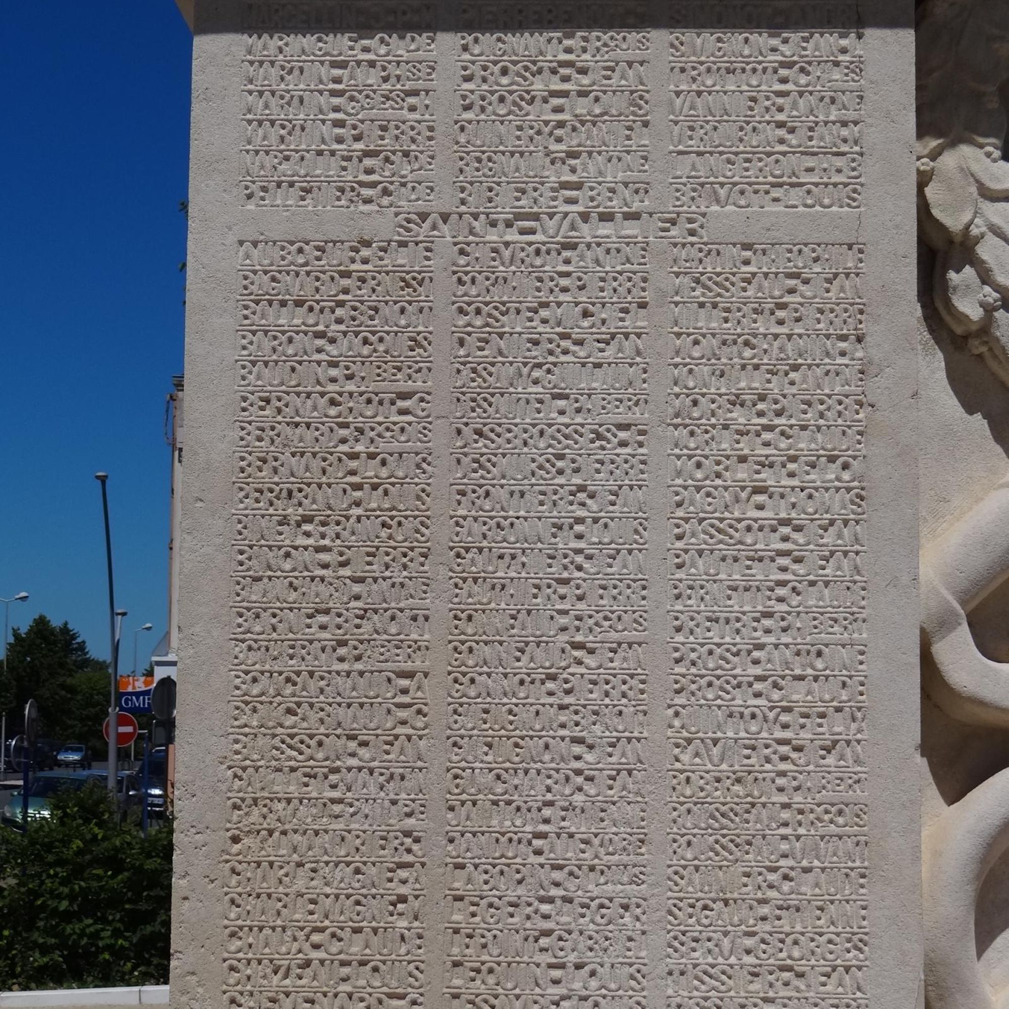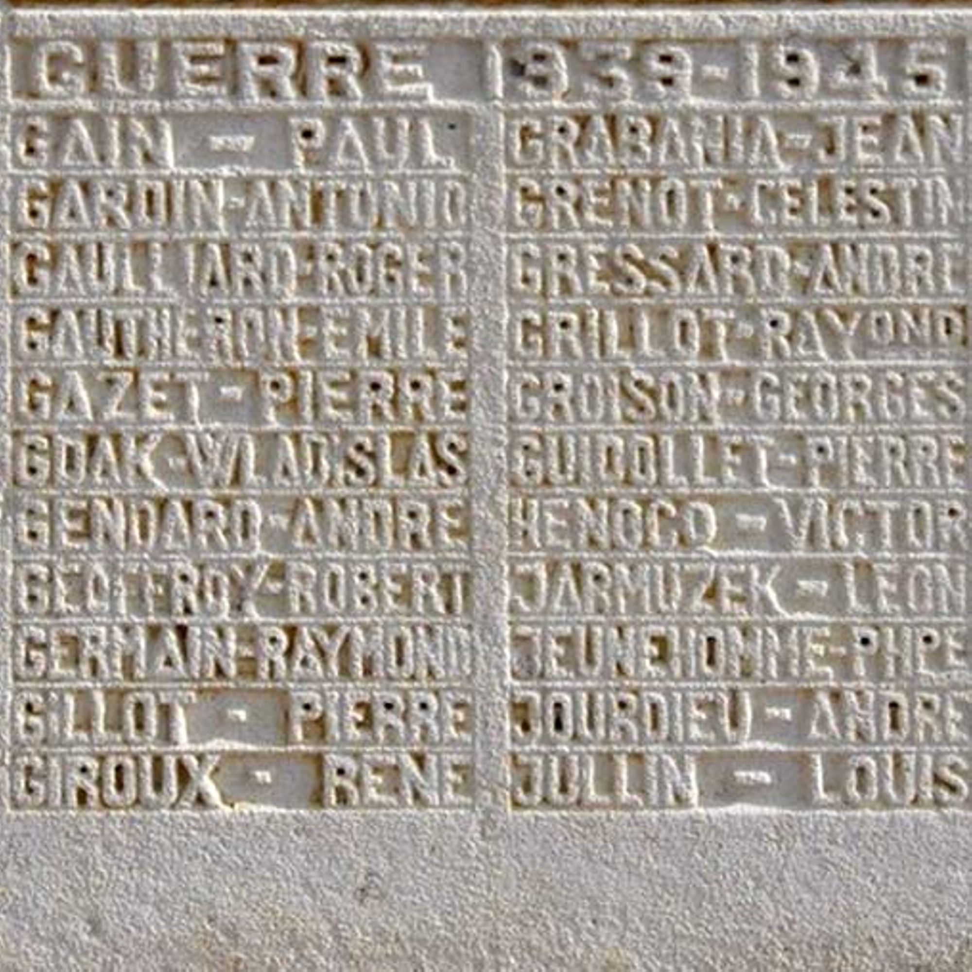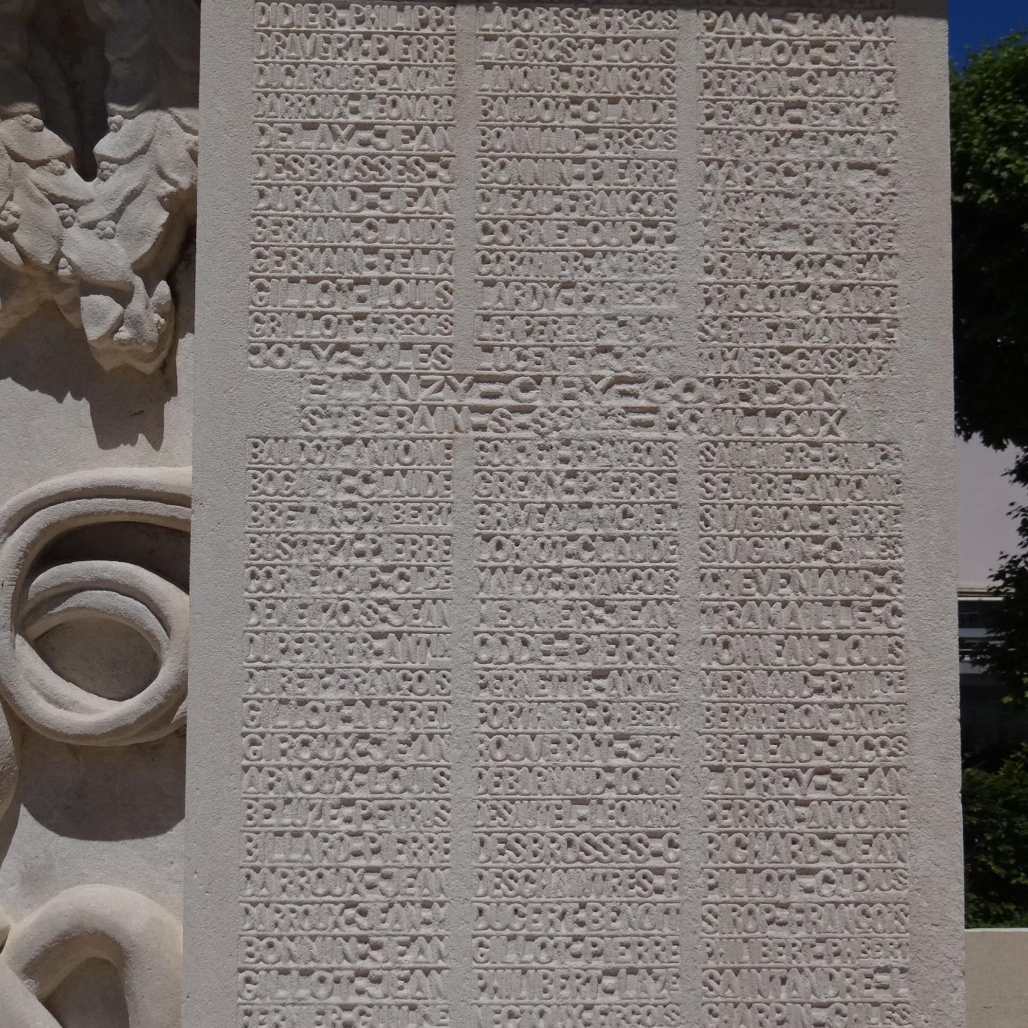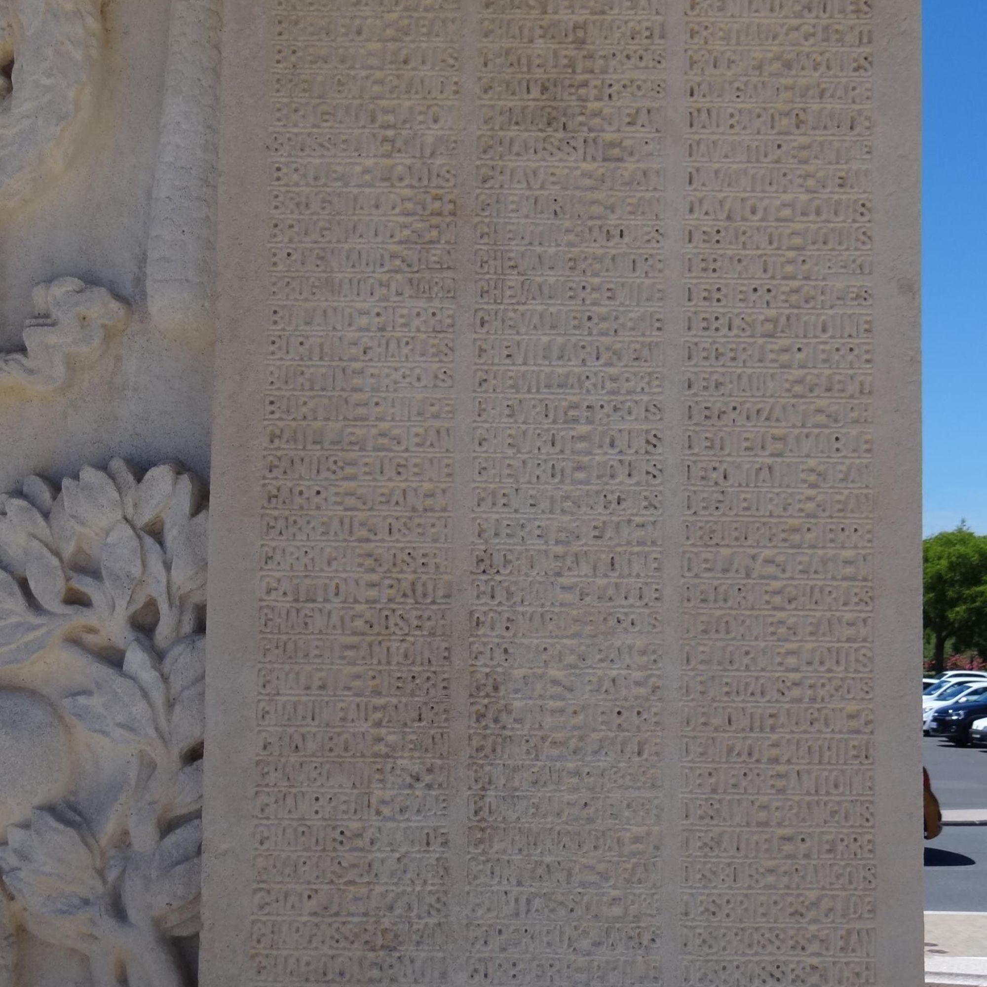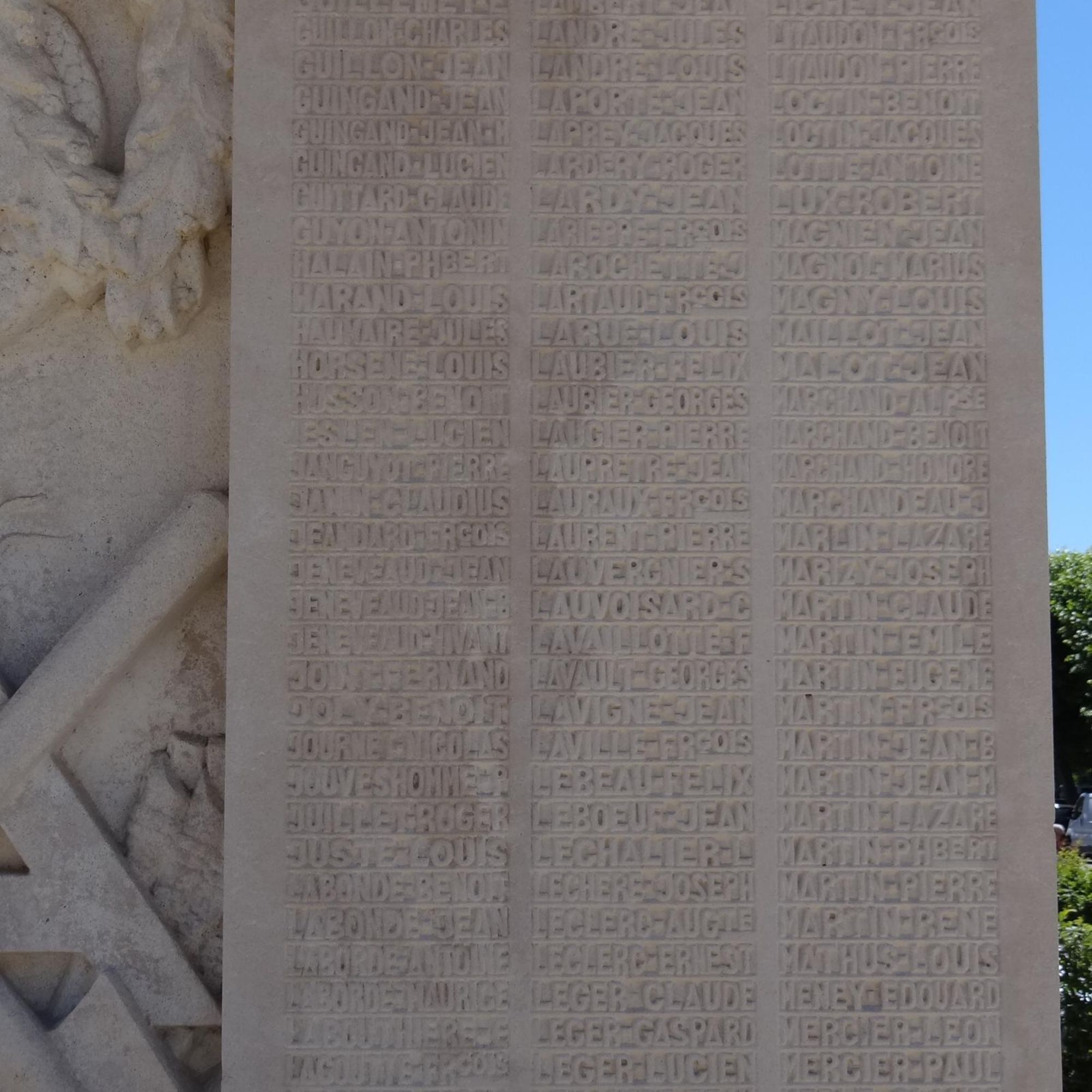 Quant aux quatre médaillons, à la gloire du travail, ils offrent quatre collections d’instruments ou d’outils. Ils illustrent la partie basse du socle où sont inscrits, gravés dans la pierre un à un par Bourdelle, les 690 noms des soldats morts pour la Patrie, originaires de Montceau, mais aussi de Saint-Vallier, Blanzy, Ciry, Gourdon, Saint-Bérain et Pouilloux. Plus tard, le monument fut complété par les noms des morts de la guerre de 1939-1945.