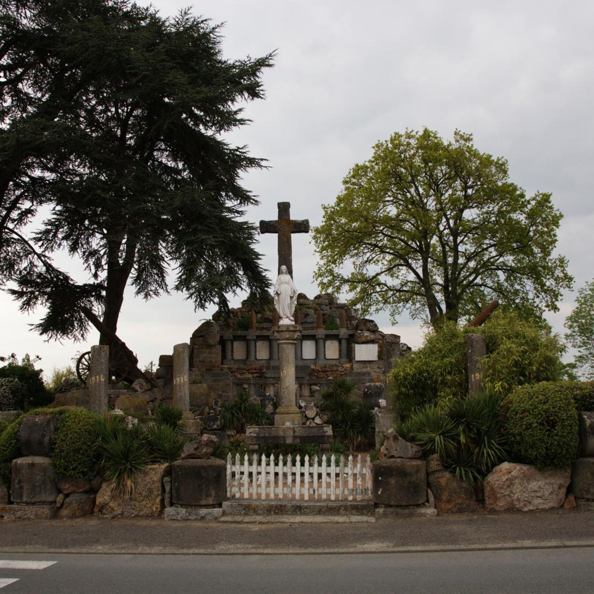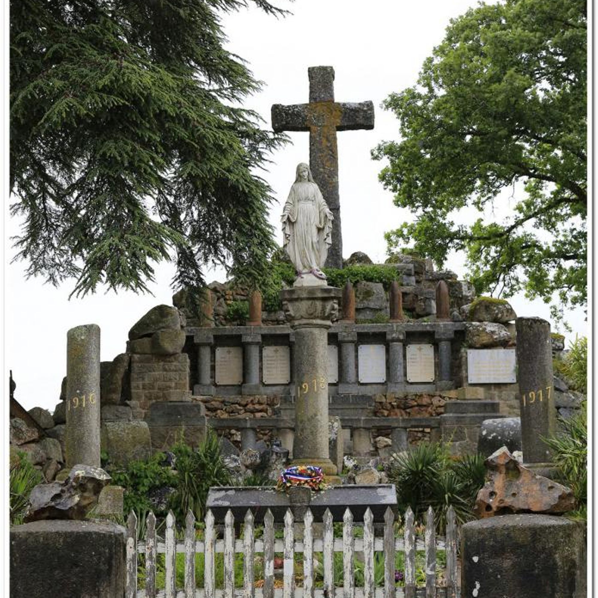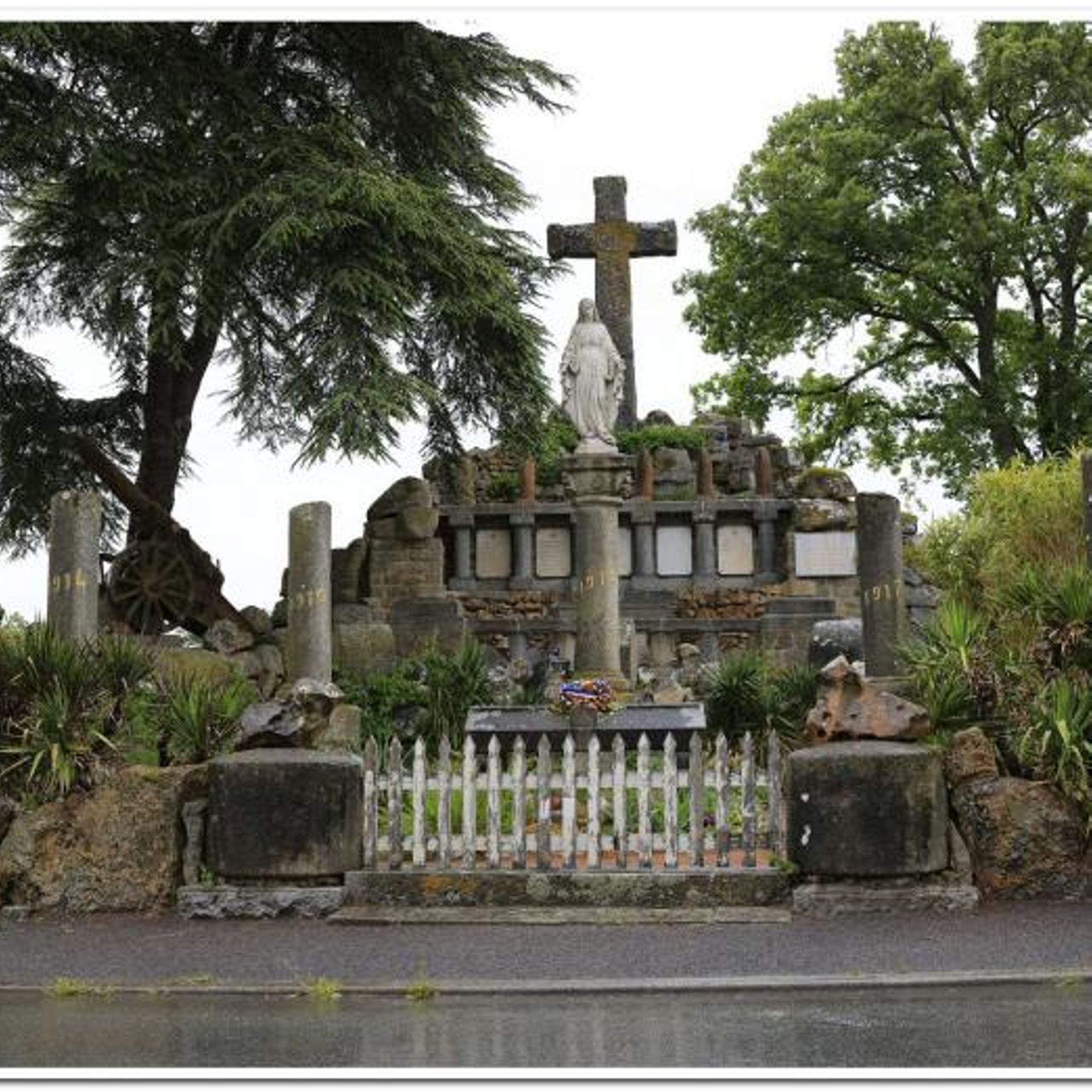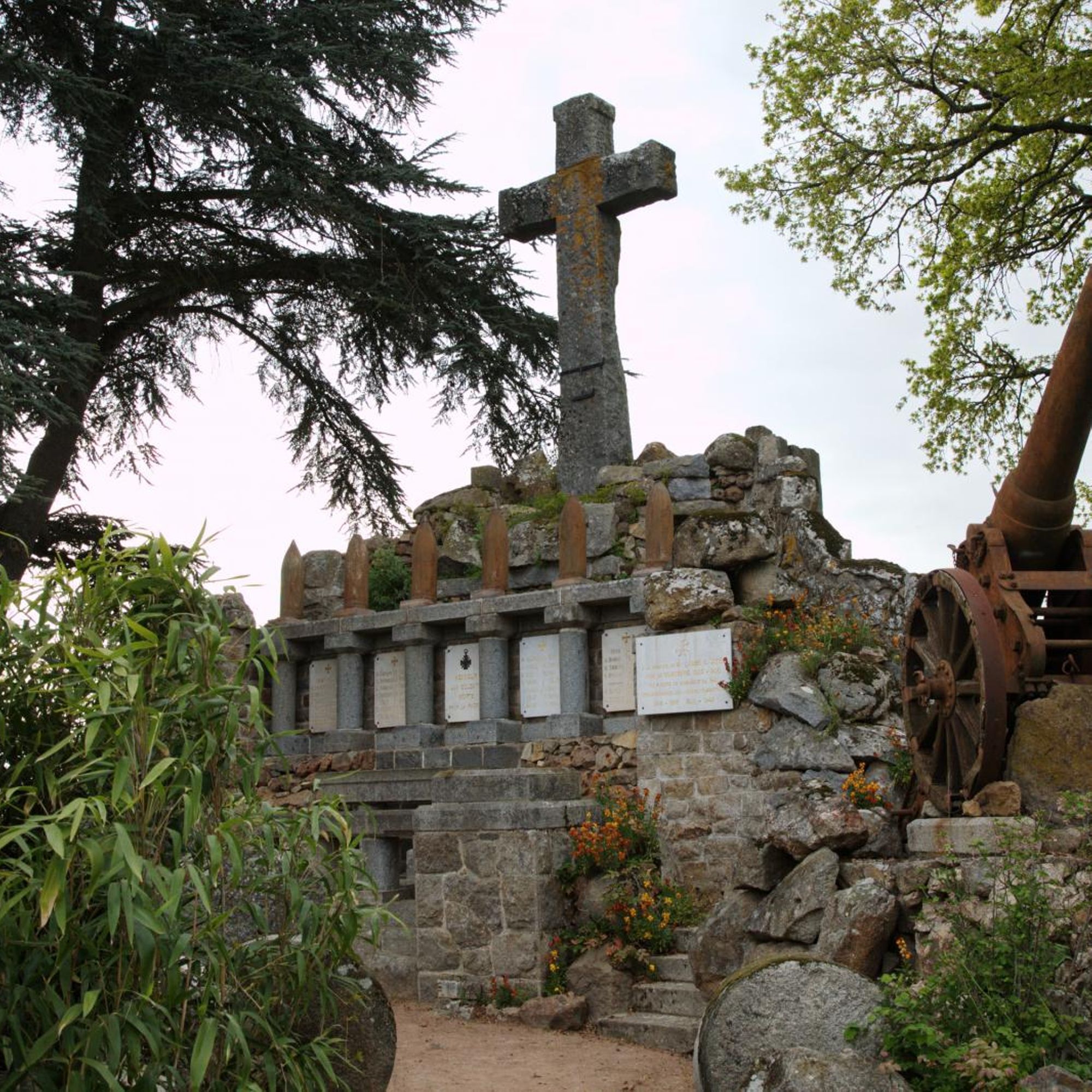 Parc commémoratif avec dépot lapidaire, armes (obus et canons russes), rouleaux de battage, cénotaphe, tribunes en granit, plaques, 5 colonnes dont une - celle - de 1918- couronnée d'une Vierge en fonte, tombeau du Christ sous la croix... fausse ruine d'église côté rue et castrale vue de dos.