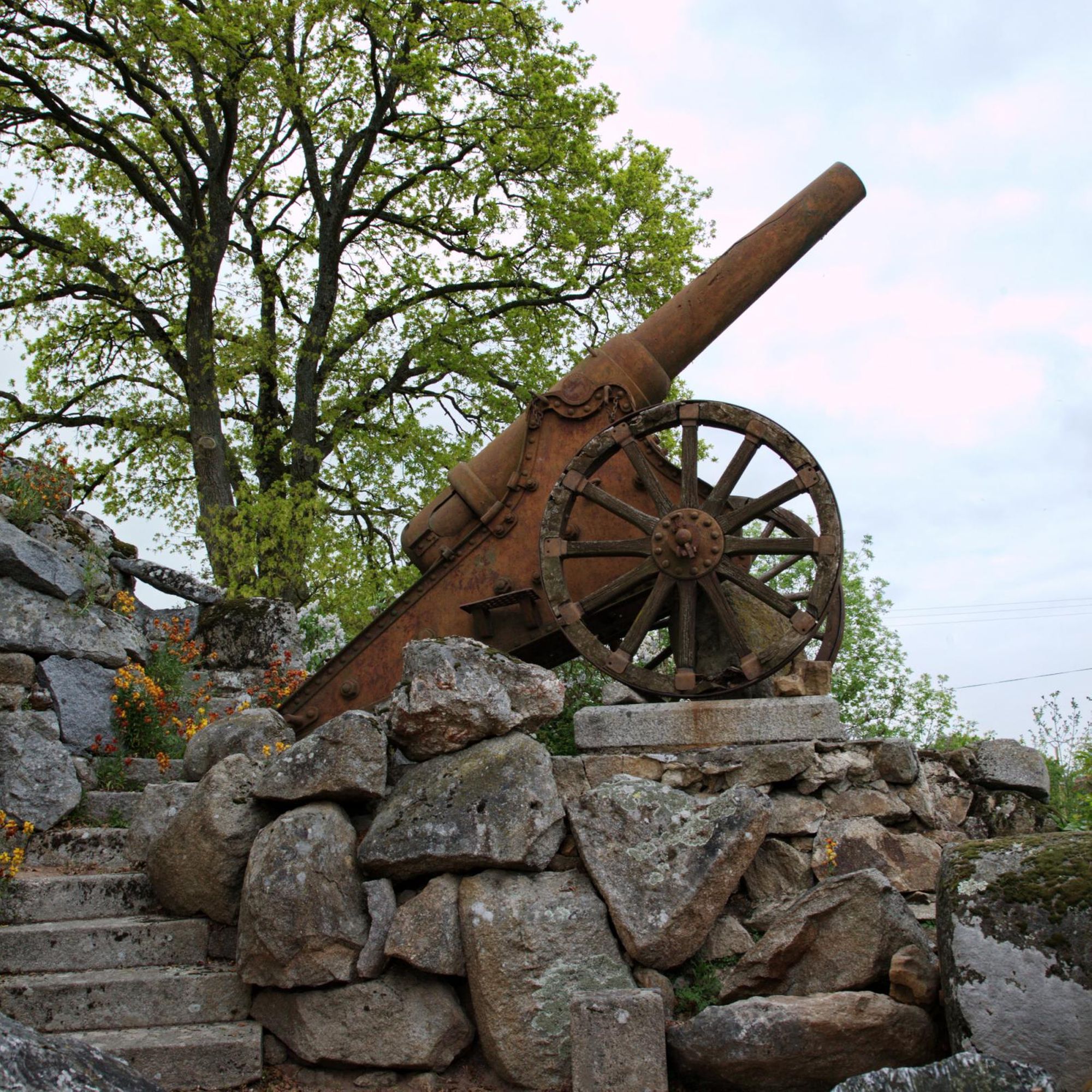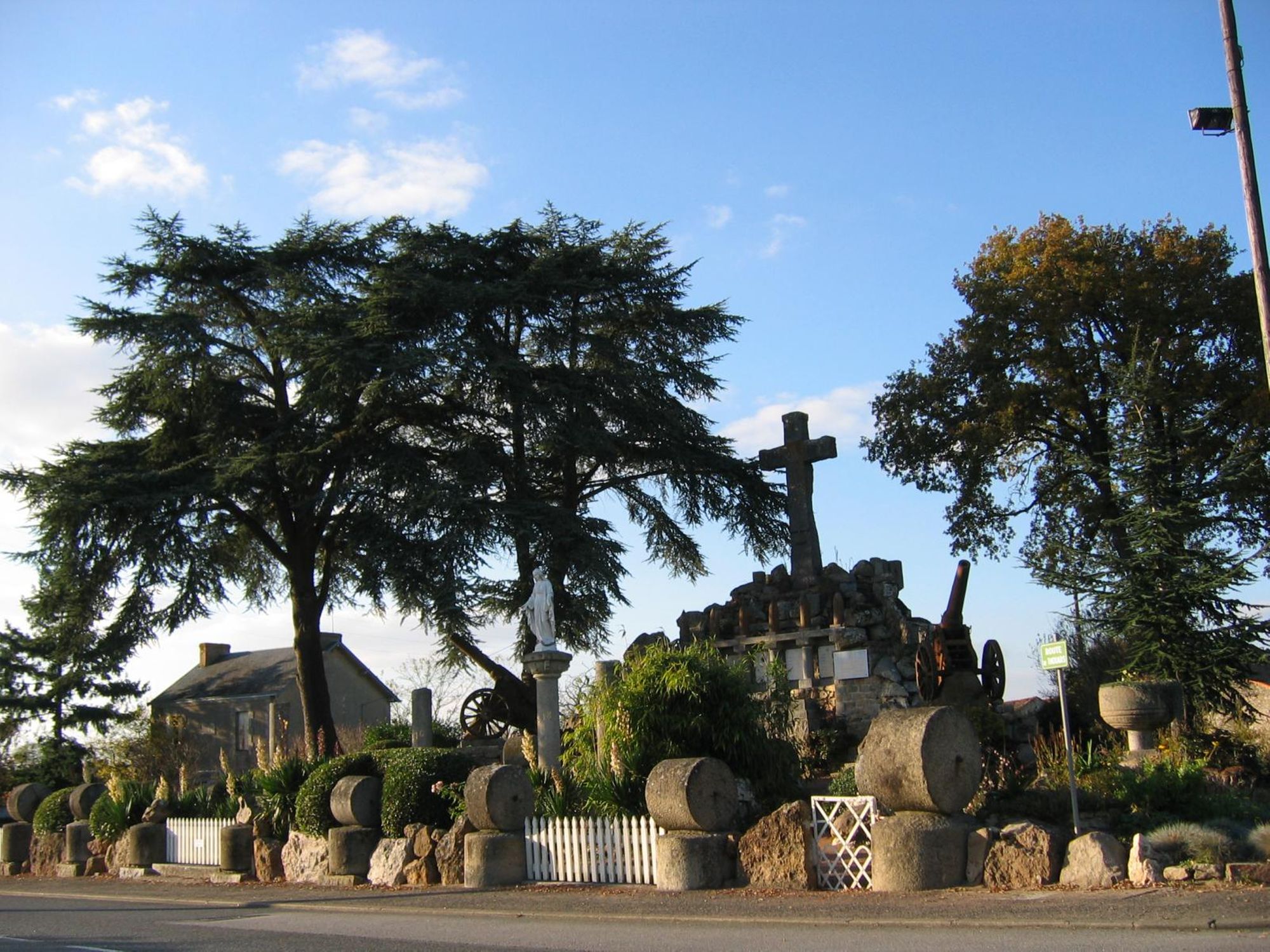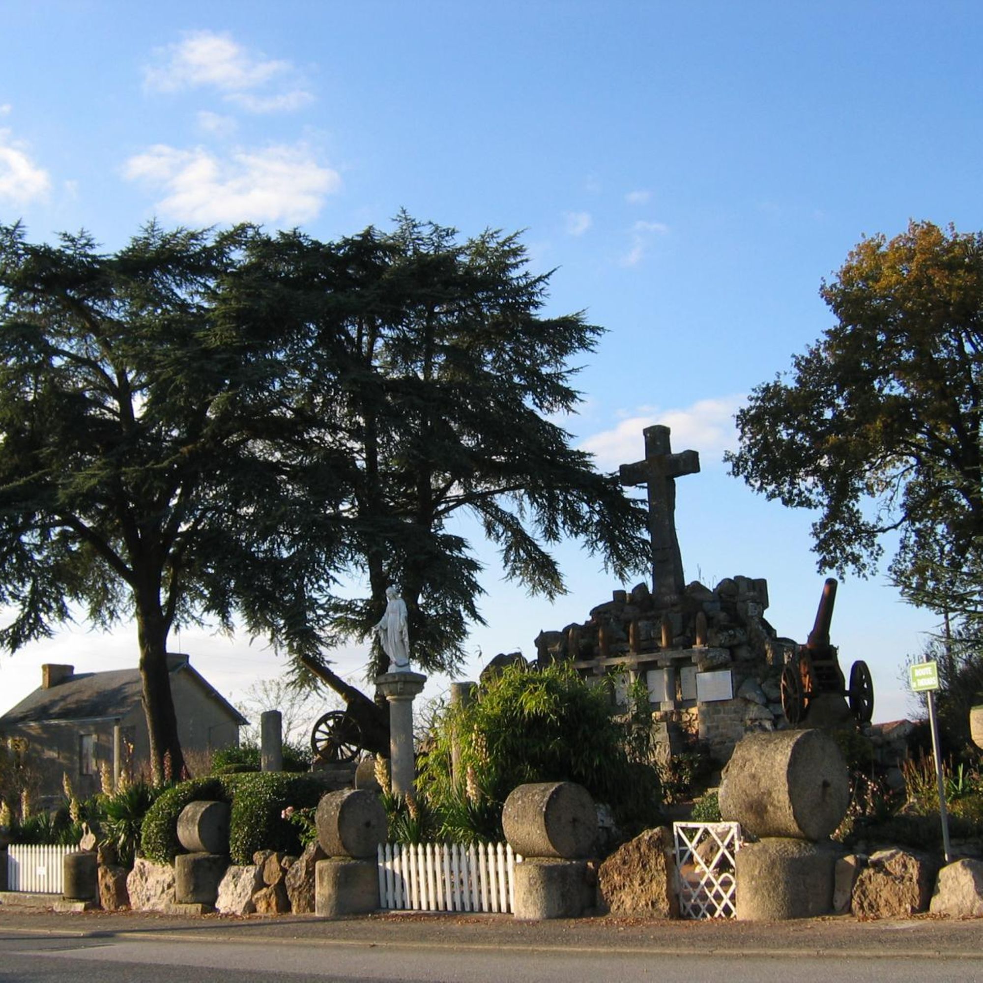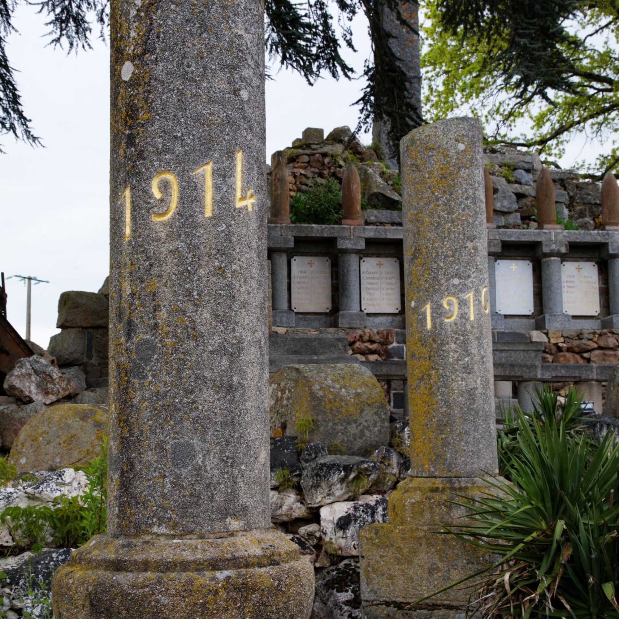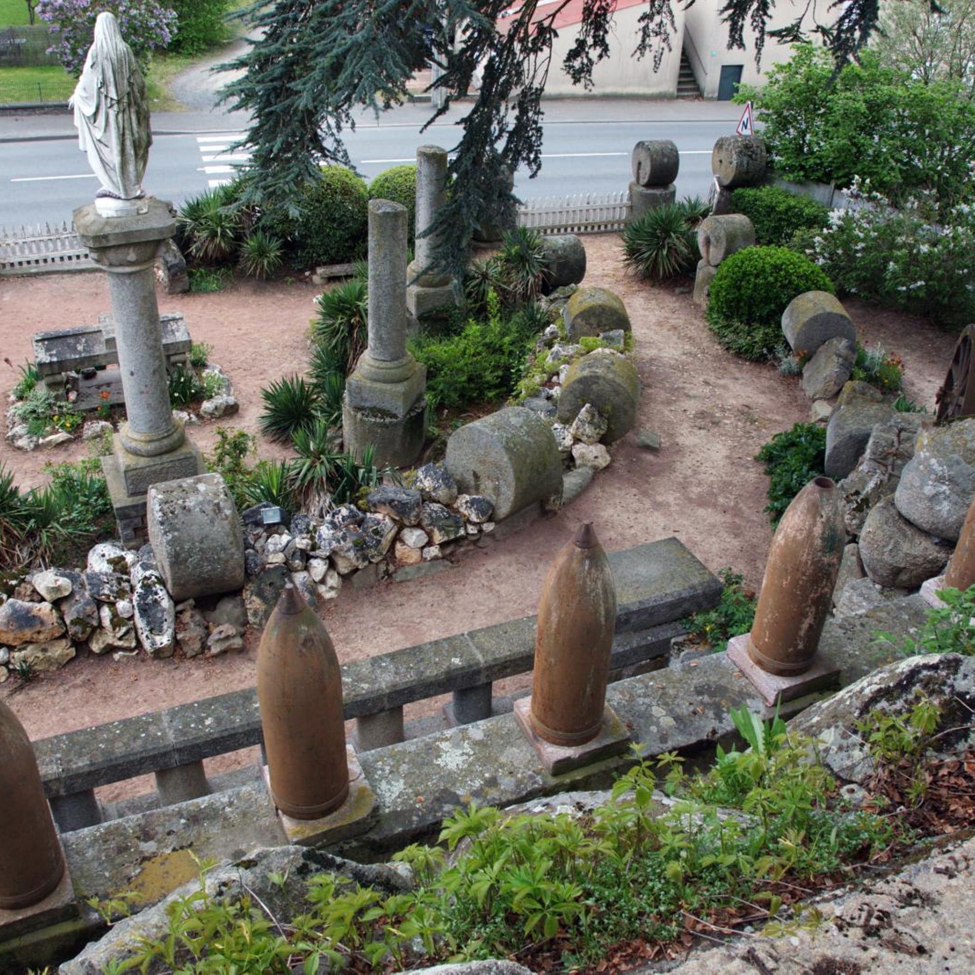 Parc commémoratif avec dépot lapidaire, armes (obus et canons russes), rouleaux de battage, cénotaphe, tribunes en granit, plaques, 5 colonnes dont une - celle - de 1918- couronnée d'une Vierge en fonte, tombeau du Christ sous la croix... fausse ruine d'église côté rue et castrale vue de dos.