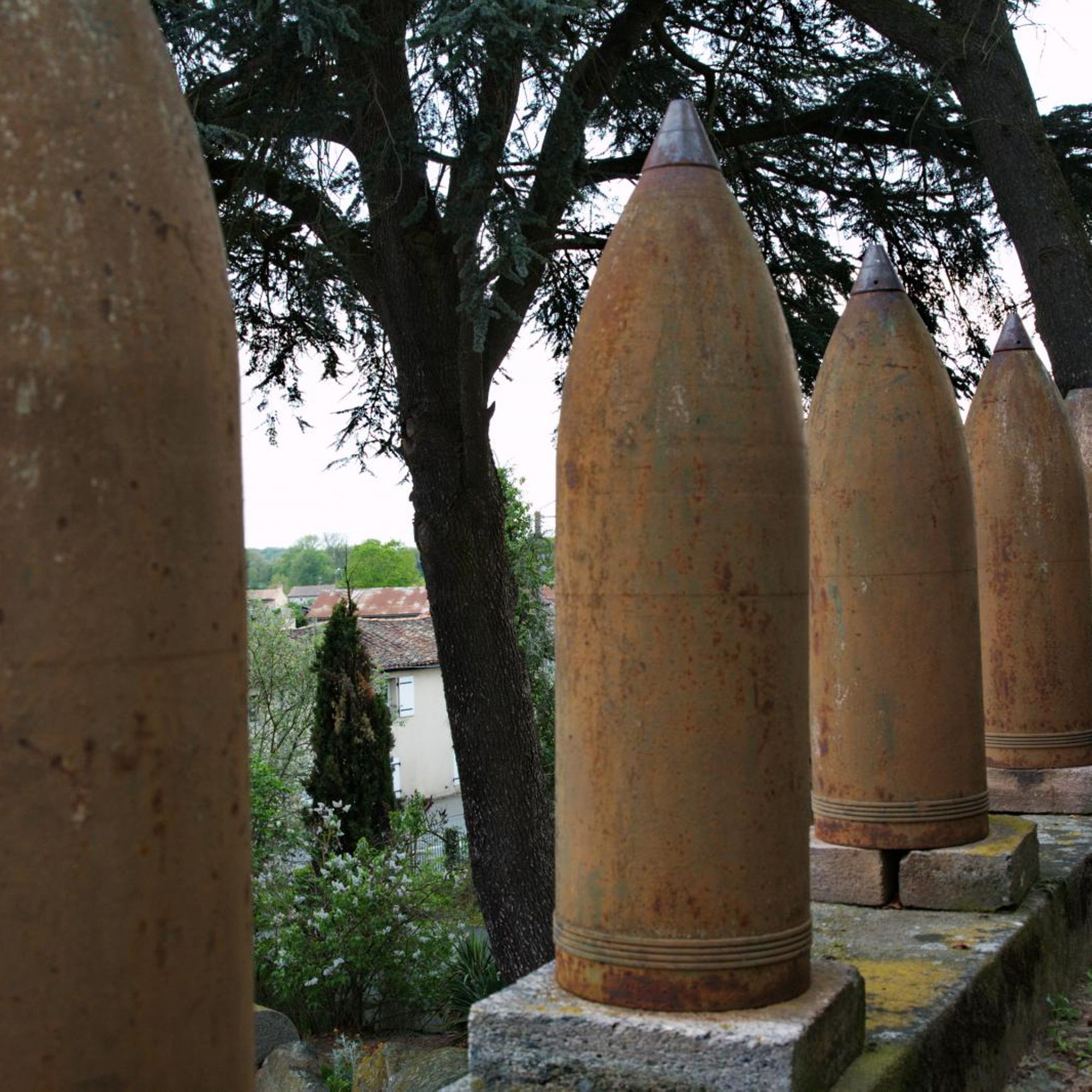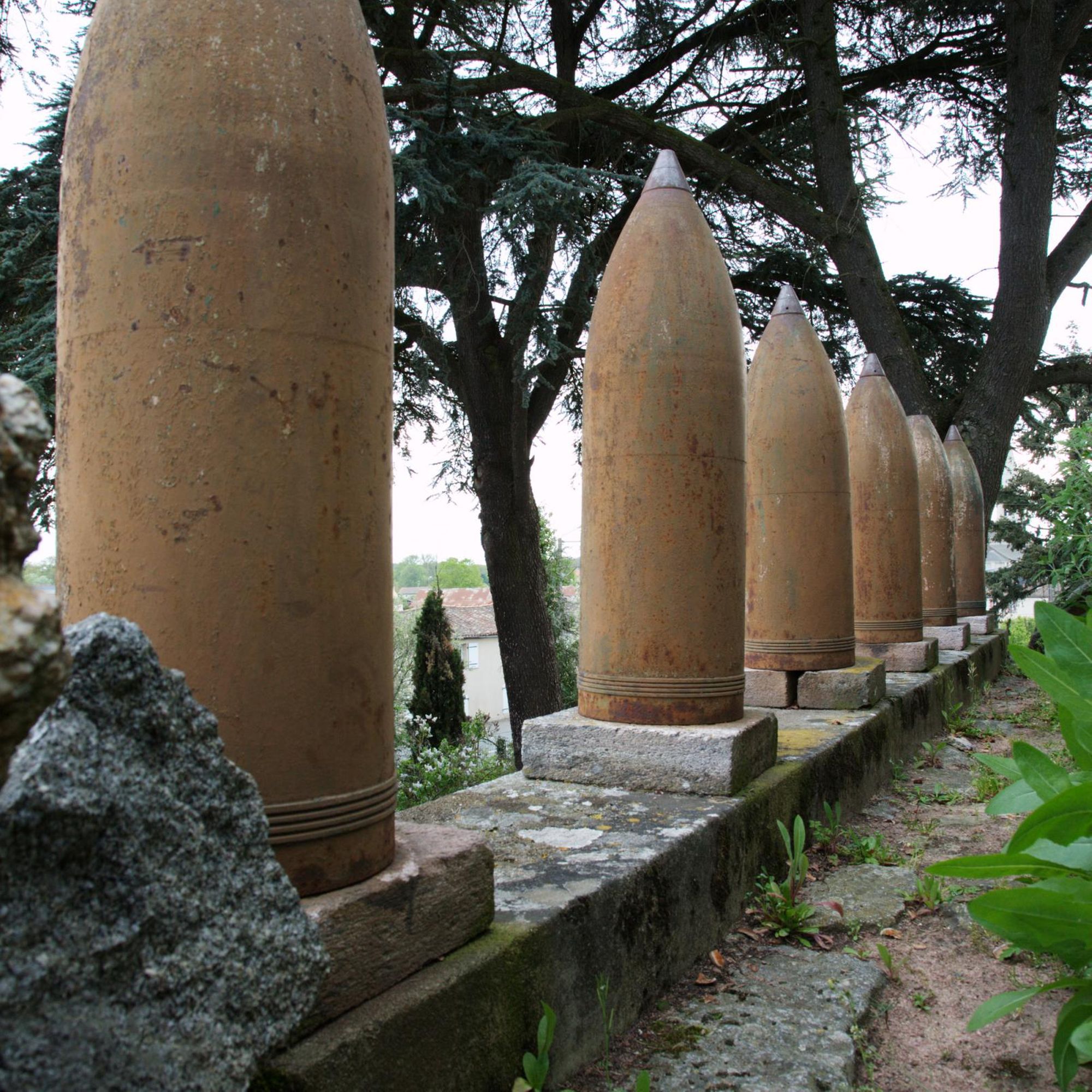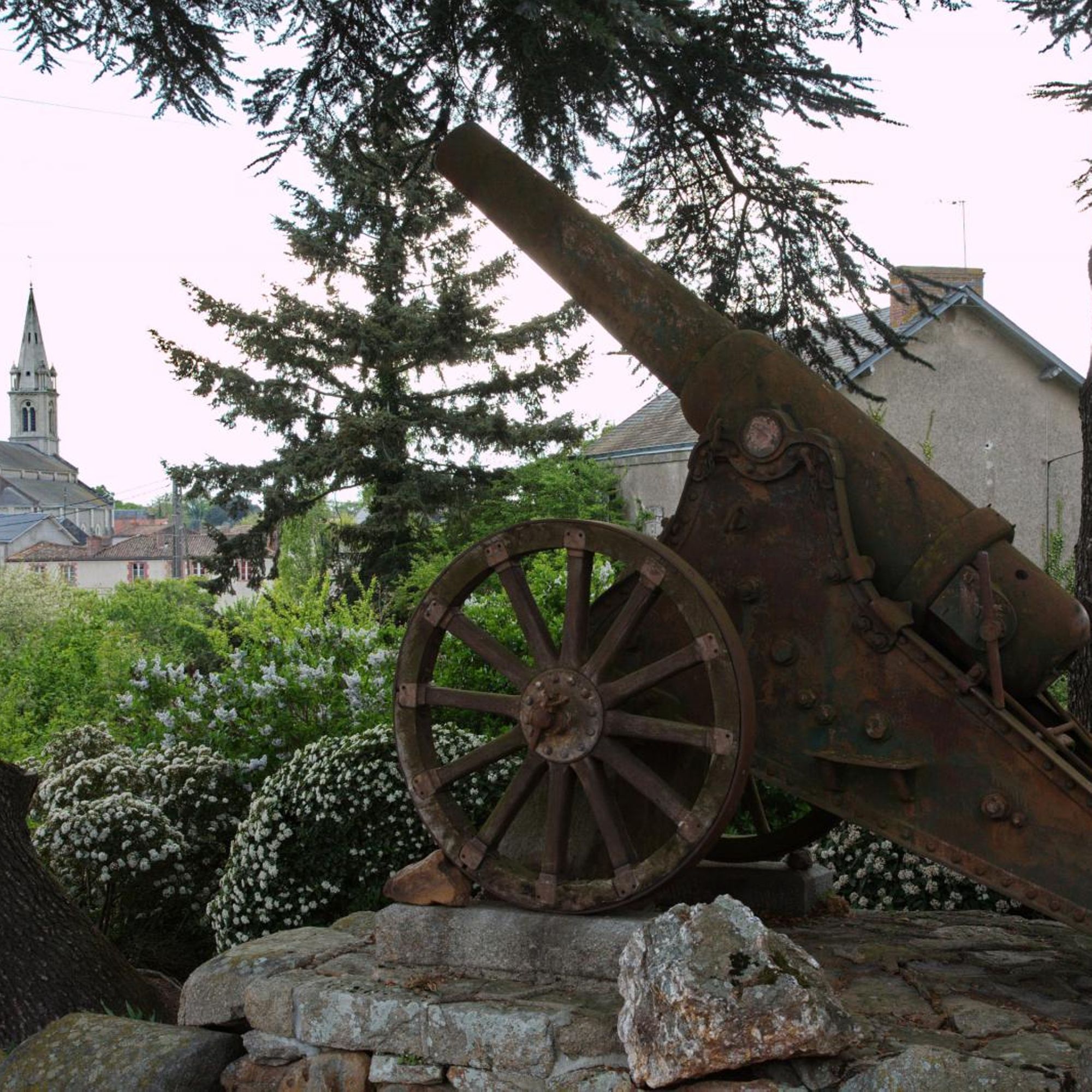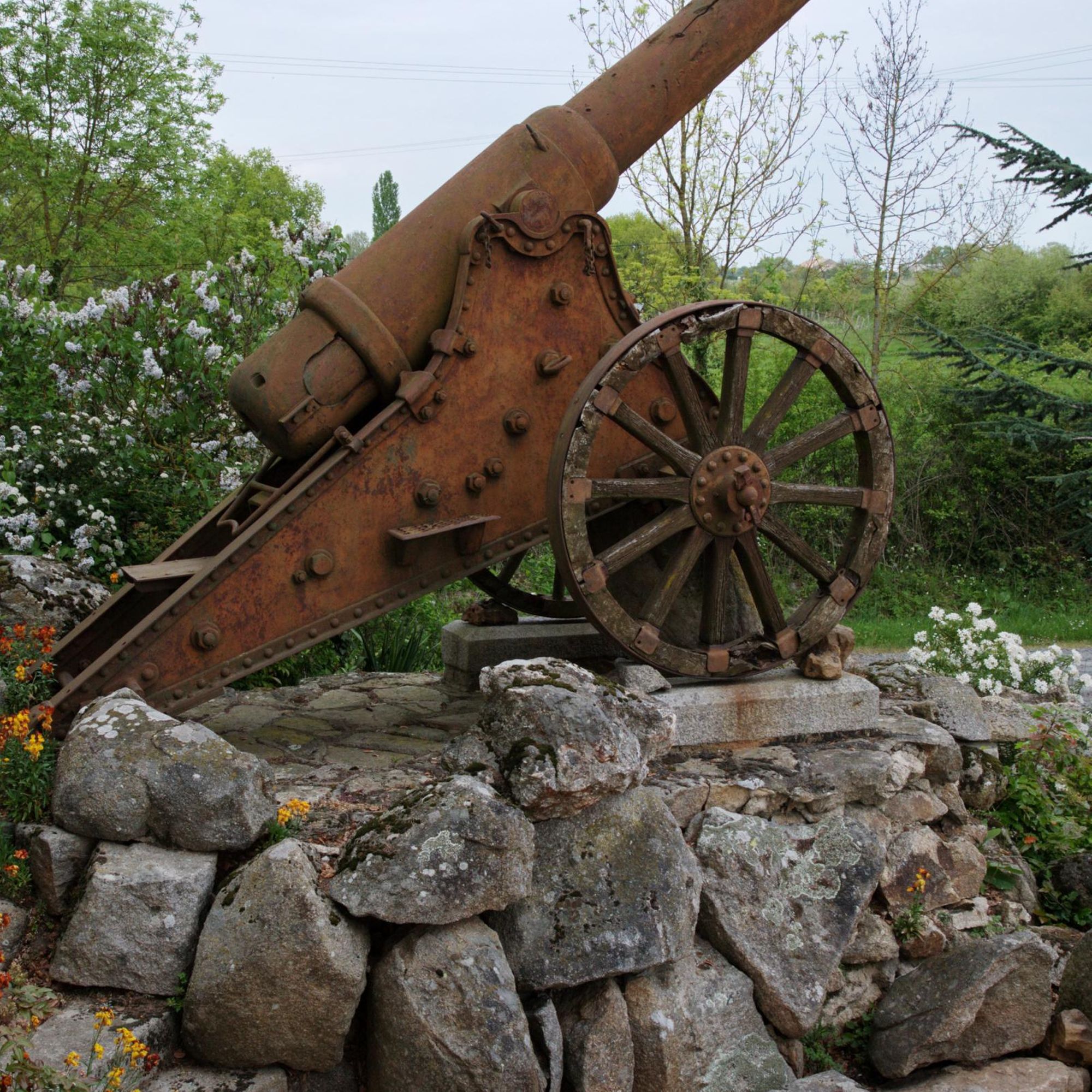 Parc commémoratif avec dépot lapidaire, armes (obus et canons russes), rouleaux de battage, cénotaphe, tribunes en granit, plaques, 5 colonnes dont une - celle - de 1918- couronnée d'une Vierge en fonte, tombeau du Christ sous la croix... fausse ruine d'église côté rue et castrale vue de dos.