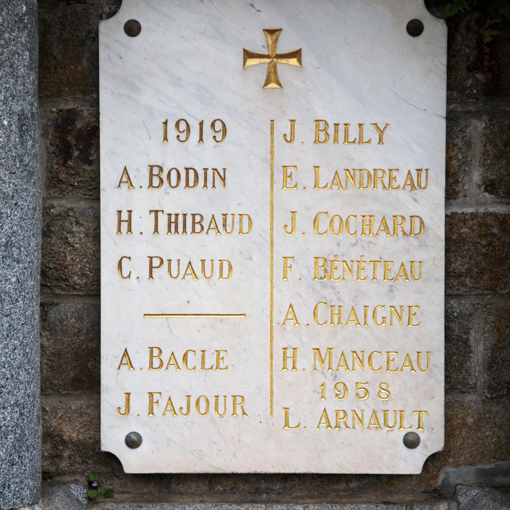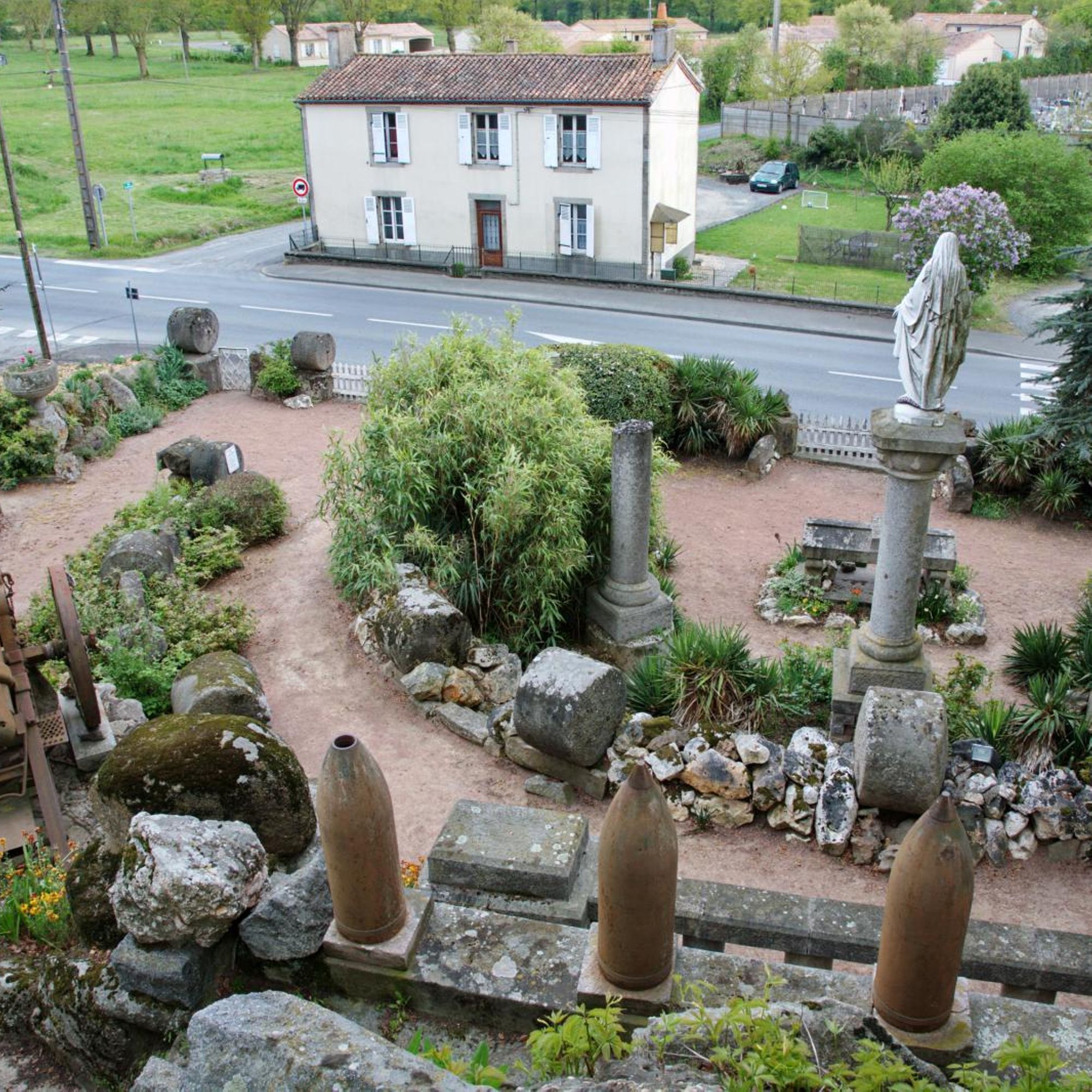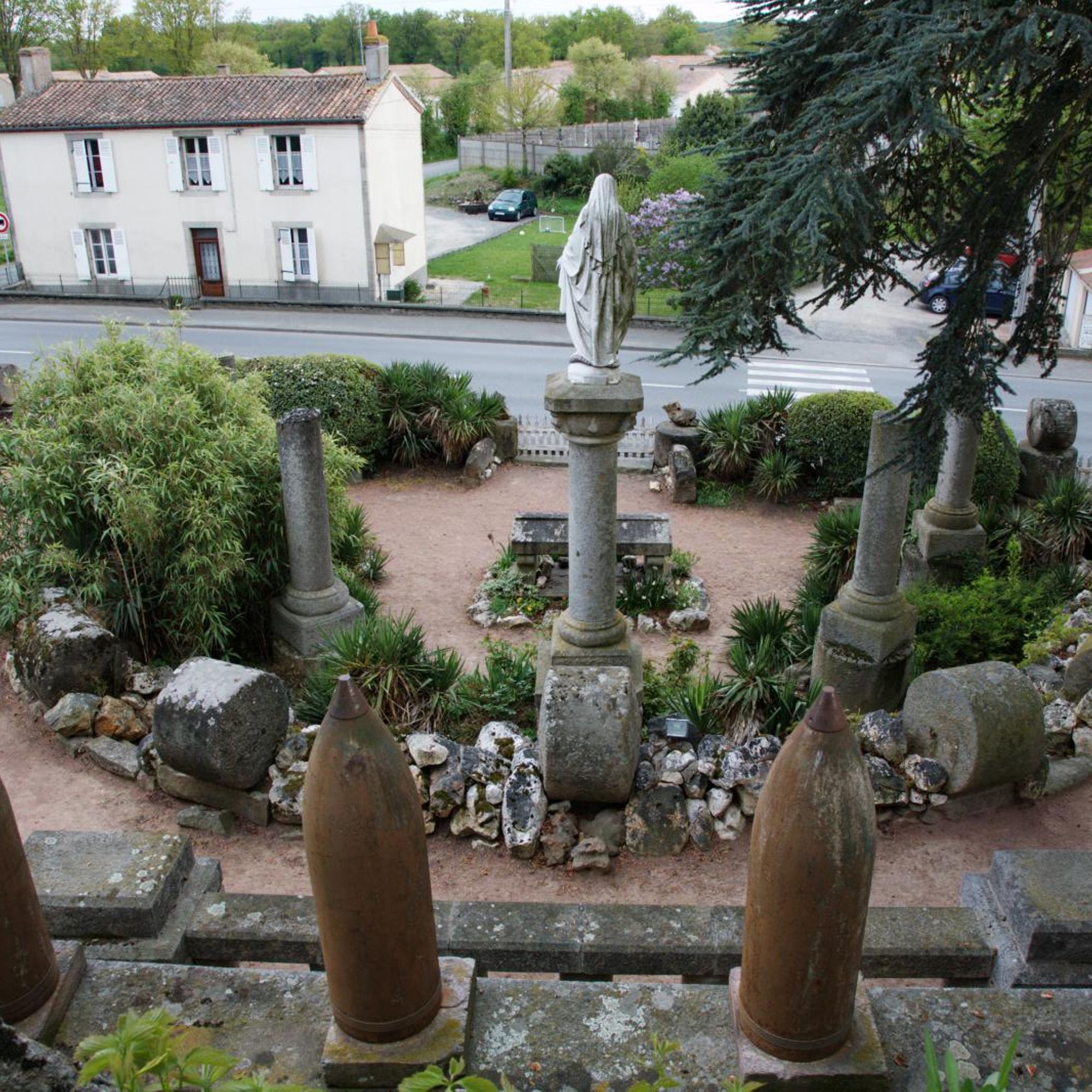 La colonne de la Victoire portant la Vierge ; le chapiteau s'orne d'une larme ; la base comporte un faux tabernacle en pierre enchâssant un parchemin avec les noms des jeunes filles du village qui ont acheté la statue de fonte.