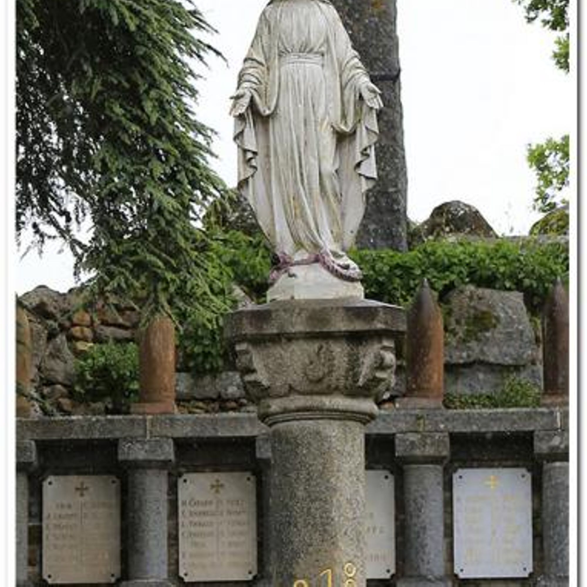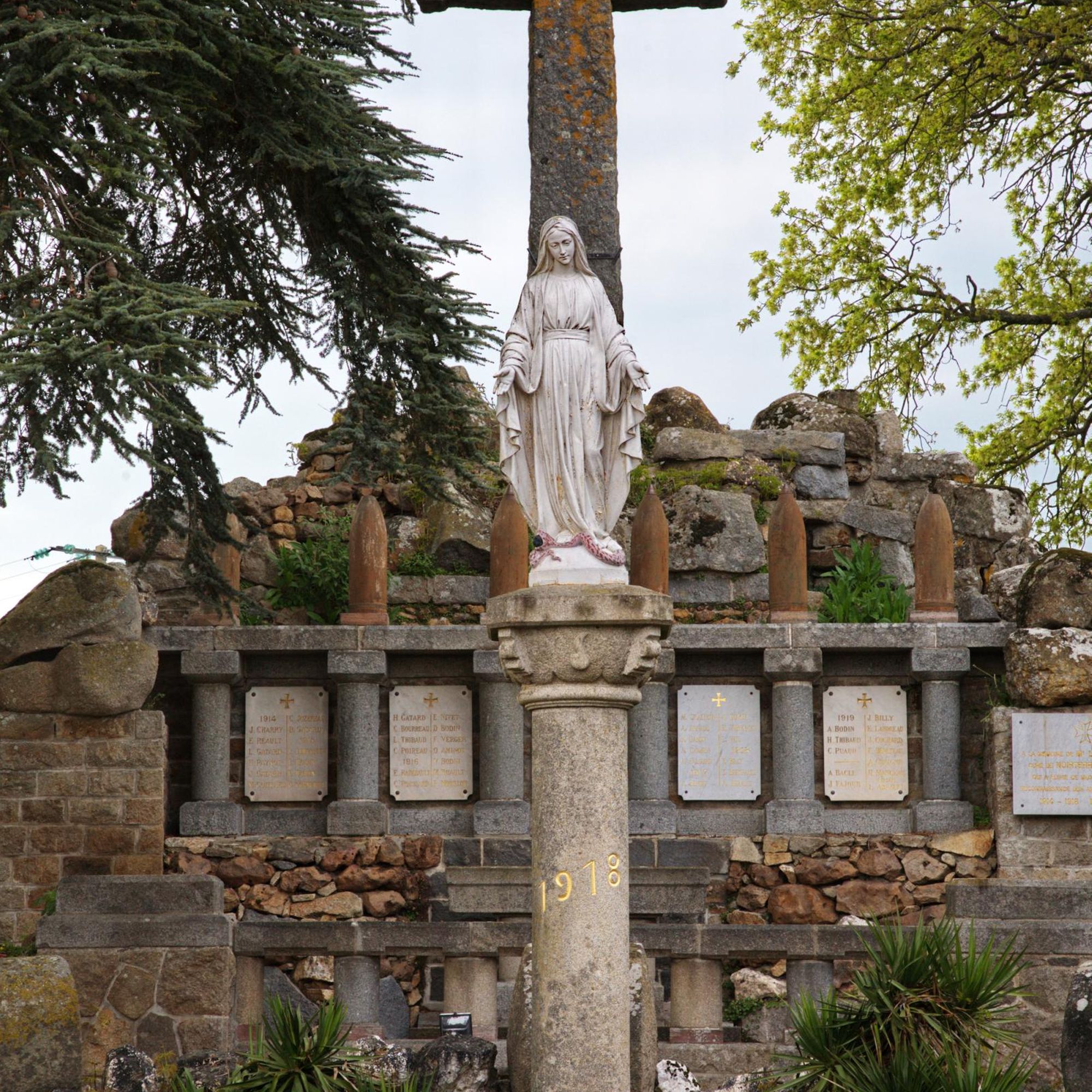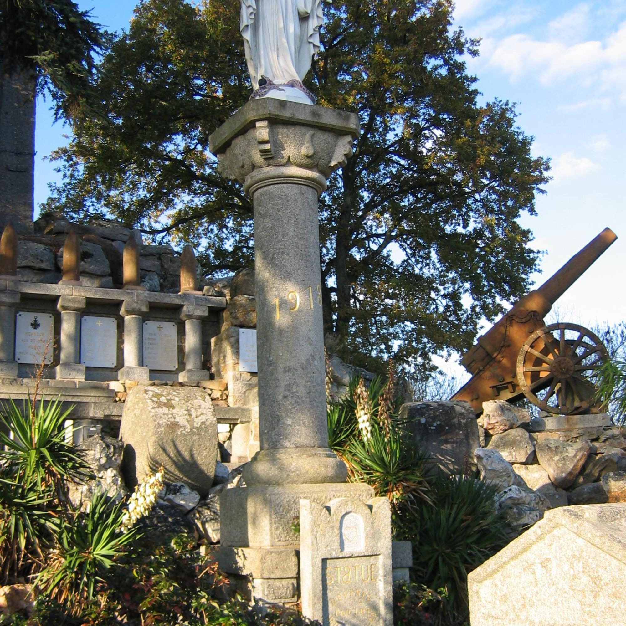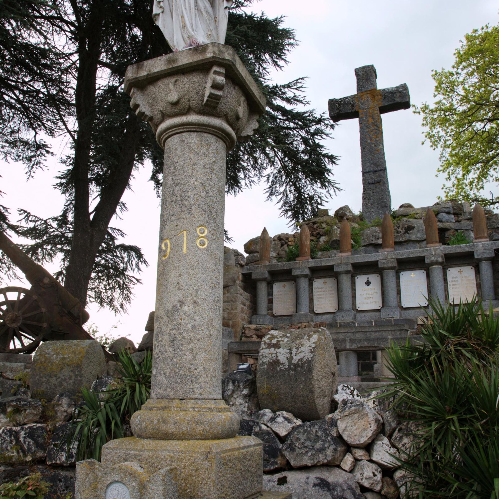 Au somment de la colonne de la Victoire, la Vierge domine un cénotaphe de granit, derrière : les plaques déployant la liste des morts avec frise d'obus autrichiens et croix en granit de 11m. de haut