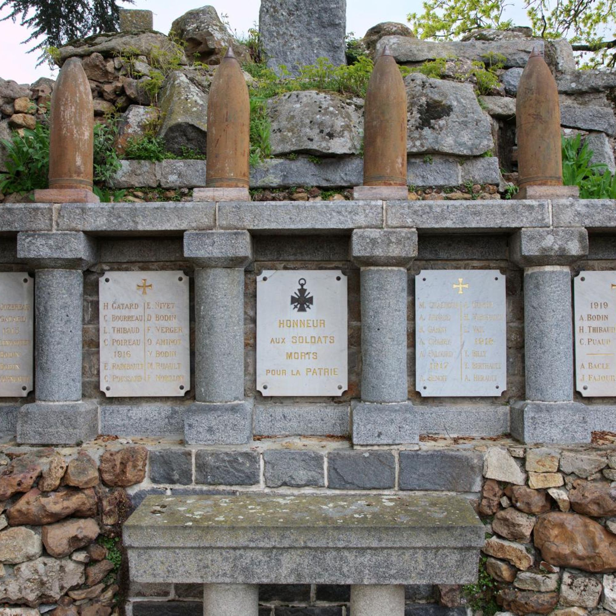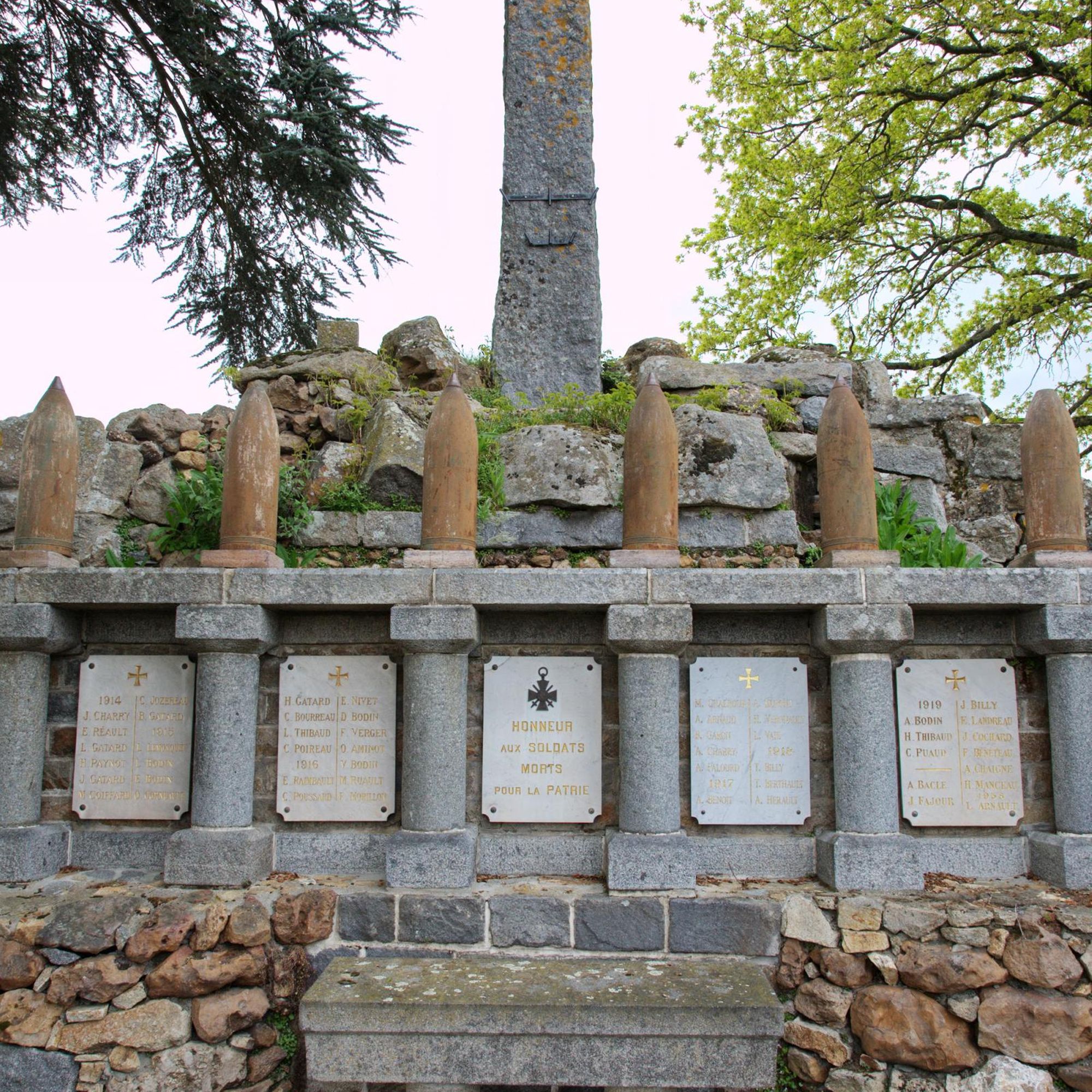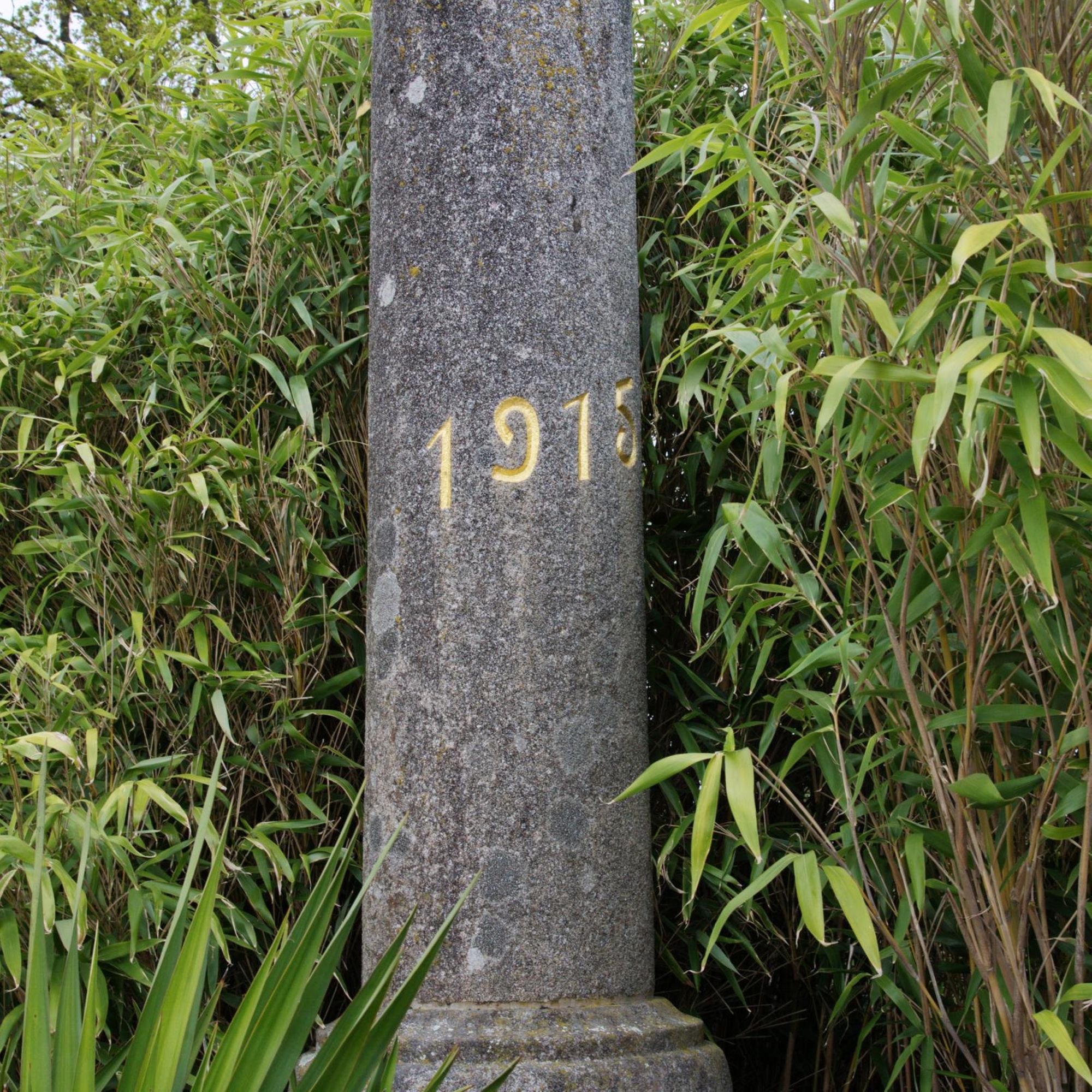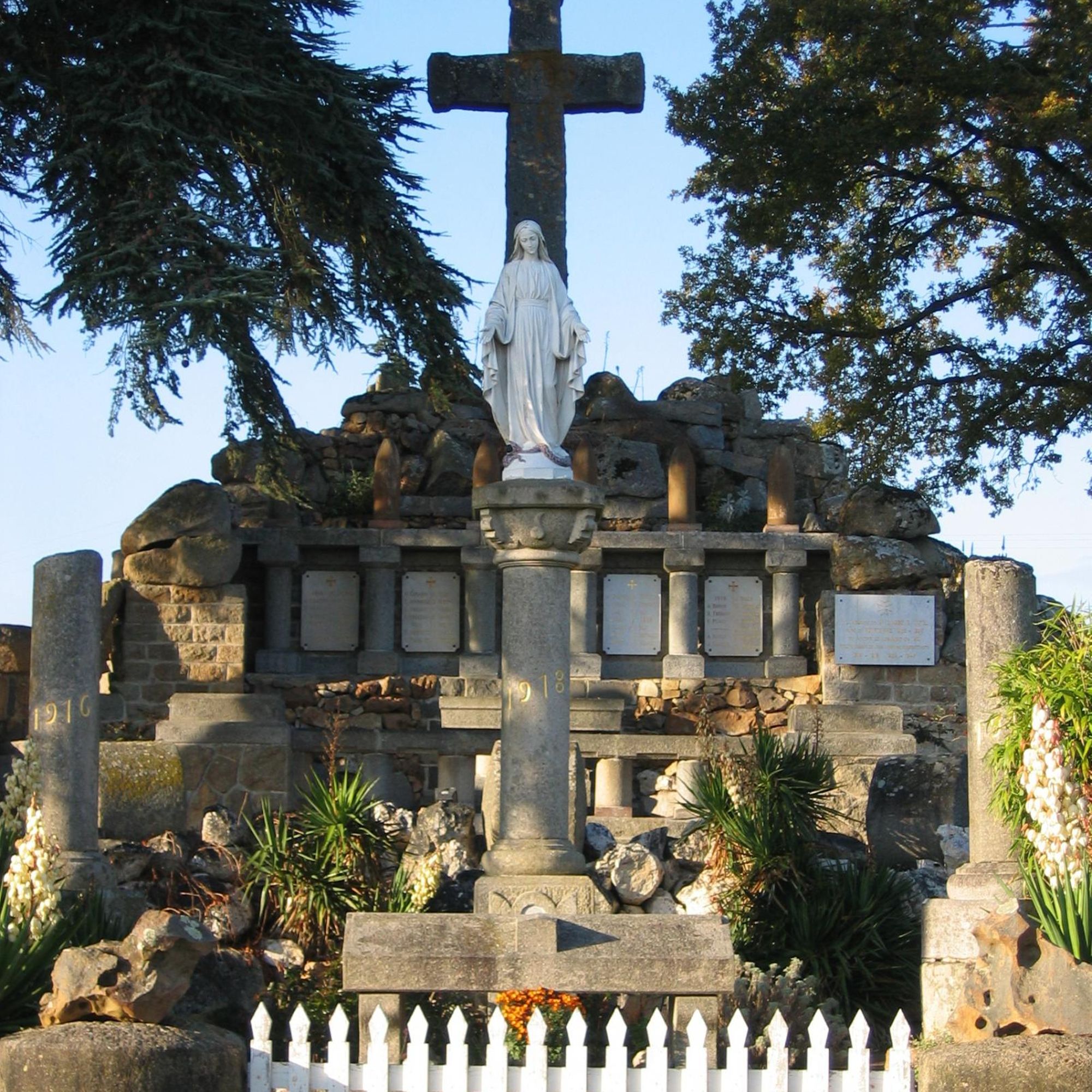 Au somment de la colonne de la Victoire, la Vierge domine un cénotaphe de granit, derrière : les plaques déployant la liste des morts avec frise d'obus autrichiens et croix en granit de 11m. de haut