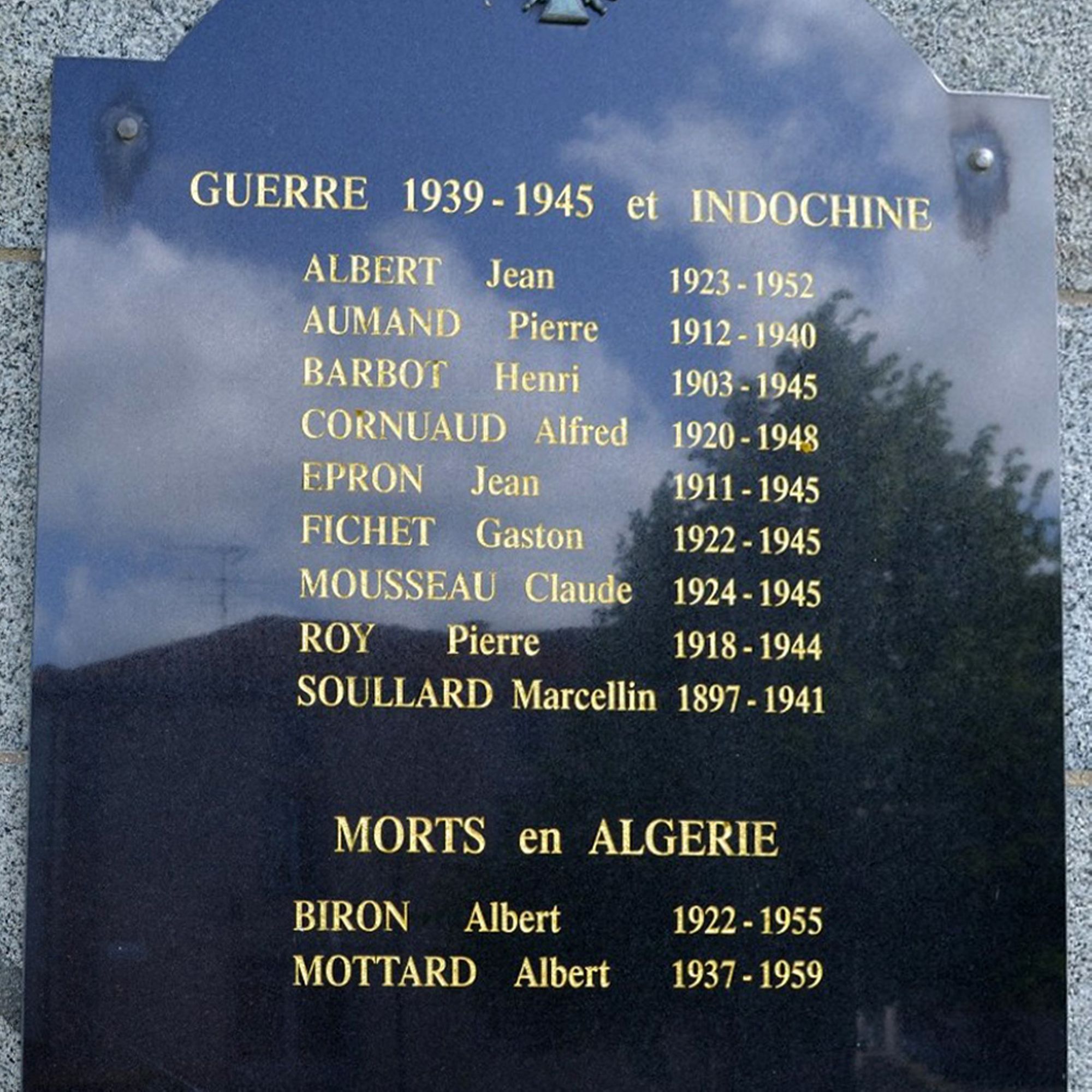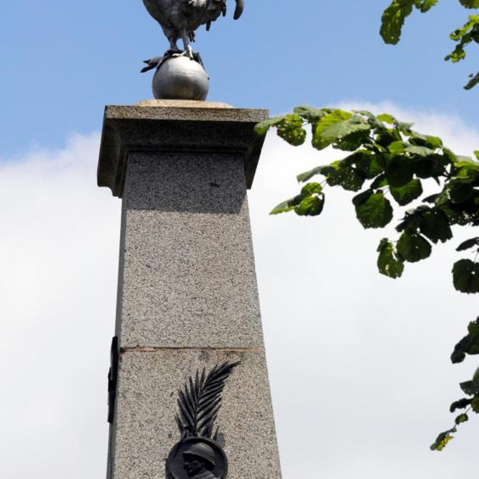 Au-dessus des plaques avec les noms sont scellées deux palmes de bronze et une croix de guerre entre les deux une croix sculptée dans le granit. Le coq triomphant couronne le tout.