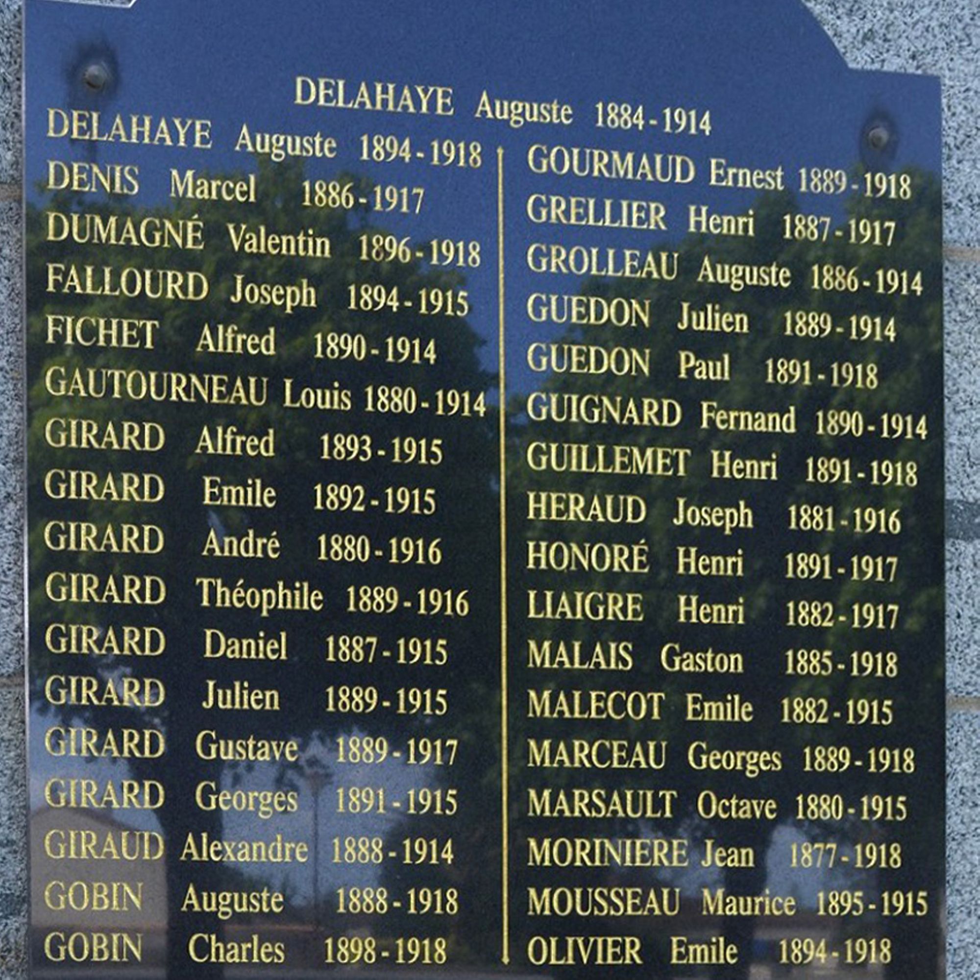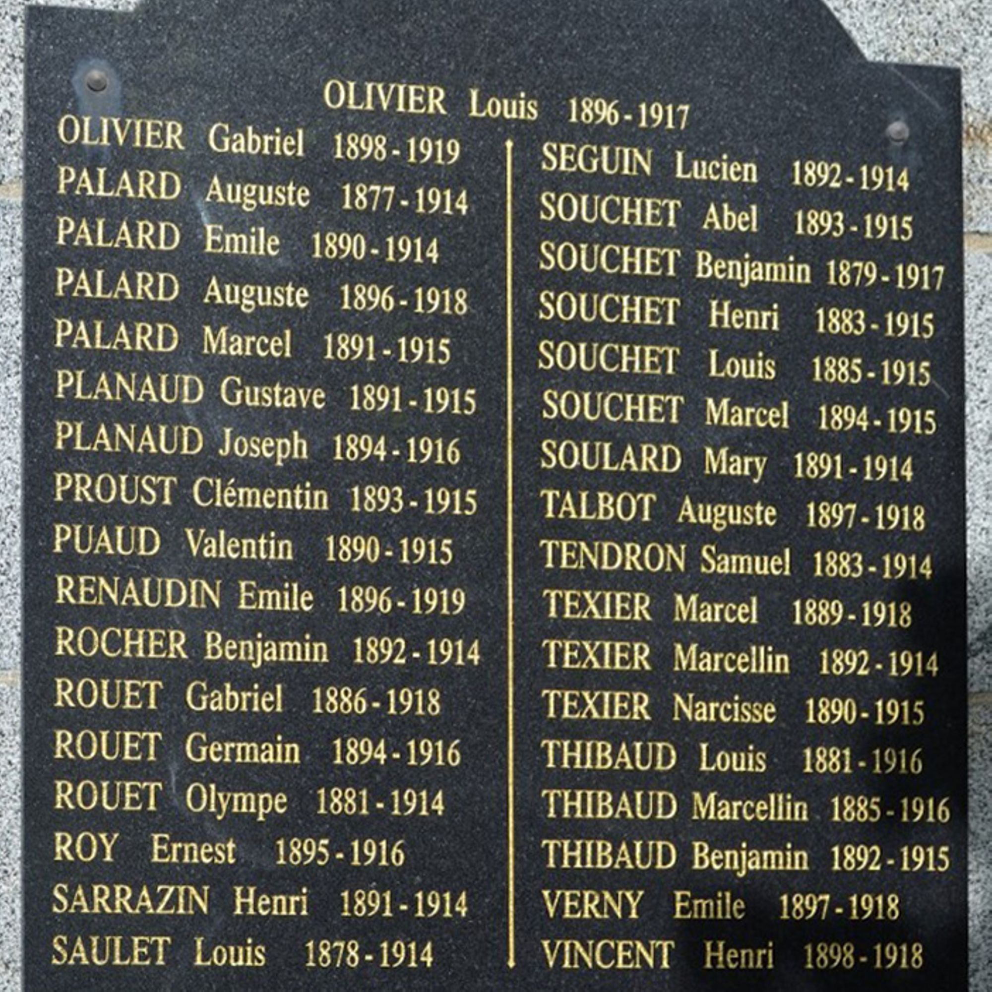 - Les seules inscriptions sont les quatre plaques de marbre noir qui portent en caractères dorés les 105 noms des morts pour la France de 14-18