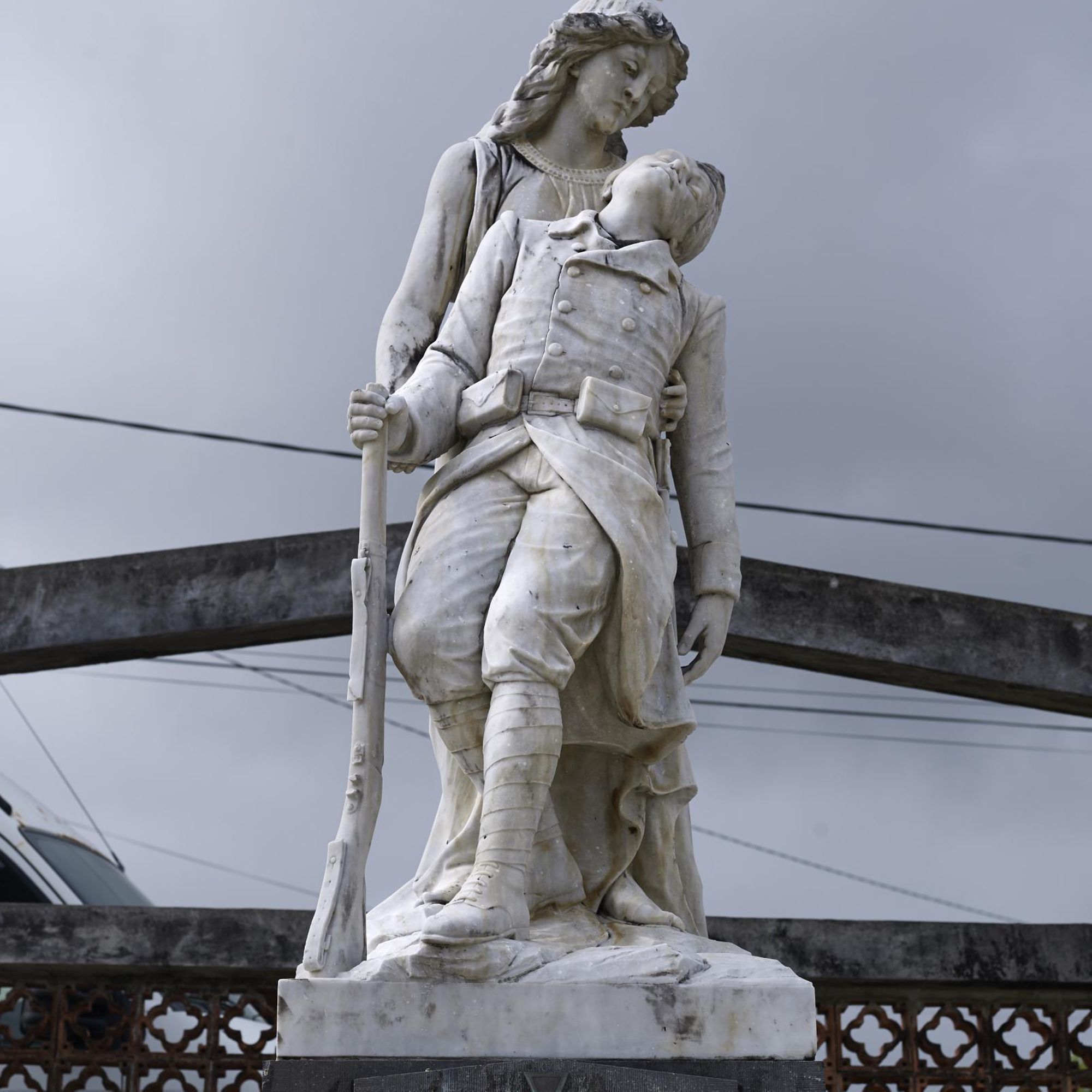 Une allégorie féminine (de la Patrie) soutient un poilu qui défaille, en s'appuyant sur son fusil.