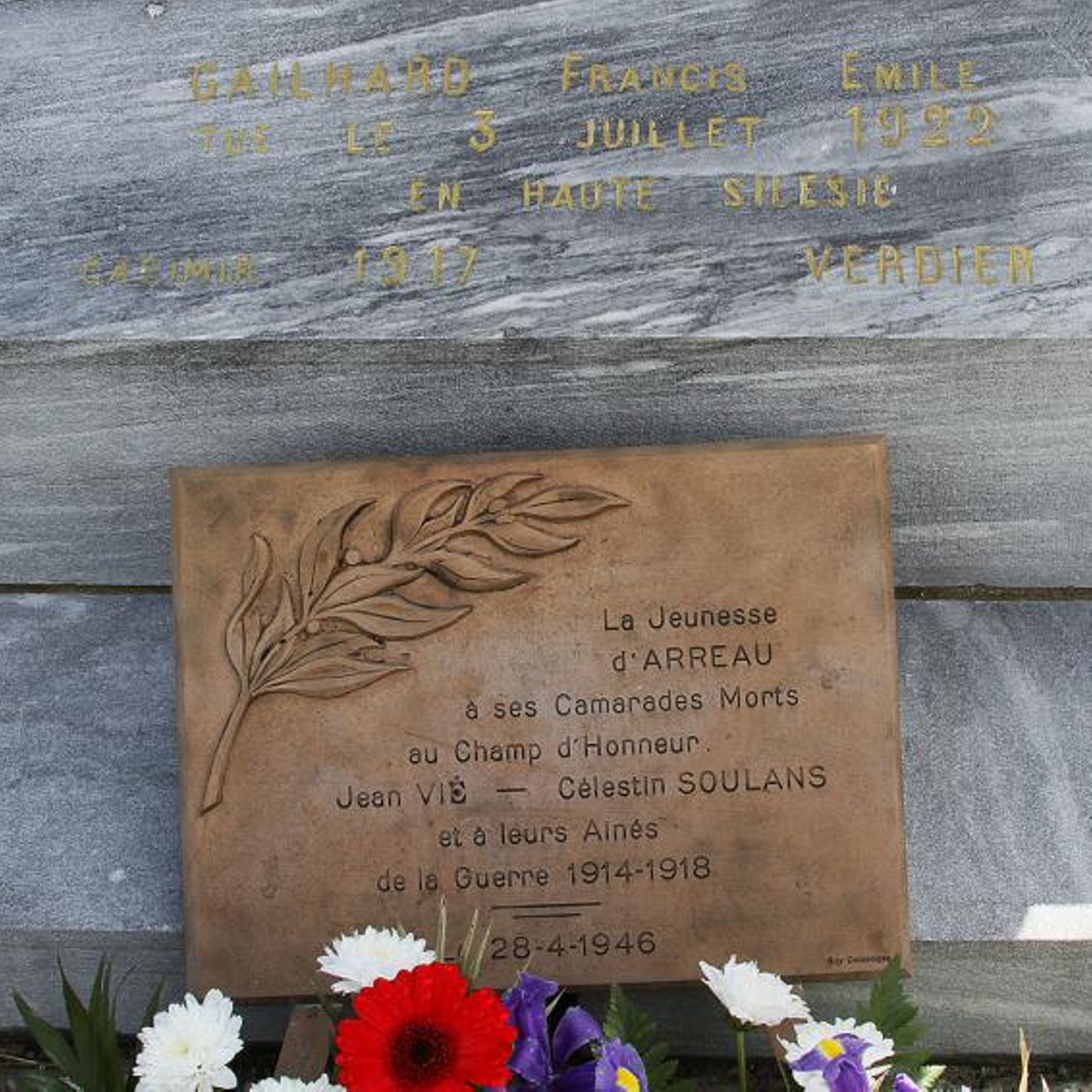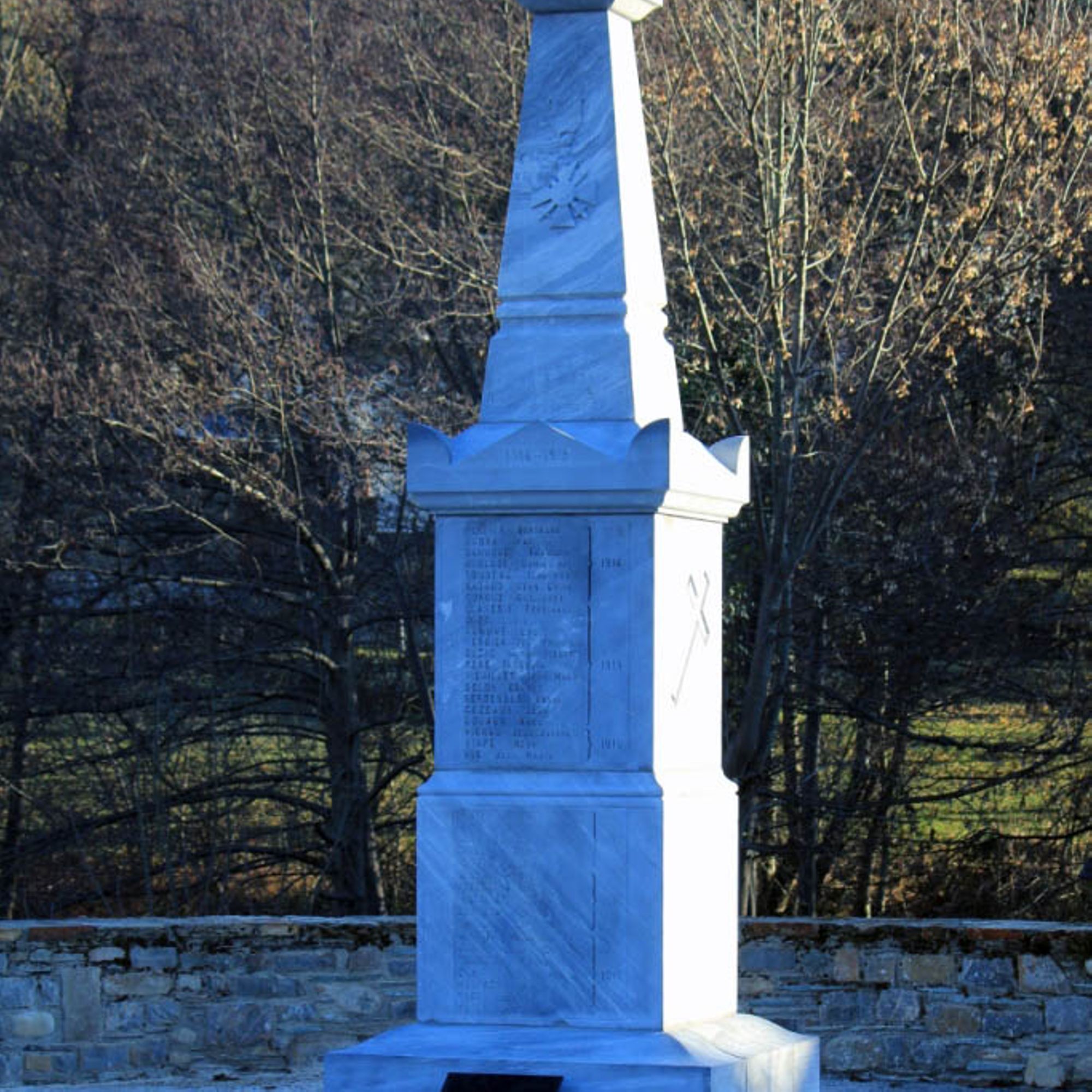 Monument entouré d'un muret semi-circulaire en pierre apparentes. La façade comporte pratiquement tous les éléments : noms des victimes de 14-18, de 39-45, une plaque pour tous les morts des 2 premières guerres, un rameau d'olivier et la croix de guerre.