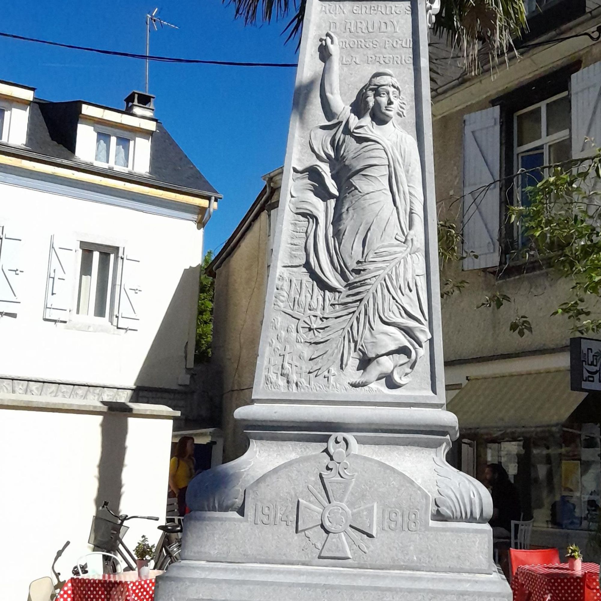 La Commune d’Arudy fait ériger un édifice selon les plans proposés par le « Comptoir d’Exploitation et de Vente des Marbres et Granites des Pyrénées » situé à Arudy ; plans soumis à l’appréciation d’un homme de l’art Monsieur ANDRAL, architecte. Les ornements sont réalisés par le sculpteur TEILLARD. Inauguré le 7 mai 1922, ce Monument aux Morts en forme d’obélisque tronquée symbolise un cénotaphe dressé. Il marque l’absence et l’élévation vers la gloire des enfants de la commune d’Arudy morts pour la France.