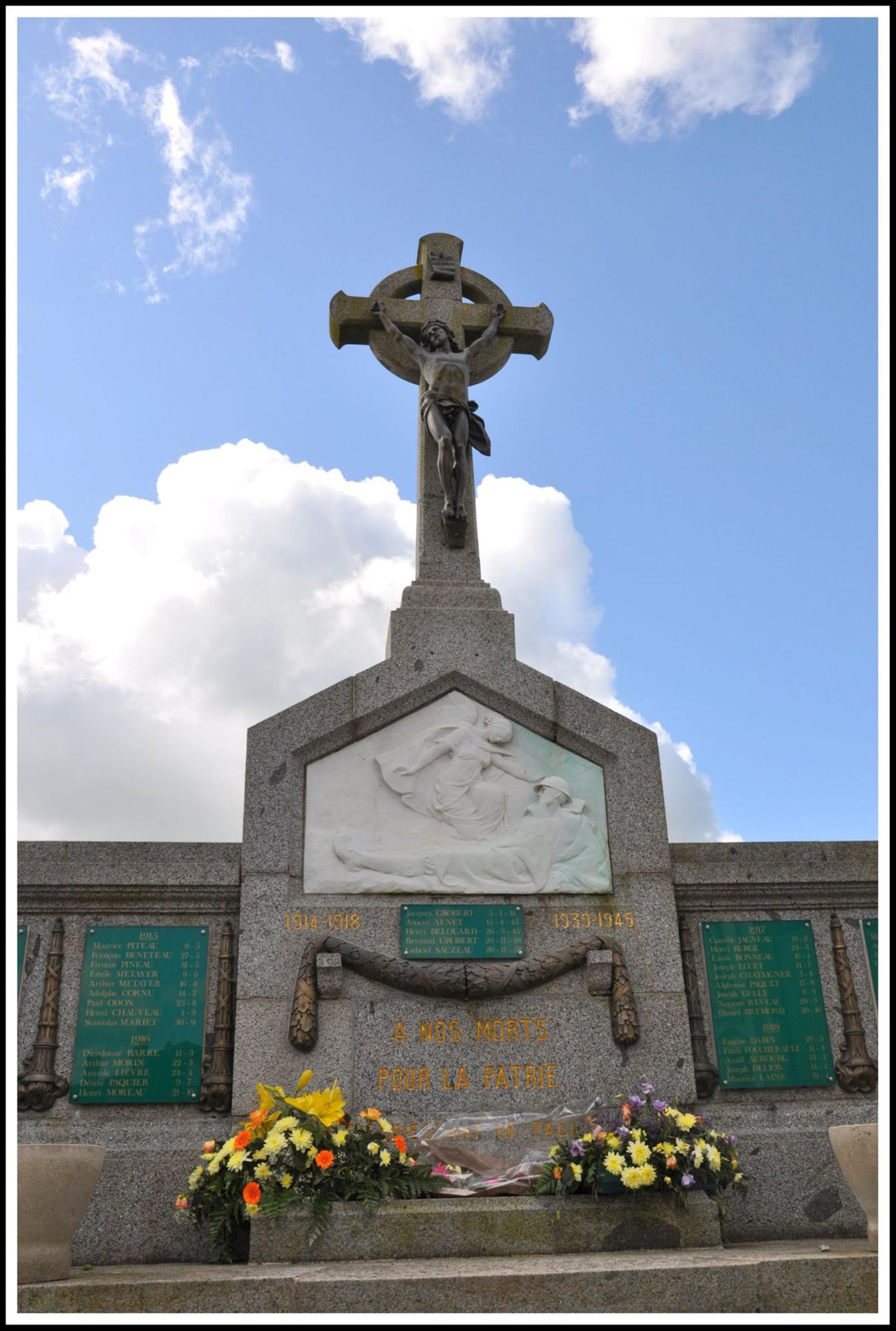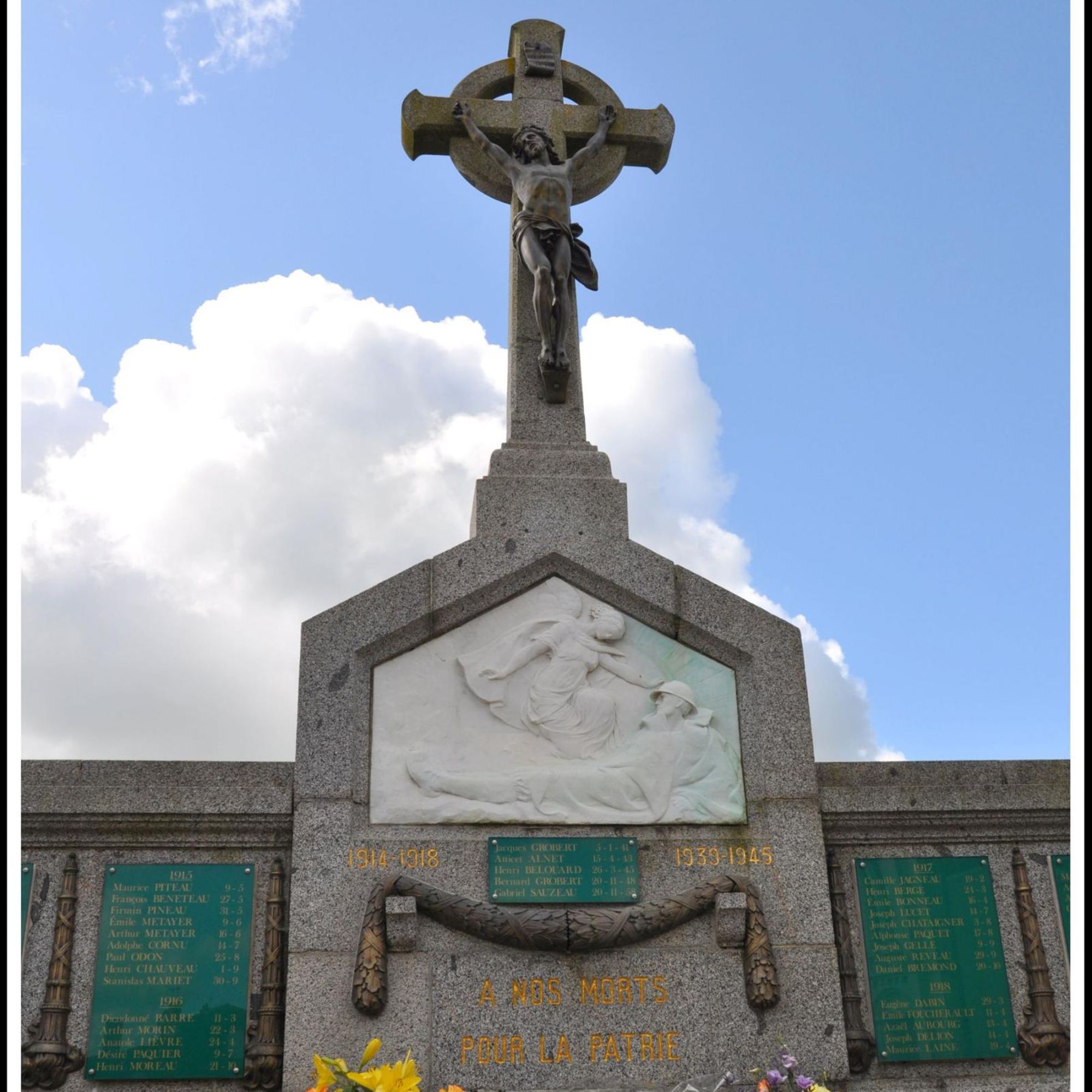 Du reste, voici toutes les grandes lignes des dépenses. Pour la masse de granit, environ 35 000 kg taillés et posés par les frères Motard de la Chapelle St Laurent : 9 280 frs. Pour le christ de Bouchardon en bronze ciselé et patiné, venant des ateliers Le Lacaron et Peaucelle de Paris : 1600 frs. Pour le haut relief en marbre blanc, oeuvre de M. Pierre Roux de l’Ecole des Beaux-Arts, emballage et port compris : 4 632 frs. Pour les plaques en marbre portant les noms des morts et pour l’inscription générale gravée dans le granit : 844,50 frs. Pour le travail des fondations et le mur d’entourage, oeuvre des maçons de Faye-l’Abbesse : 923, 95 frs. Pour les grilles en fer forgé, sortie des ateliers de M. Boureau de Niort, compris la peinture, les marches et la bordure en granit : 3 276 frs. Pour les fournitures de chaux et de ciment que l’on a pris à Bressuire : 728 frs. Pour les honoraires de M. Mongeaud, architecte à Niort : 1 000 frs. Pour les attributs en bronze, guirlandes, torches renversées et palmes fondues par M. Planard de Niort : 2 690 frs.
