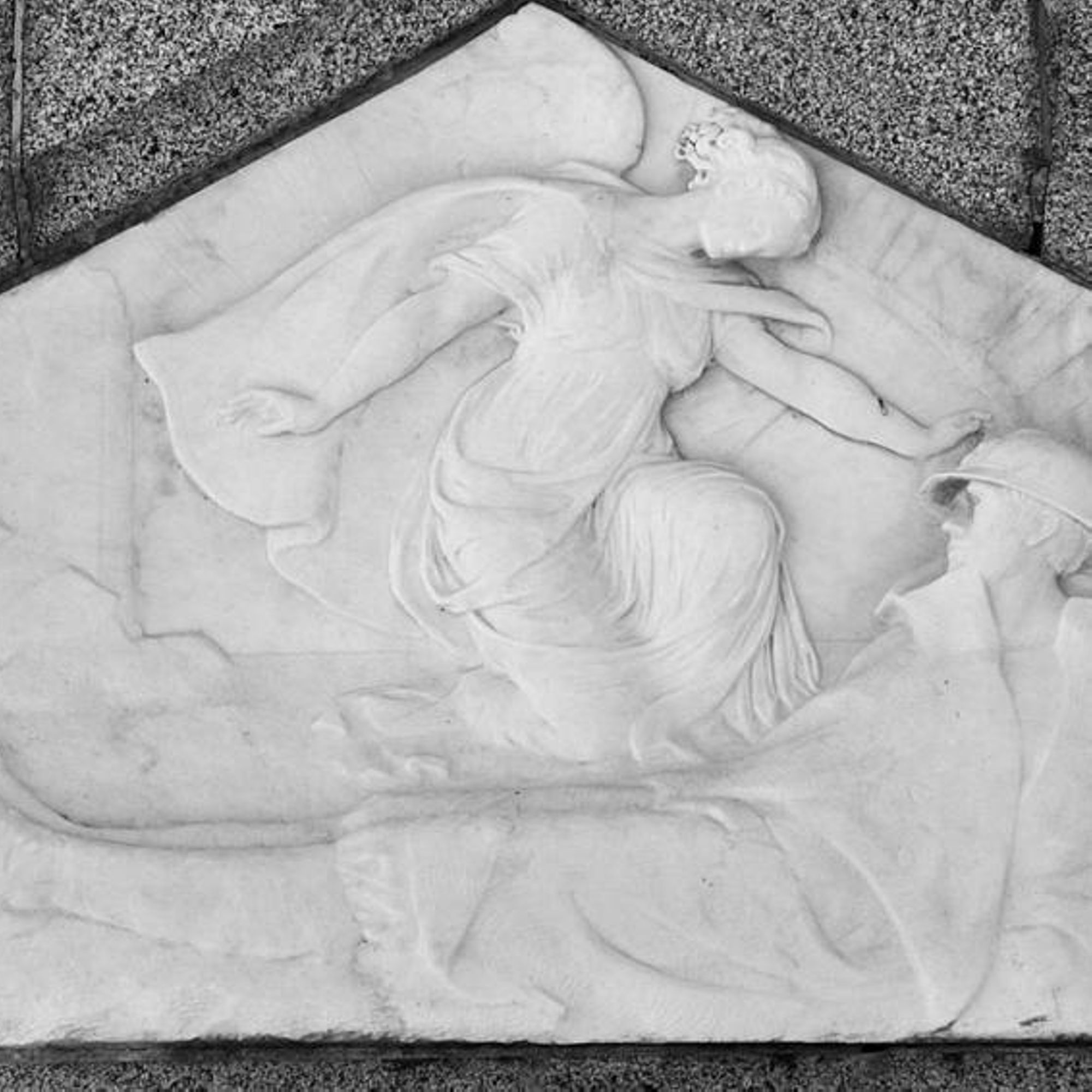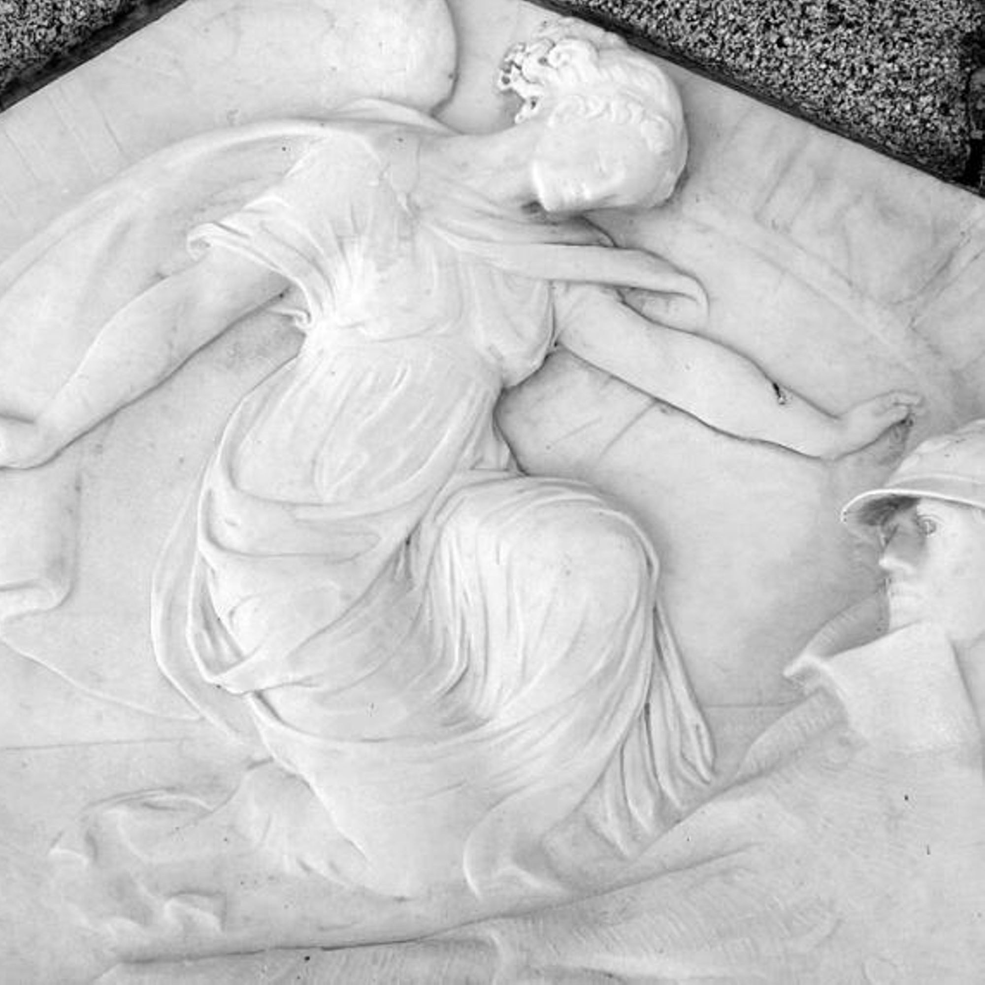 - Croix portant un Christ en métal et sous laquelle se trouve un bas relief en marbre représentant une victoire se penchant sur un soldat blessé.