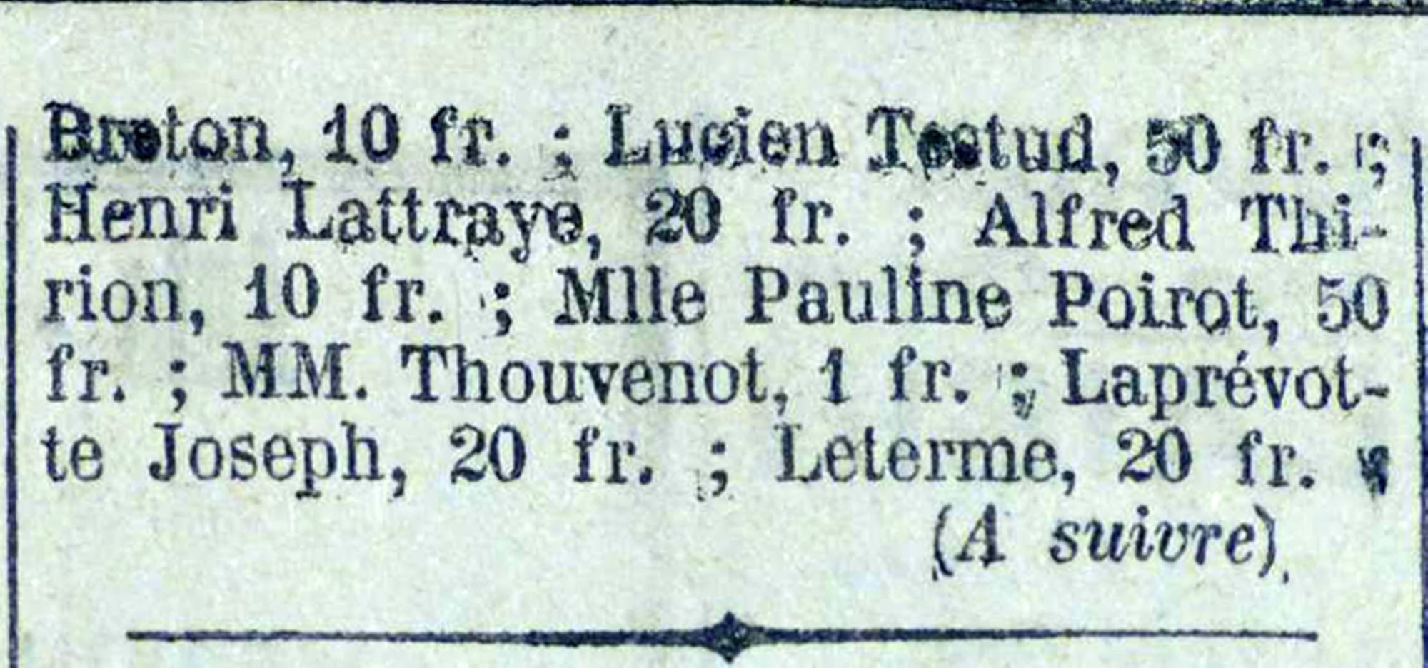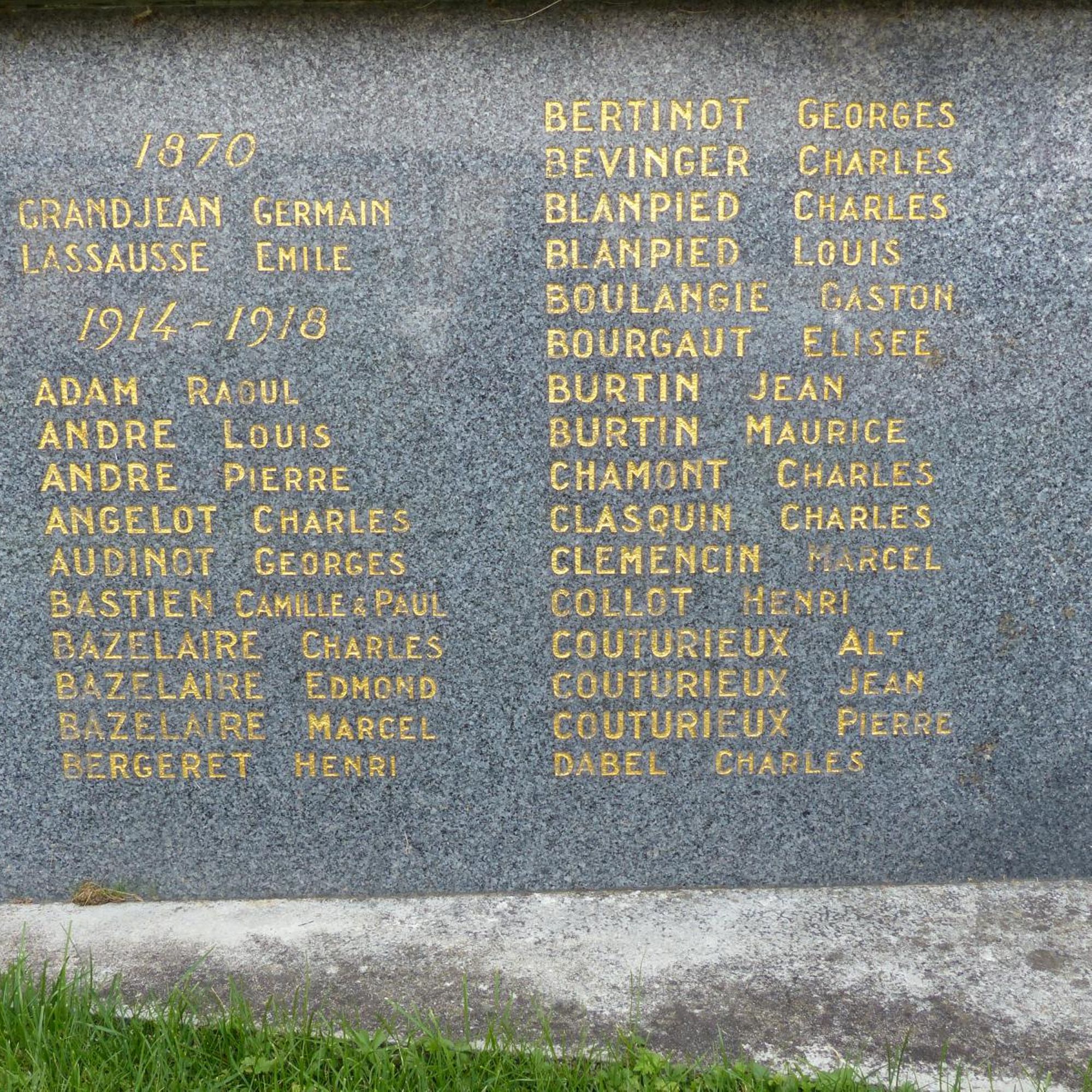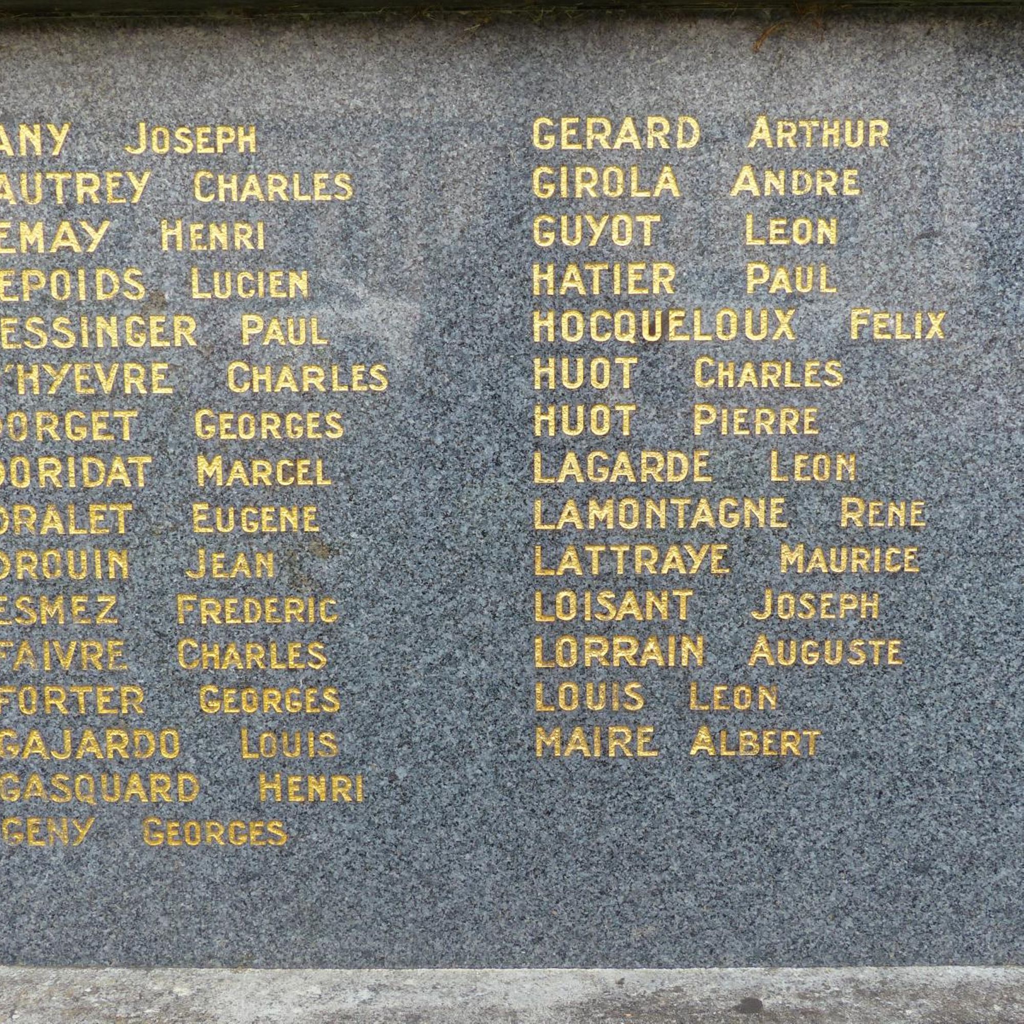 Adam Raoul. André Louis. André Pierre. Angelot Charles. Audinot Georges. Bastien Camille. Bastien Paul. Bazelaire Charles. Bazelaire Edmond. Bazelaire Marcel. Bergeret Henri. Berlinot Georges. Bevinger Charles. Blampied Charles. Blampied Louis. Boulangie Gaston. Bourgaut Elisée. Burtin Jean. Burtin Maurice. Chamont Chartes. Clasquin Charles • Clemencin Marcel. Collot Henri. Couturieux Albert. Couturieux Jean. Couturieux Pierre. Dabel Charles. Dany Joseph. Dautrey Charles. Demay Henri. Depoids Lucien. Dessinger Paul. D’Hyèvre Charles. Dorget Georges. Doridat Marcel. Dralet Eugène. Drouin Jean. Esmez Frédéric. Faivre Charles. Forter Georges. Gajardo Louis. Gasquard Henri. Geny Georges. Gérard Arthur. Girola André. Guyot Léon. Hatier Paul. Hocqueloux Félix. Huot Charles. Huot Pierre. Lagarde Léon. Lamontagne René. Lattraye Maurice. Loisant Joseph. Lorrain Auguste. Louis Léon. Maire Albert. Marotel Victor. Mathieu Charles. Meugniot Charles. Meugniot Eugène. Meyer Louis. Milot Pierre. Molard Charles. Molard Victor. Morel Camille. Morel Henri. Moyen Henri. Muller Jean. Oréal Joseph. Paquis Georges. Perrut Georges. Perry Émile. Petitjean Georges. Piernot Georges. Pierre Jules. Radigon Marcel. Remiot Louis, Robert Arthur. Roger Simon. Rousselot Gabriel, Ruer Laurent. Sellier Auguste. Simer Marius. Stin Paul. Thiaucourt André. Thomas Augustin. Thomas Étienne. Thomassin Albert. Thomassin Emmanuel. Usinier Albert. Usinier Félix. Vautard Paul. Vautard Pierre. Vincent Paul. Vineux Maurice, Visery Eugène. Voirin Paul. Yègre Eugène.