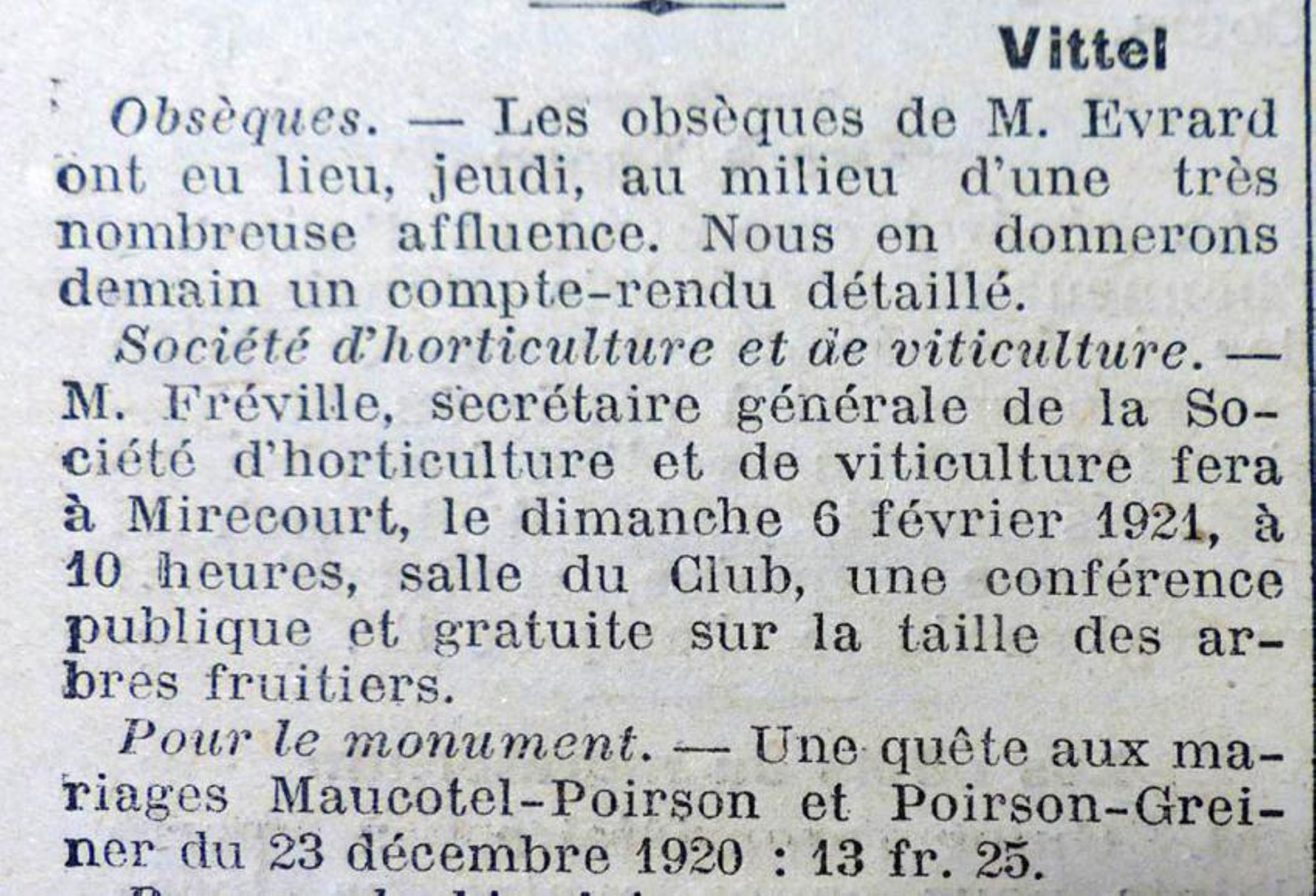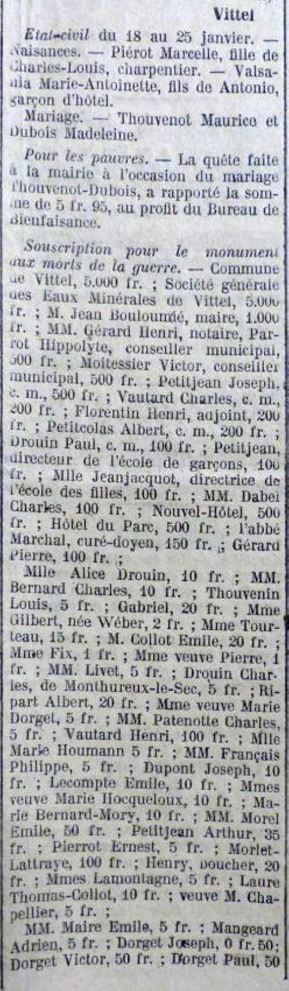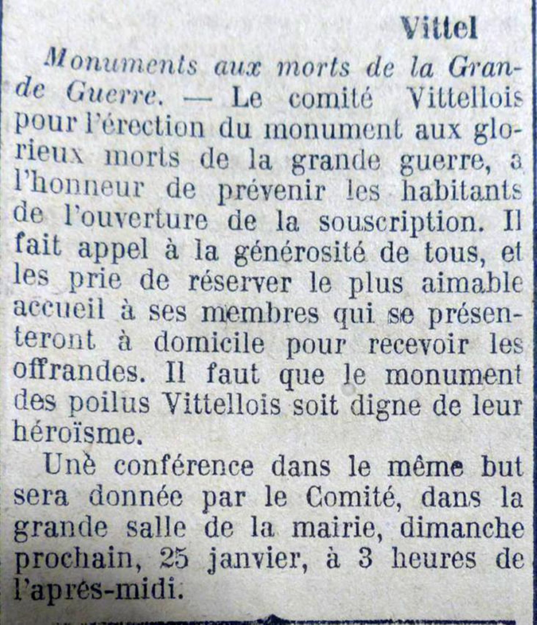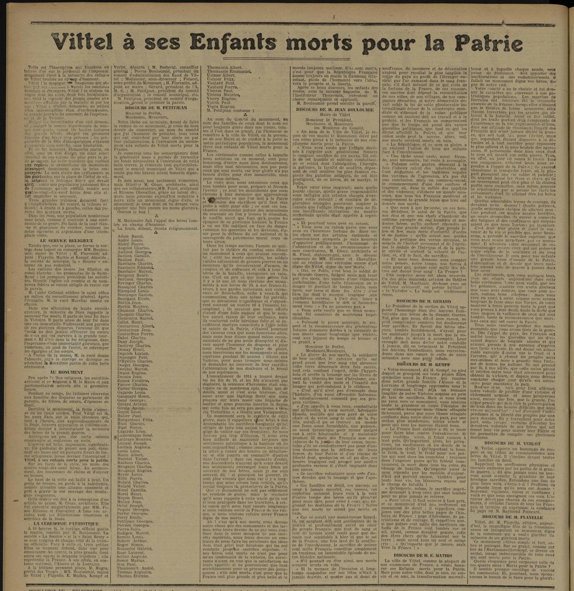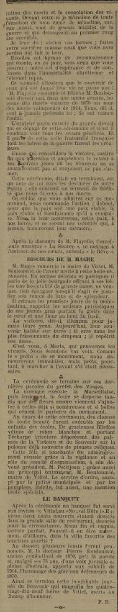 Vittel, dit M. Flayelle, célèbre, aujourd’hui, la magnifique fête de la reconnaissance en inaugurant ce monument digne de la commune qui a voulu glorifier la mémoire de ses glorieux morts.