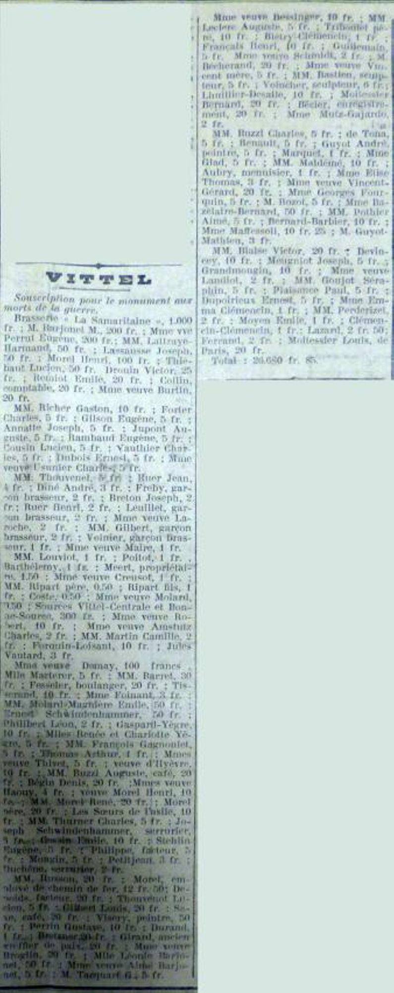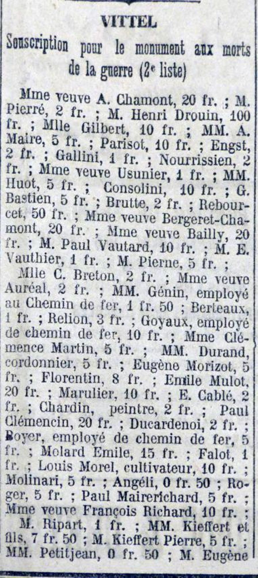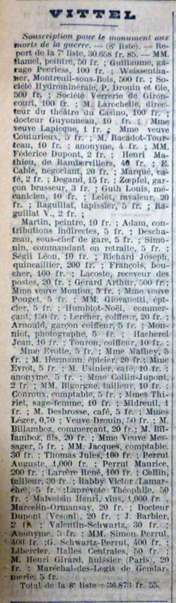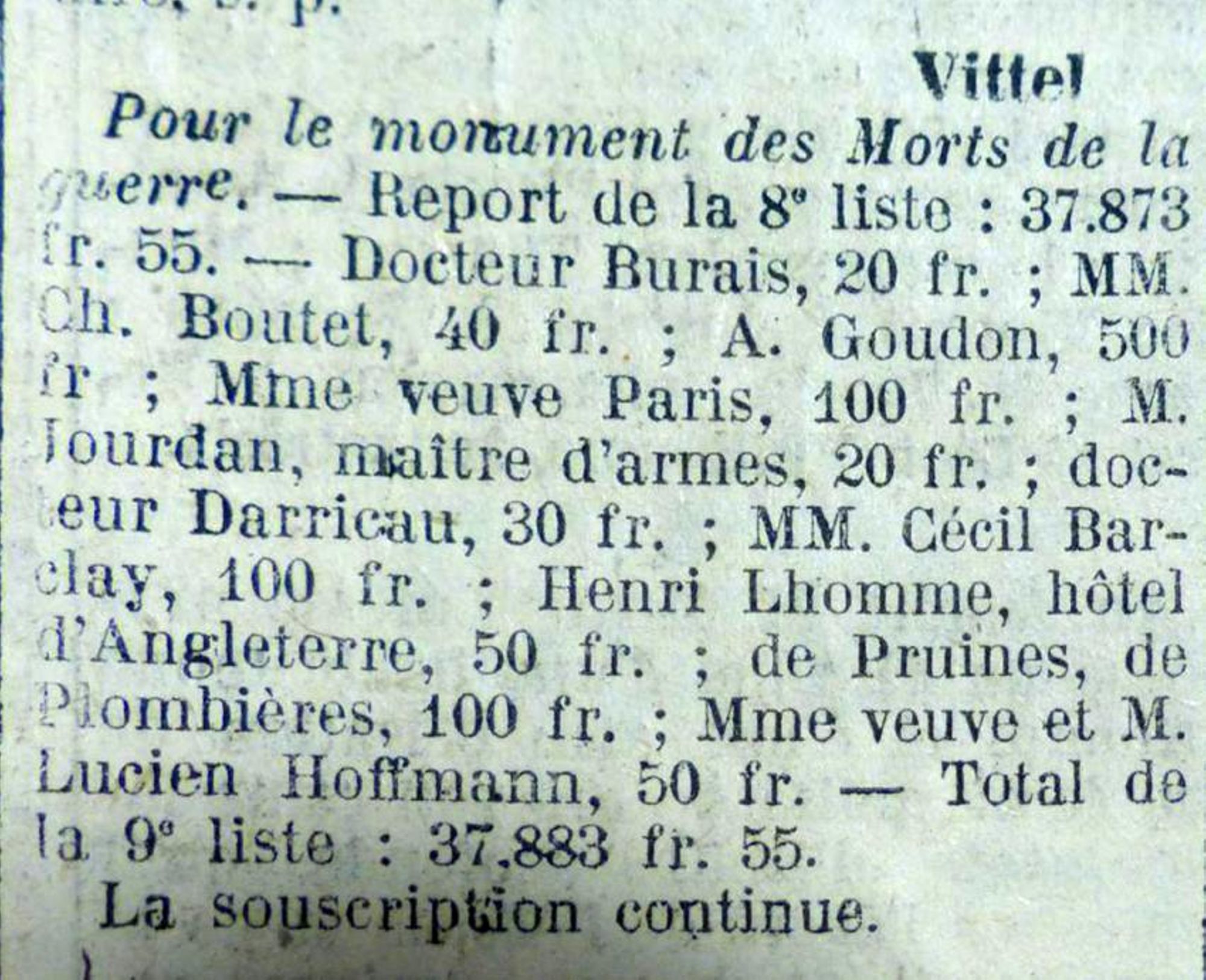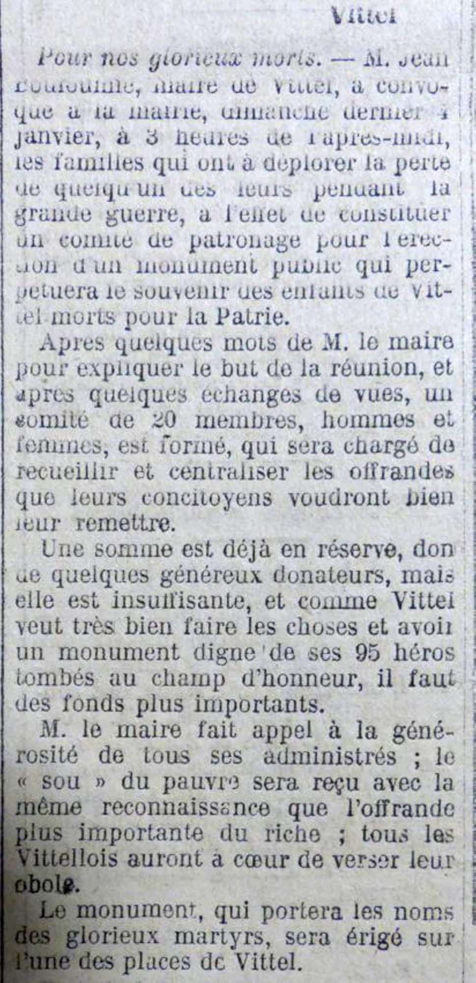 Je remercie tous les souscripteurs dont la générosité nous a permis de recueillir les fonds nécessaires à l’exécution de cette belle œuvre, je remercie tout particulièrement le conseil municipal de Vittel qui a voulu que nos braves soient honorés dignement.