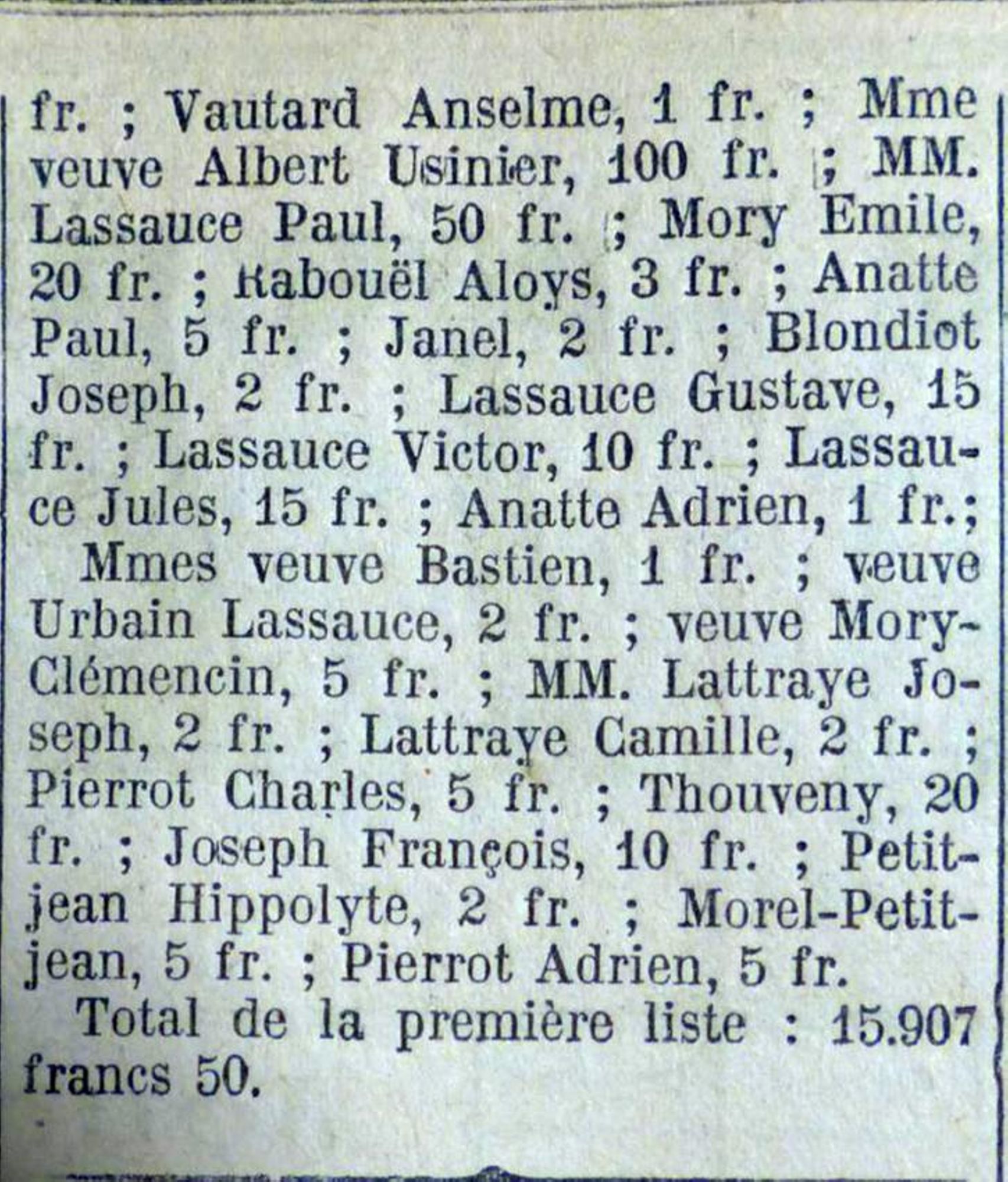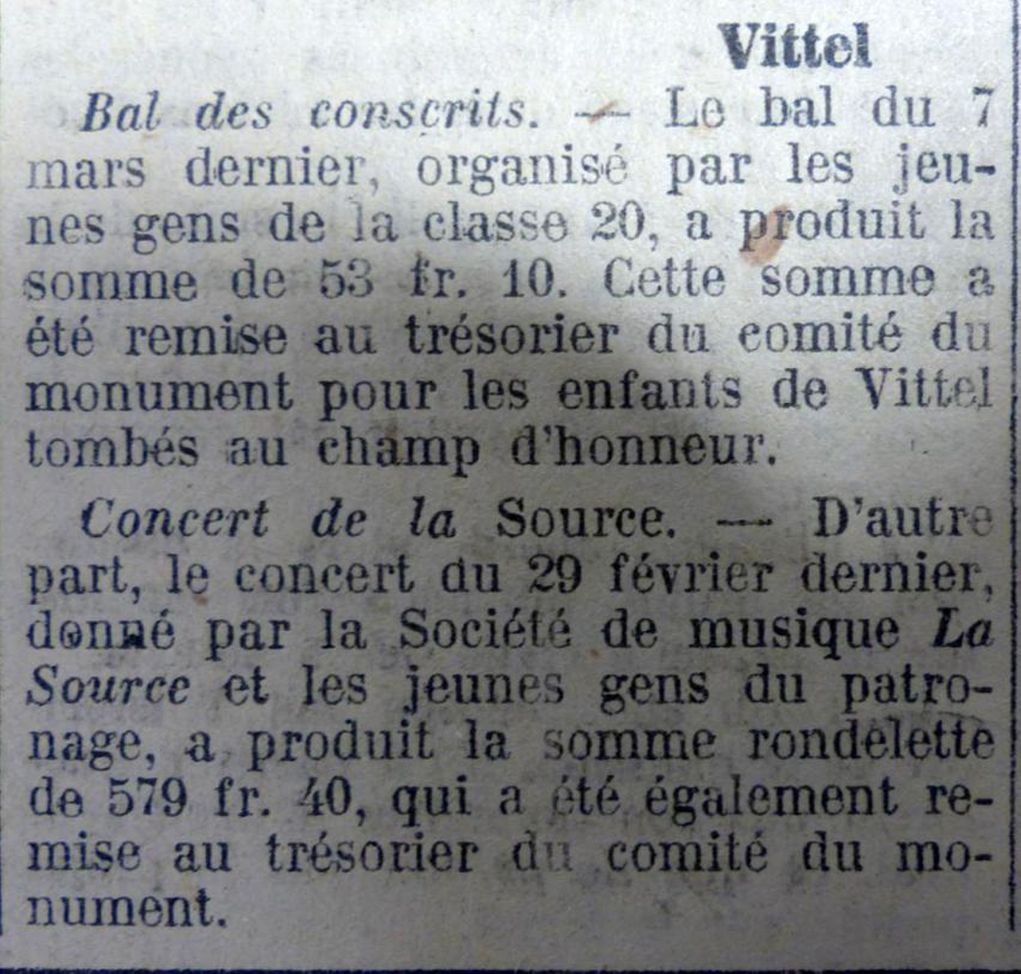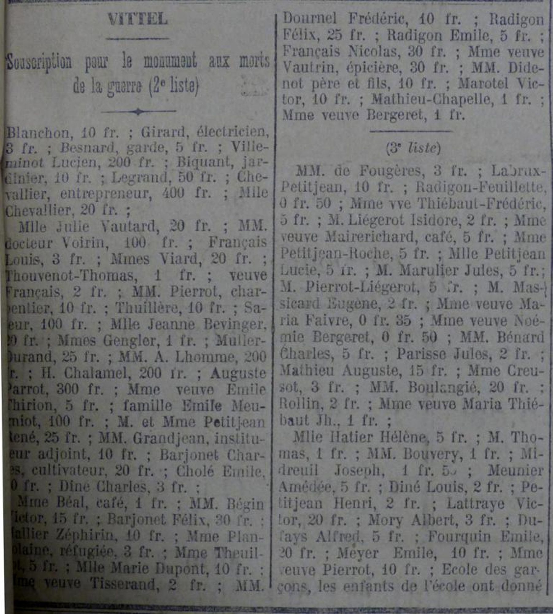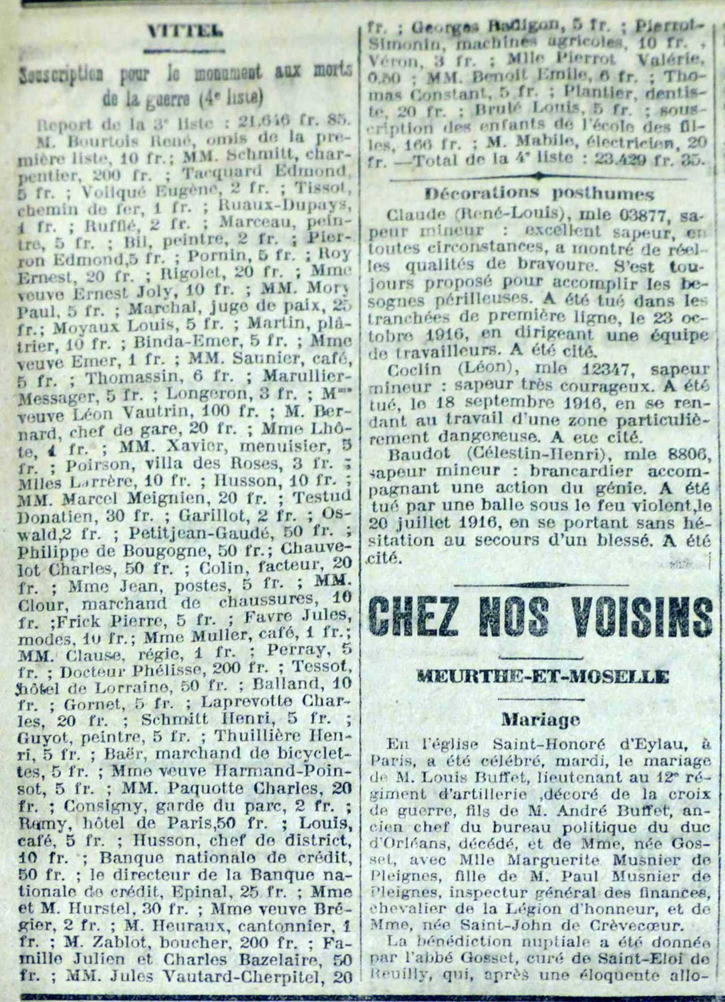 Je remercie tous les souscripteurs dont la générosité nous a permis de recueillir les fonds nécessaires à l’exécution de cette belle œuvre, je remercie tout particulièrement le conseil municipal de Vittel qui a voulu que nos braves soient honorés dignement.