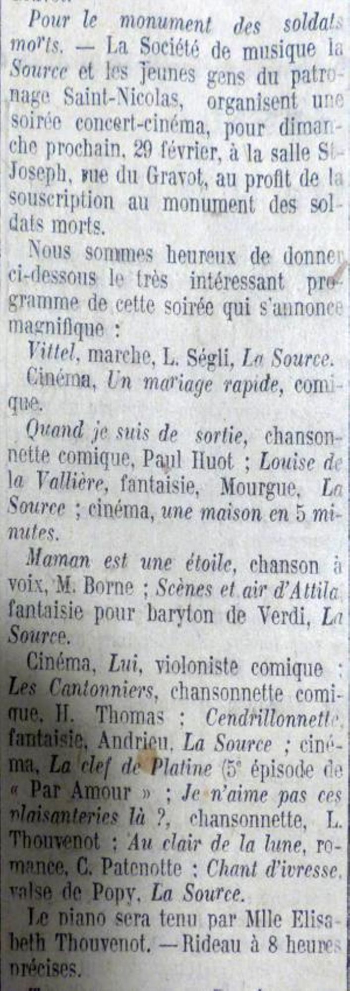 Une surprise nous est alors réservée. Un des plus éminents artistes du théâtre de Vittel, M. Montlouis, déclame avec un réalisme saisissant, un poème intitulé : « la Victoire ». La foule est visiblement émue.