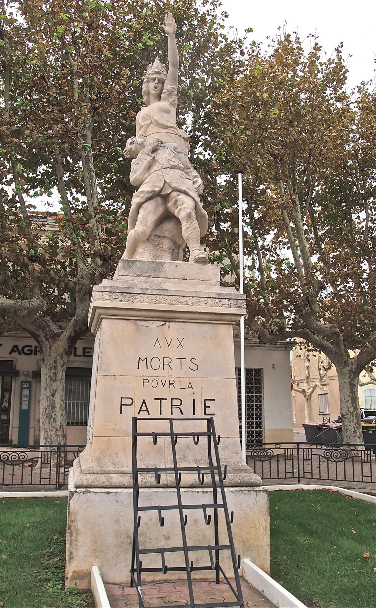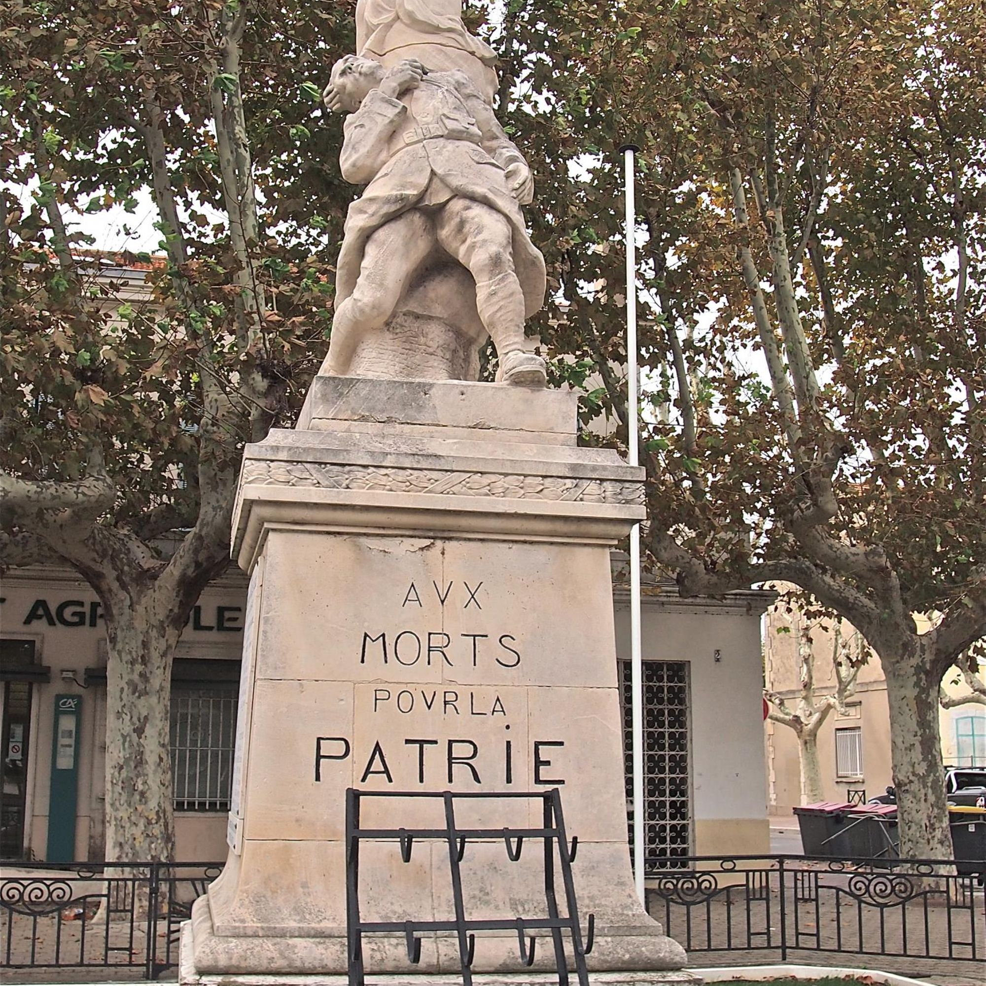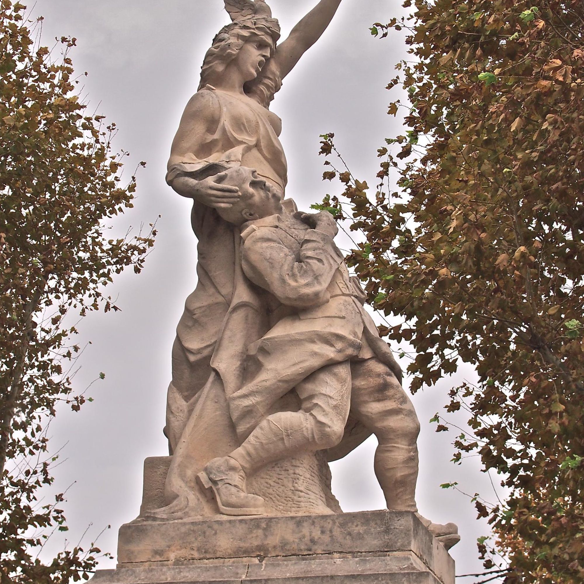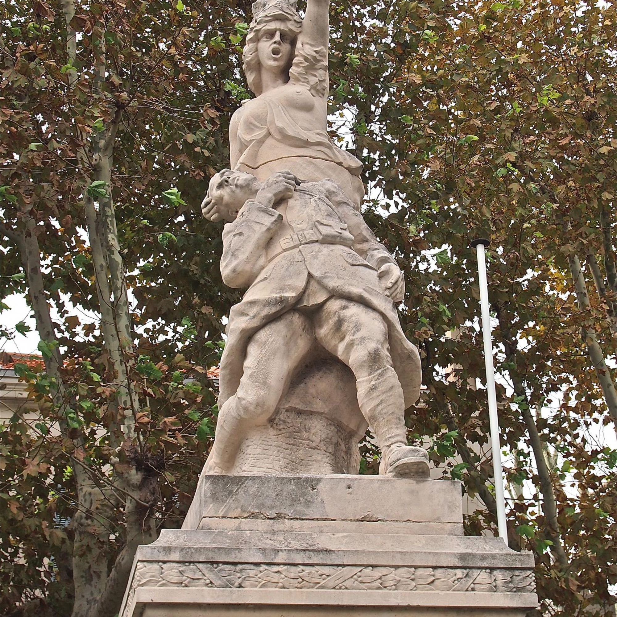 Ce monument représente la Figure "conventionnelle" de la République retenant dans son bras un soldat grèvement blessé tandisqu'elle lève son bras gauche, la main pomme ouverte face à l"ennemi", semblant l' exhorter à l'arrêt du combat.